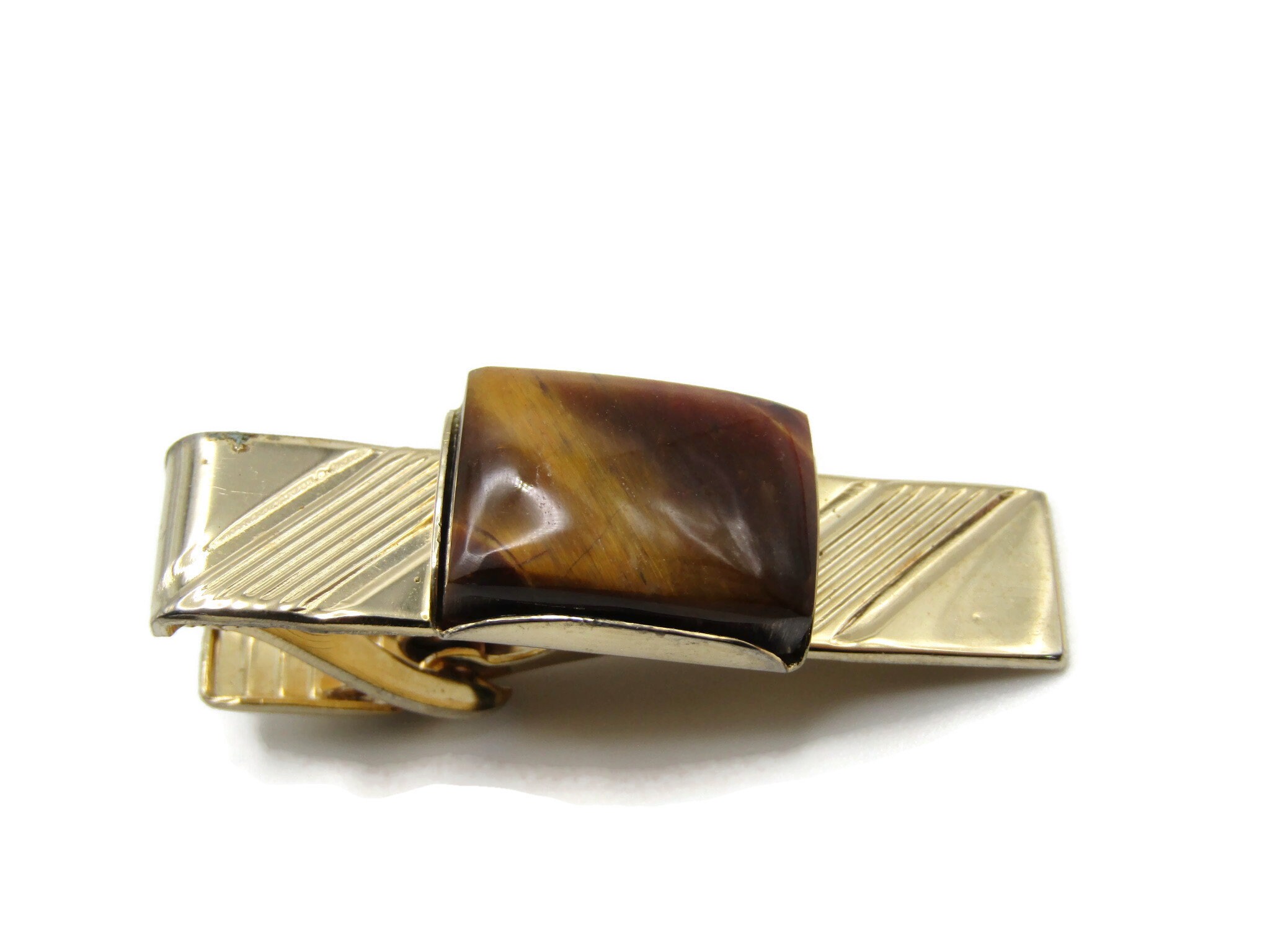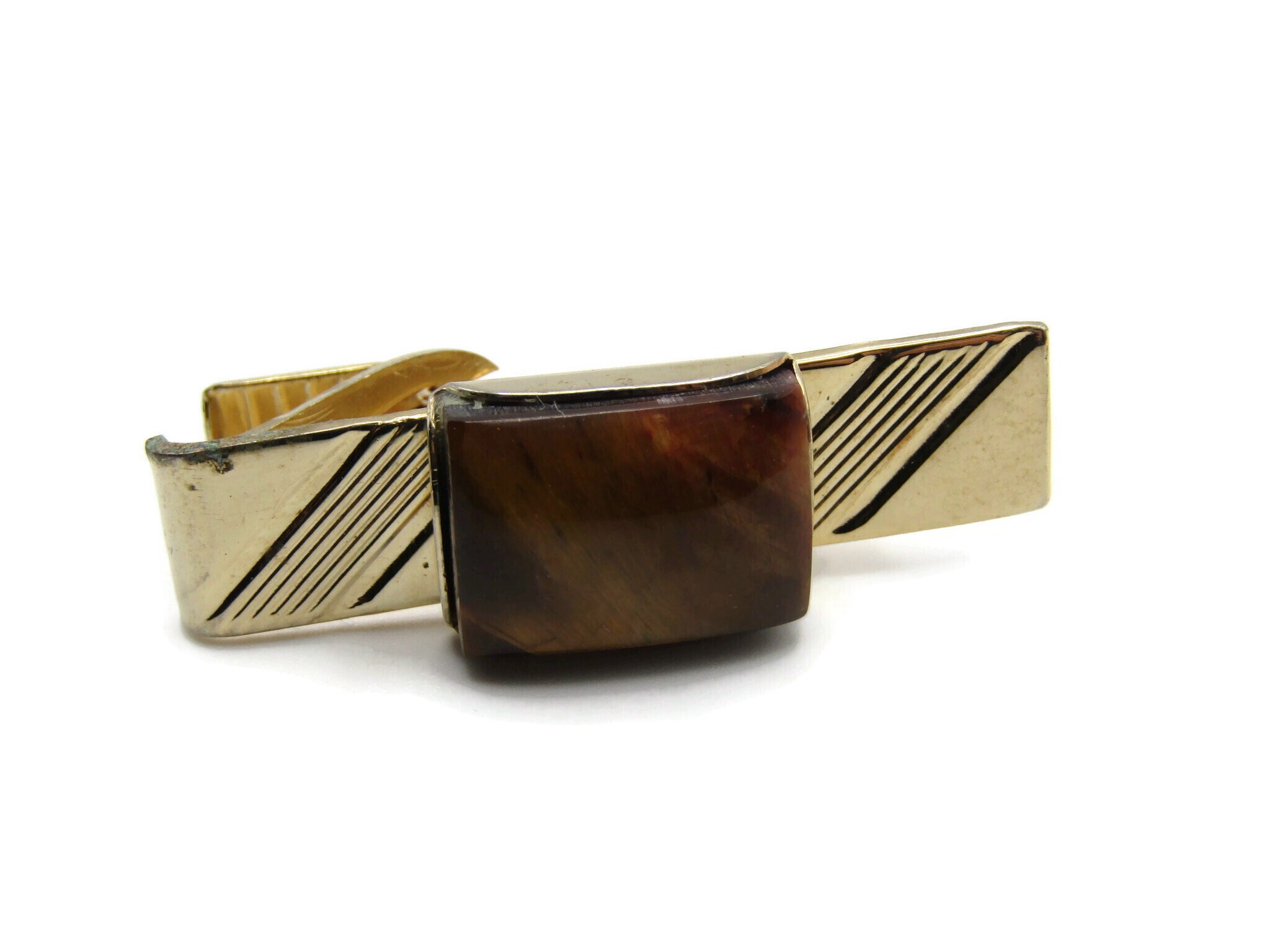Brown Stone Centered Inlay Diagonal Etching Gold Tone Modernist Tie Clip Tie Bar Men's Jewelry