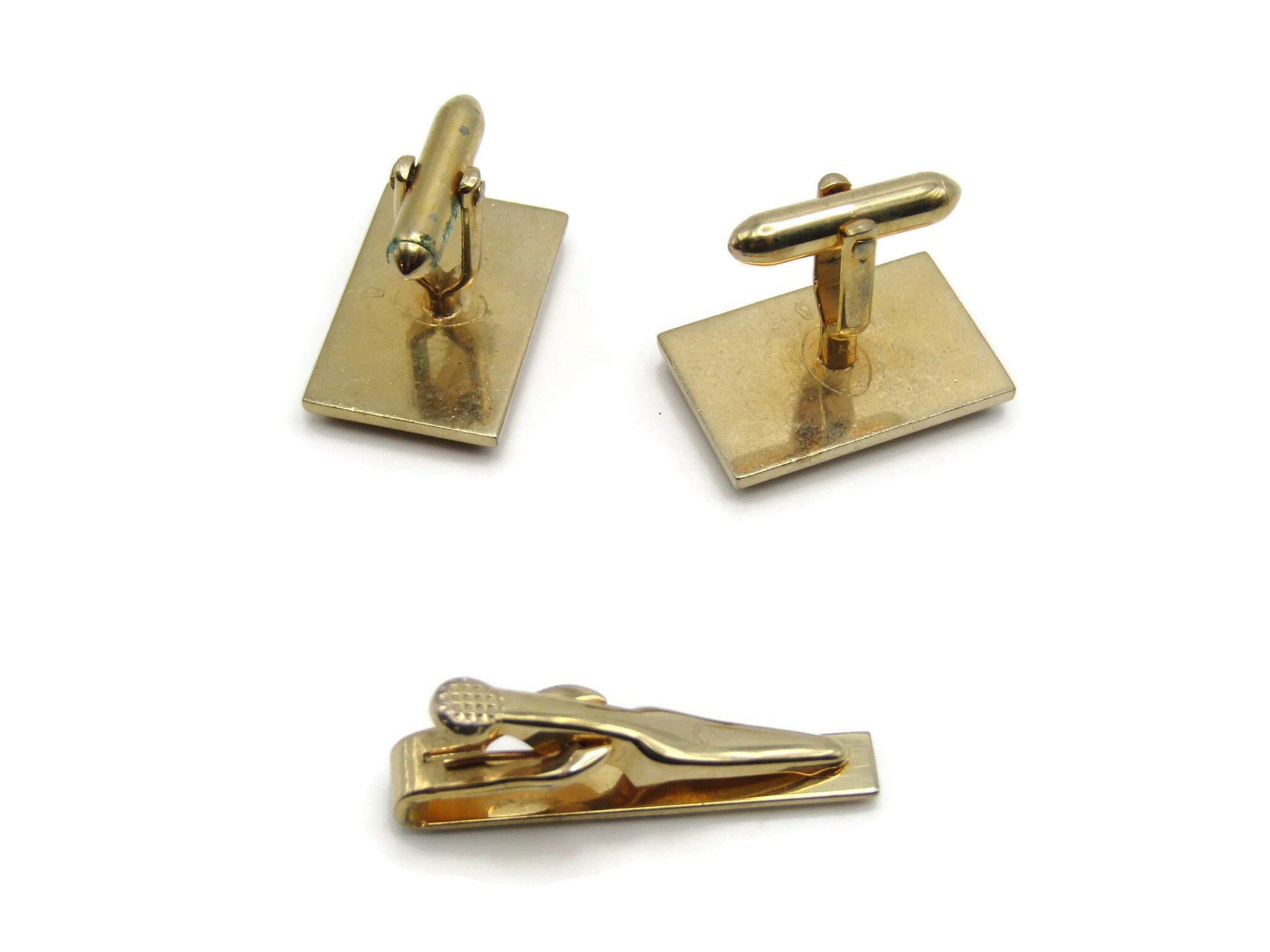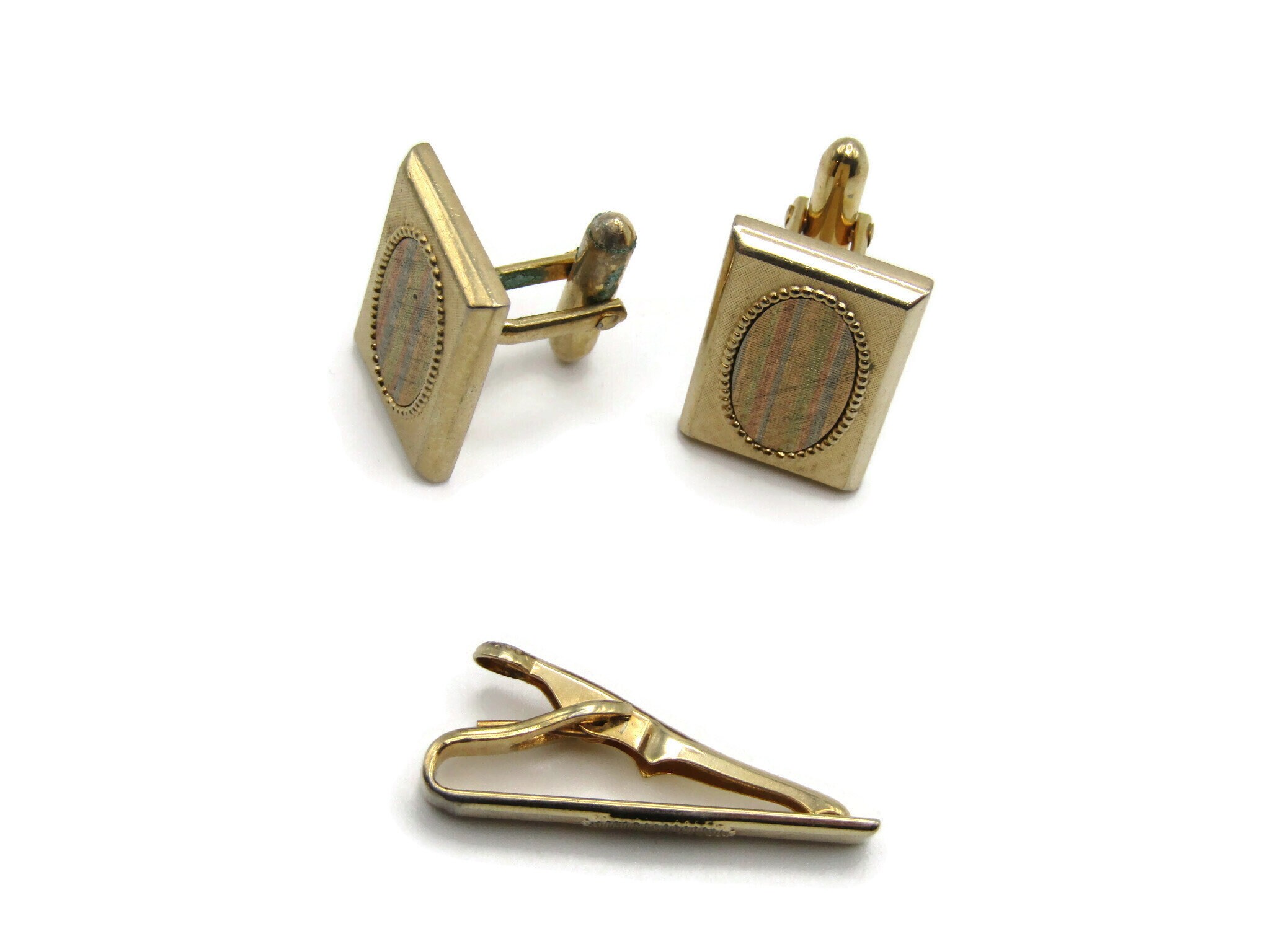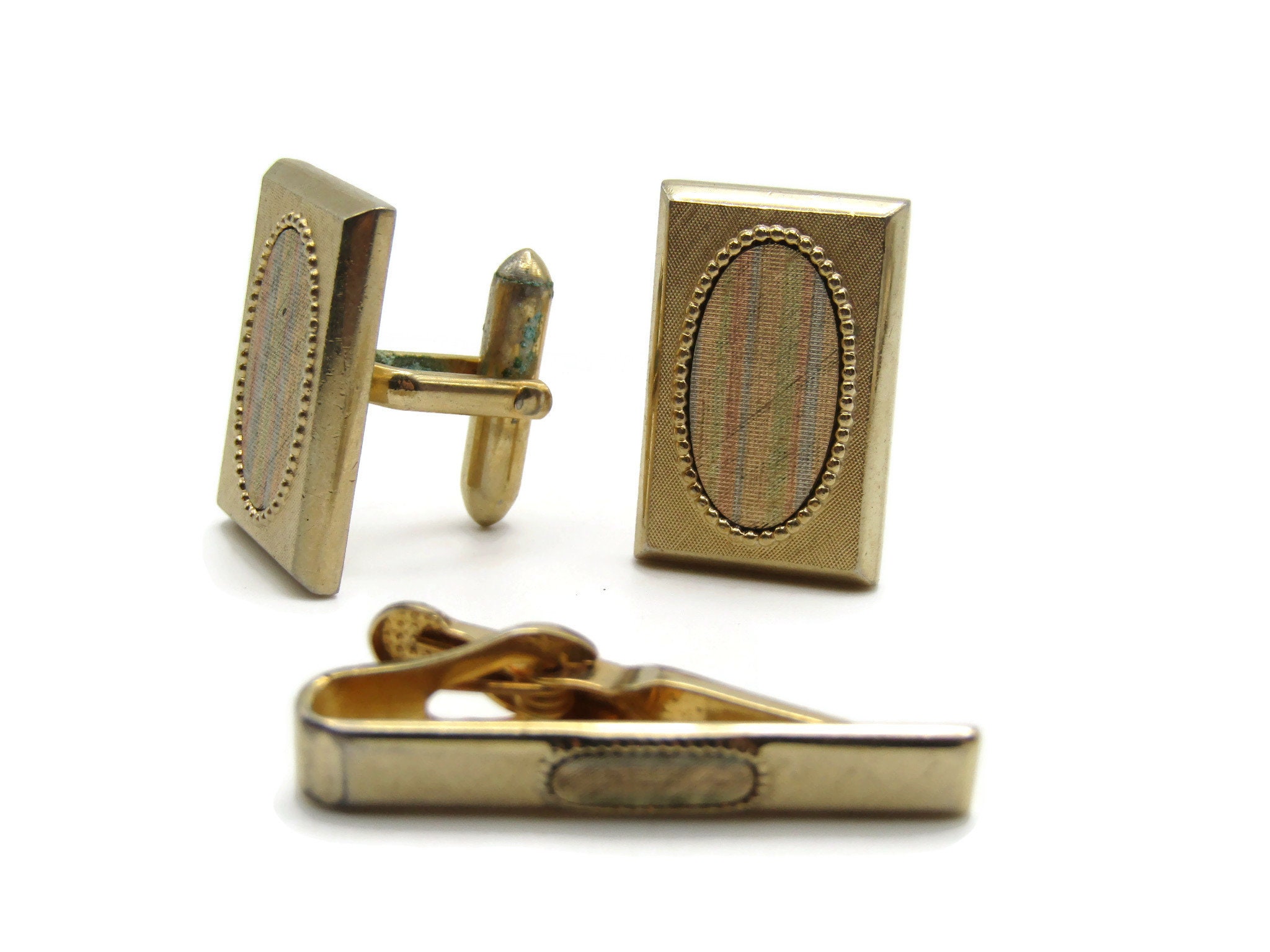 Vintage Men's Jewelry Set: Tie Bar Cufflinks Textured Oval Design Gold Tone