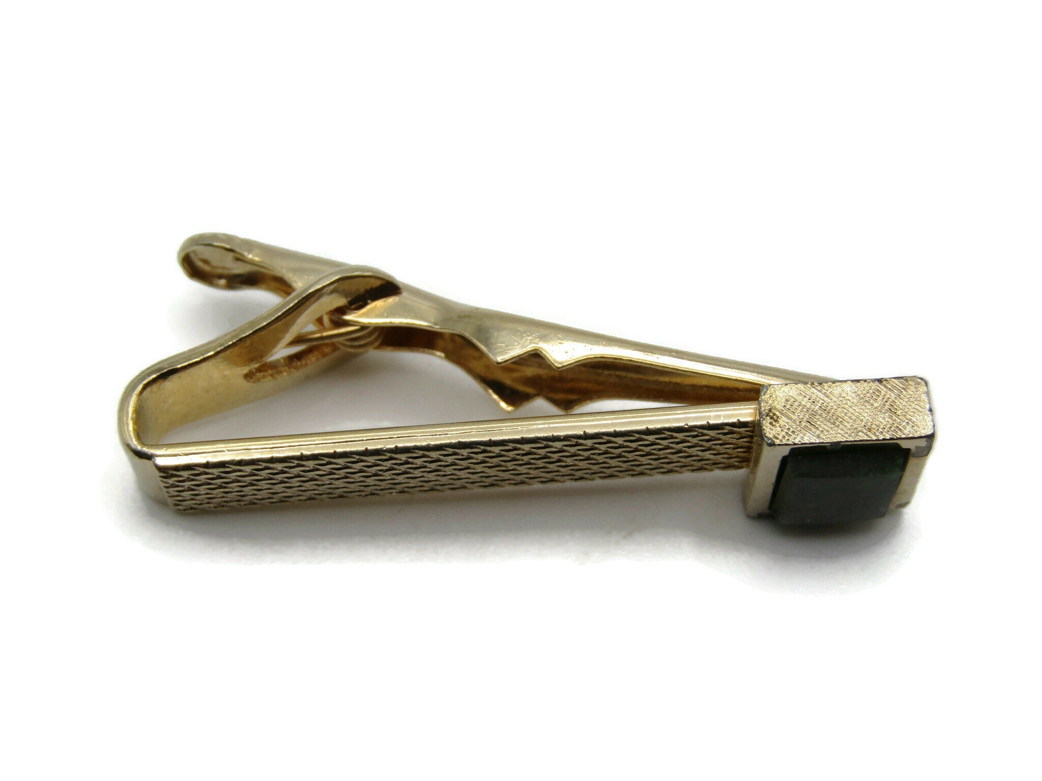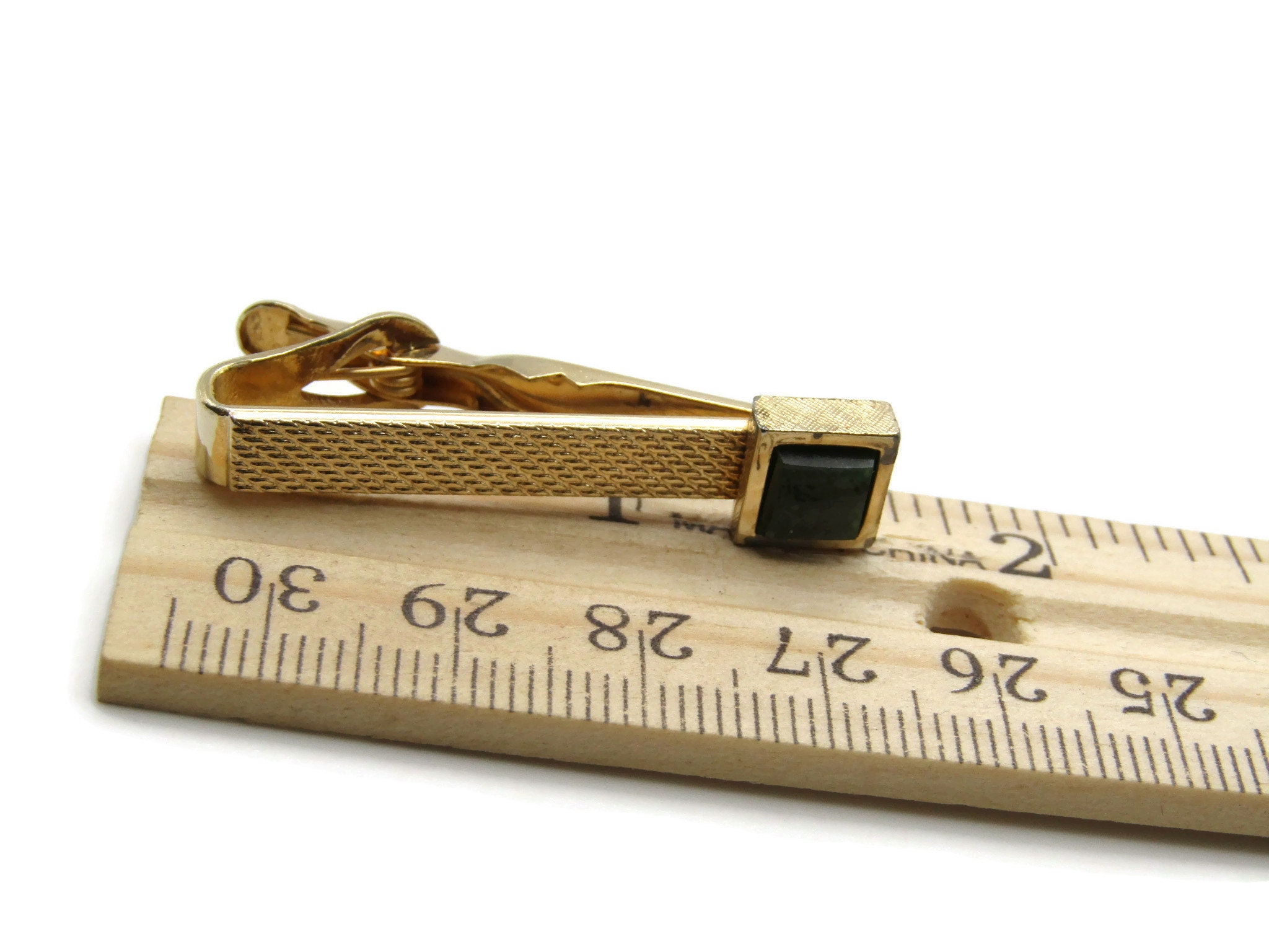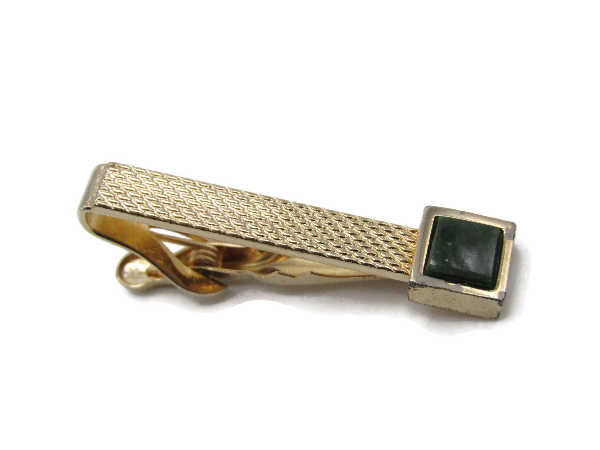 Green Stone Inlay Textured Gold Tone Tie Bar Tie Clip Men's Jewelry