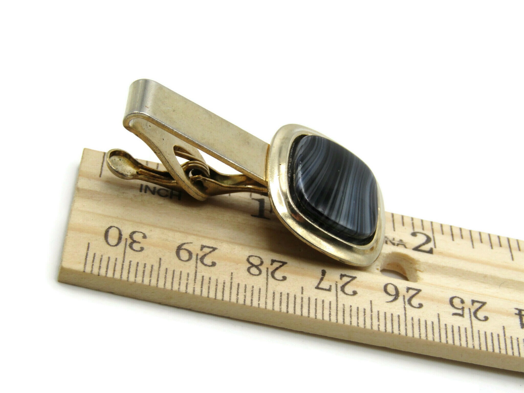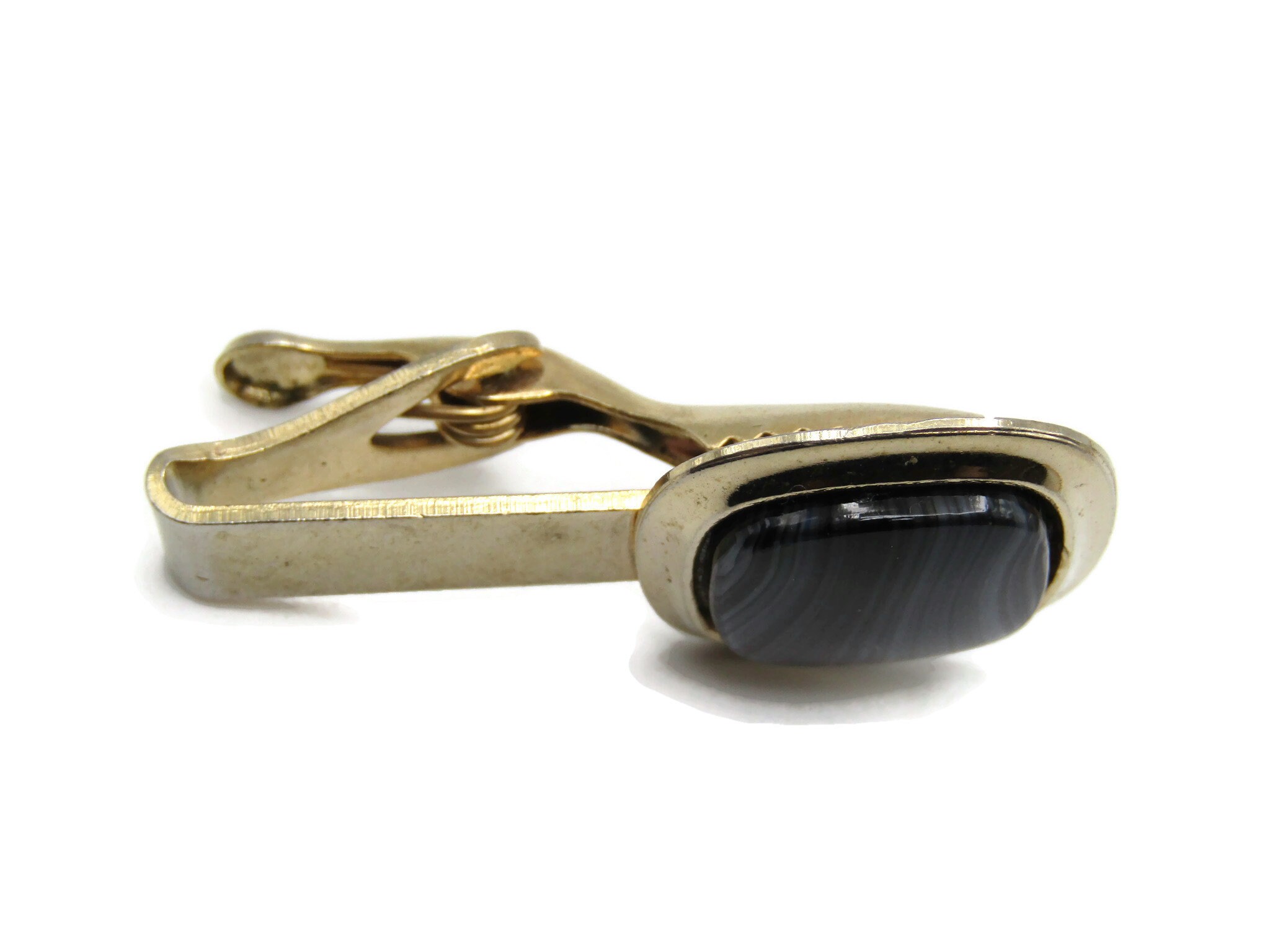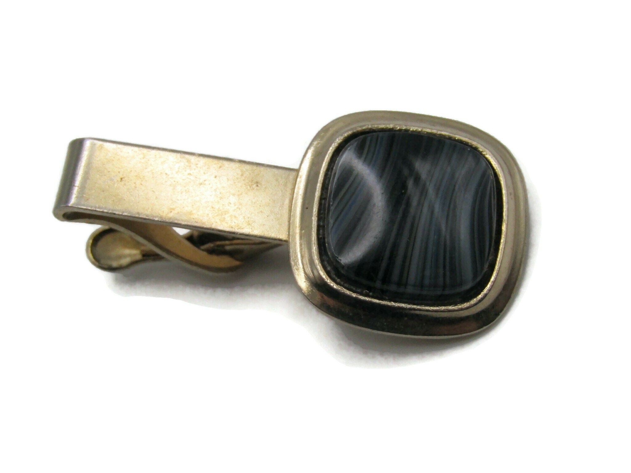 Black Grey Swirl Stone Inlay Smooth Finish Tie Clip Gold Tone Tie Bar Men's Jewelry