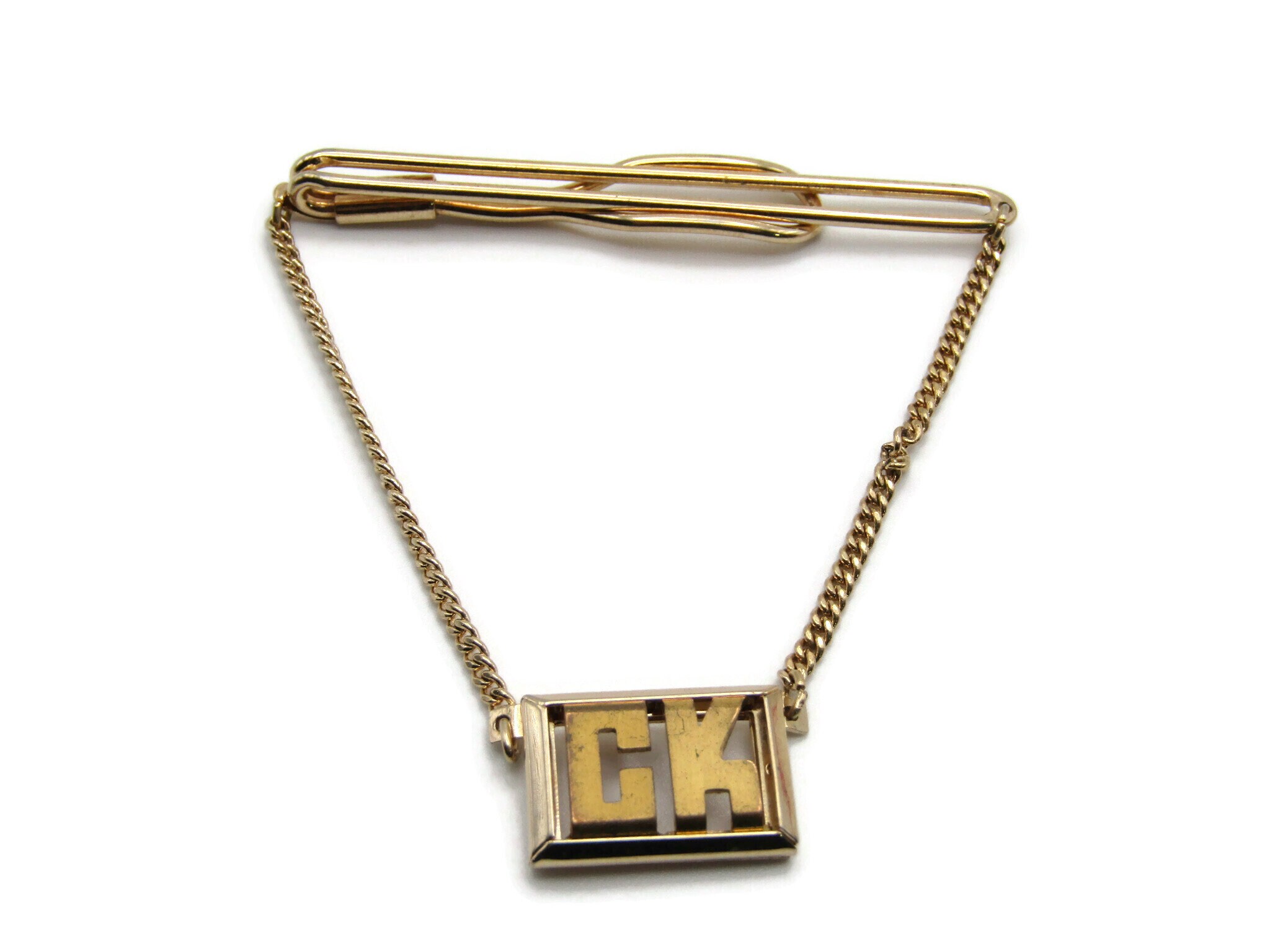 CK Initials Block Letters Monogram Tie Chain Gold Tone OPen Body Tie Clip Men's Jewelry