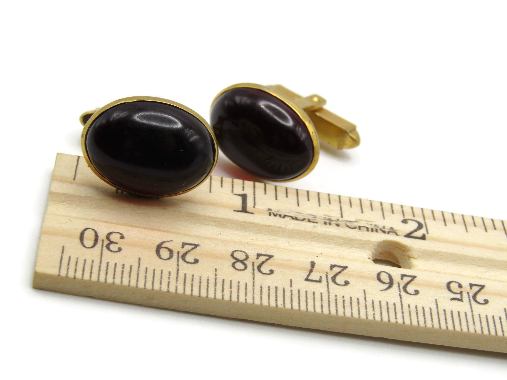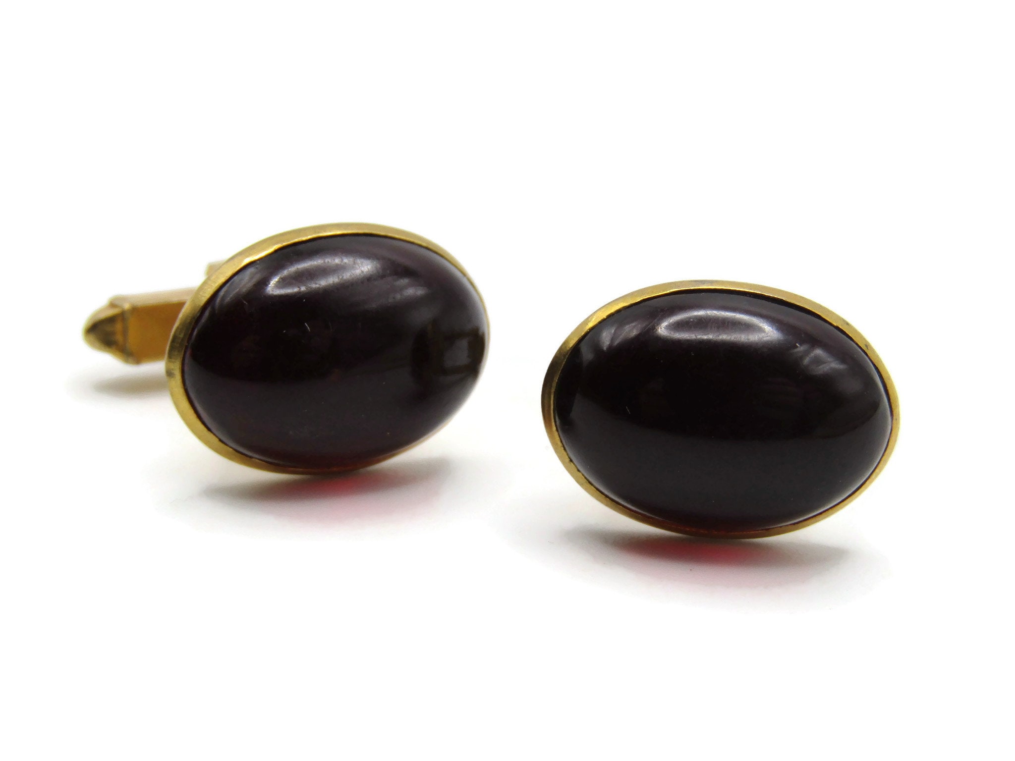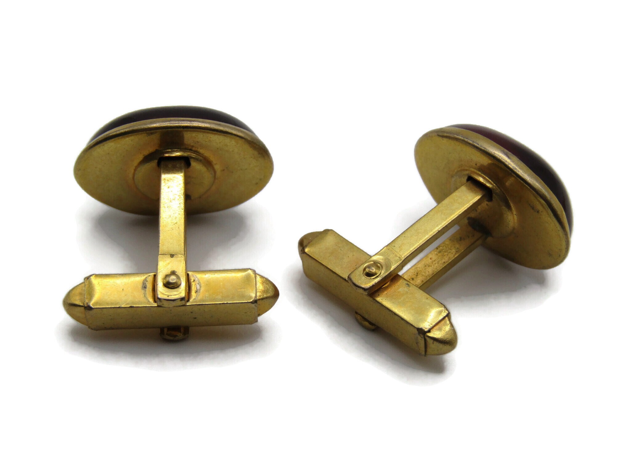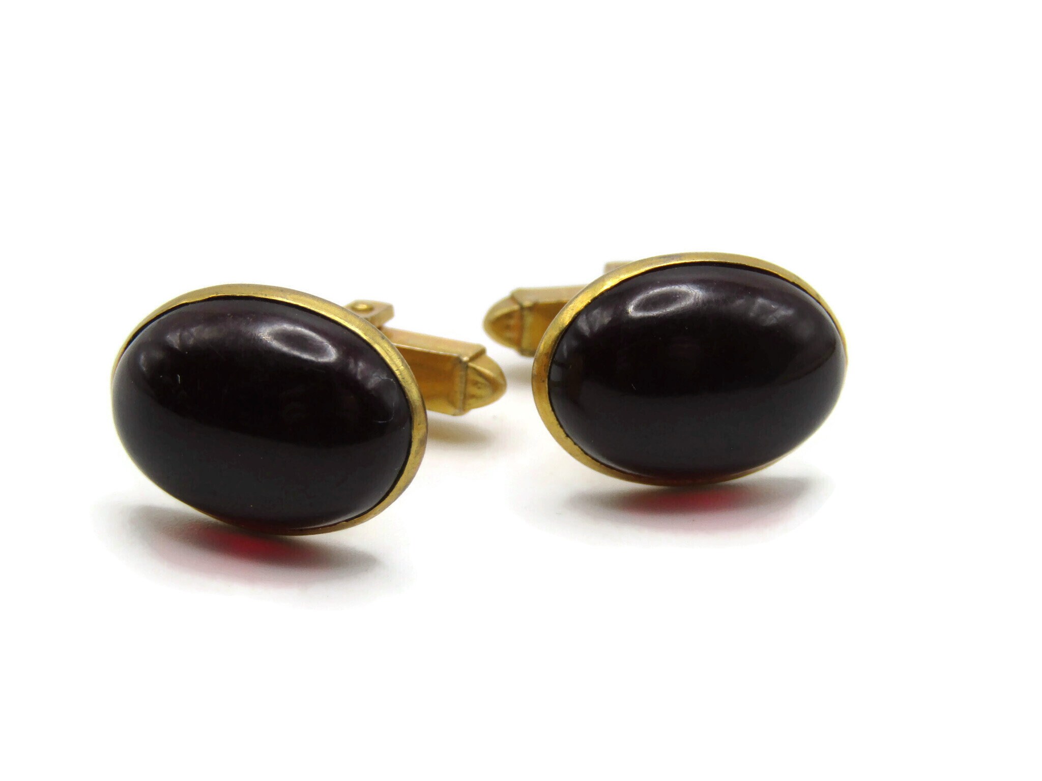 Vintage Cufflinks for Men: Deep Red Oval Stone Inlay Gold Tone