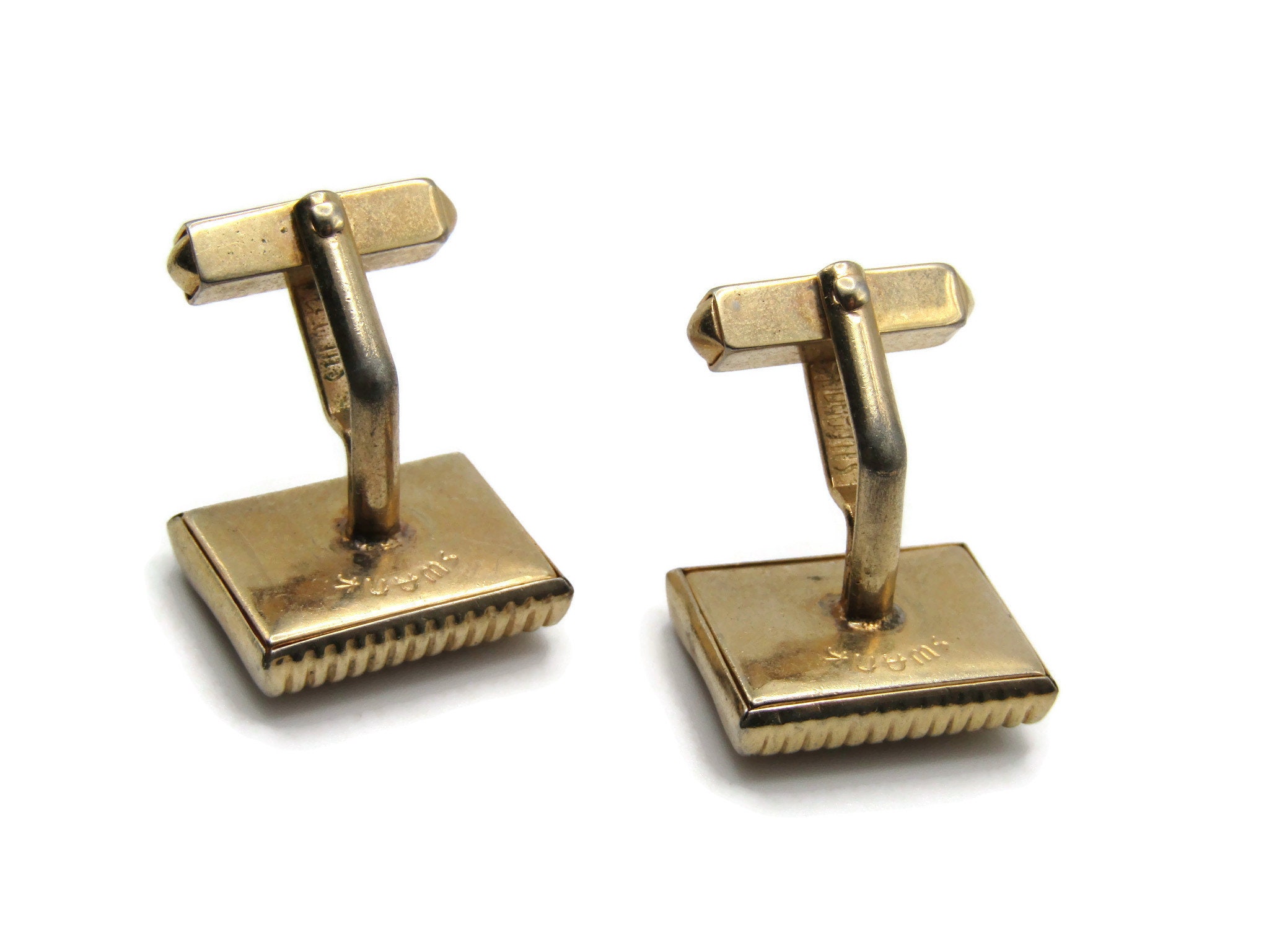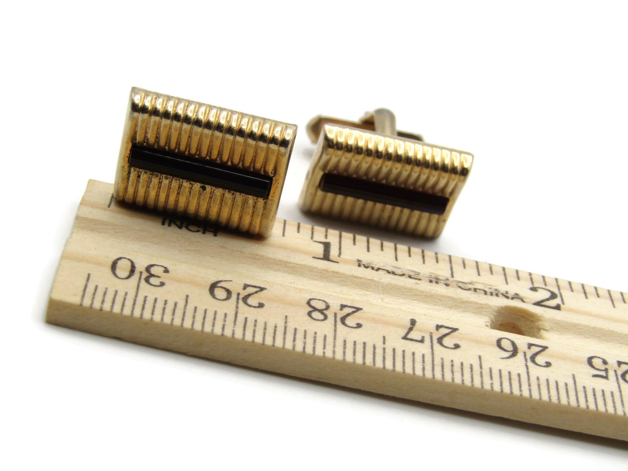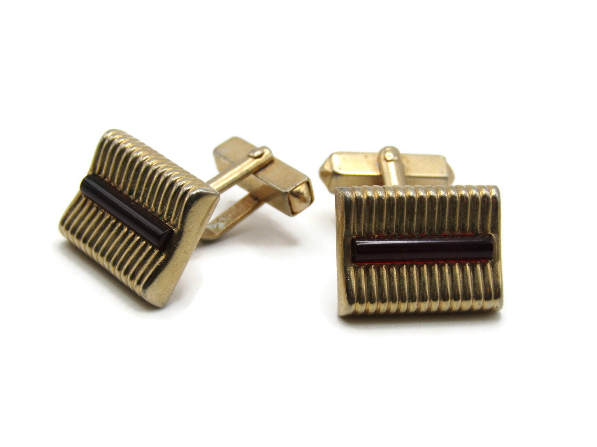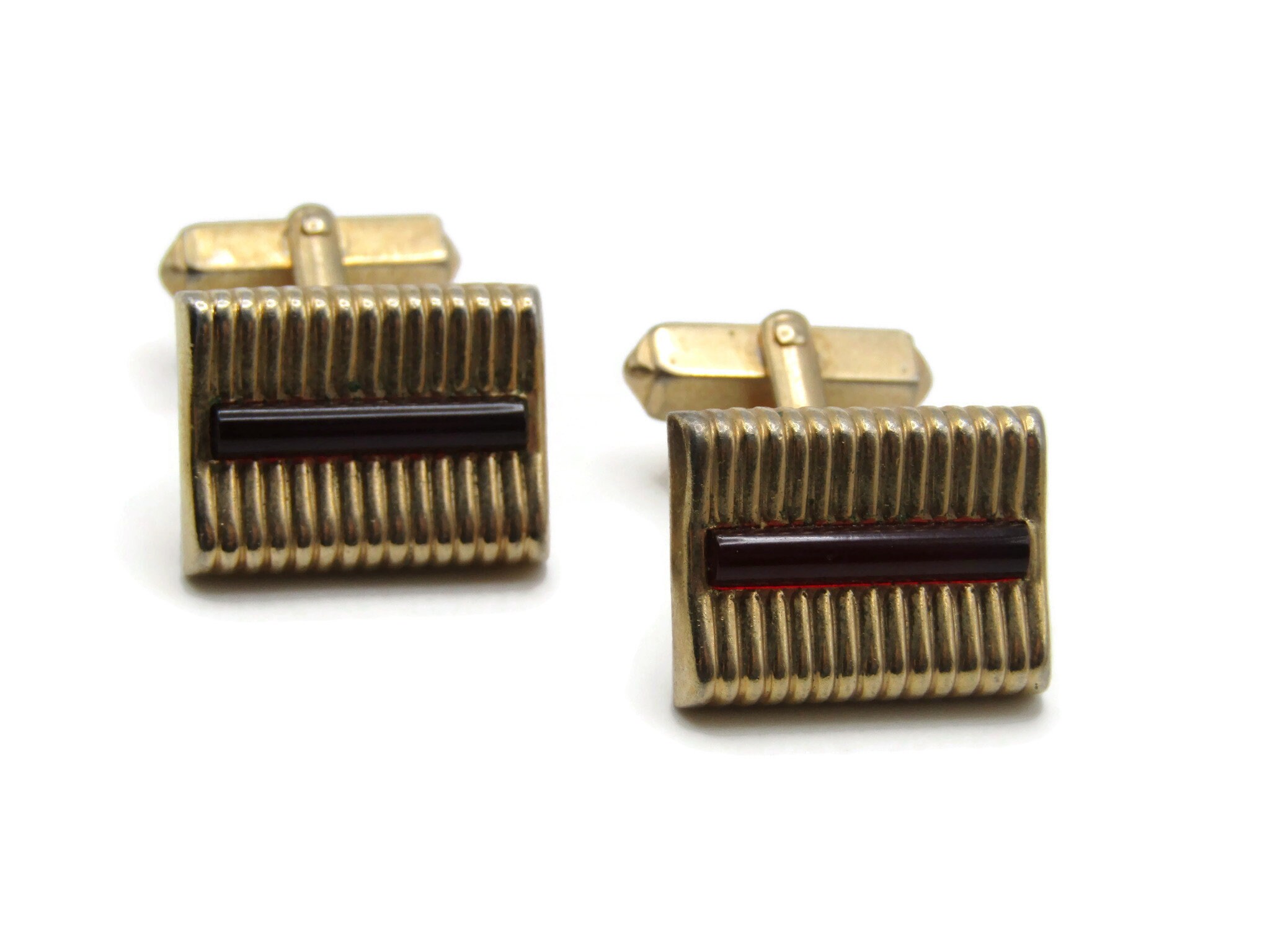 Vintage Cufflinks for Men: Verticle Stripe and Horizontal Deep Red Stone Inlay Gold Tone