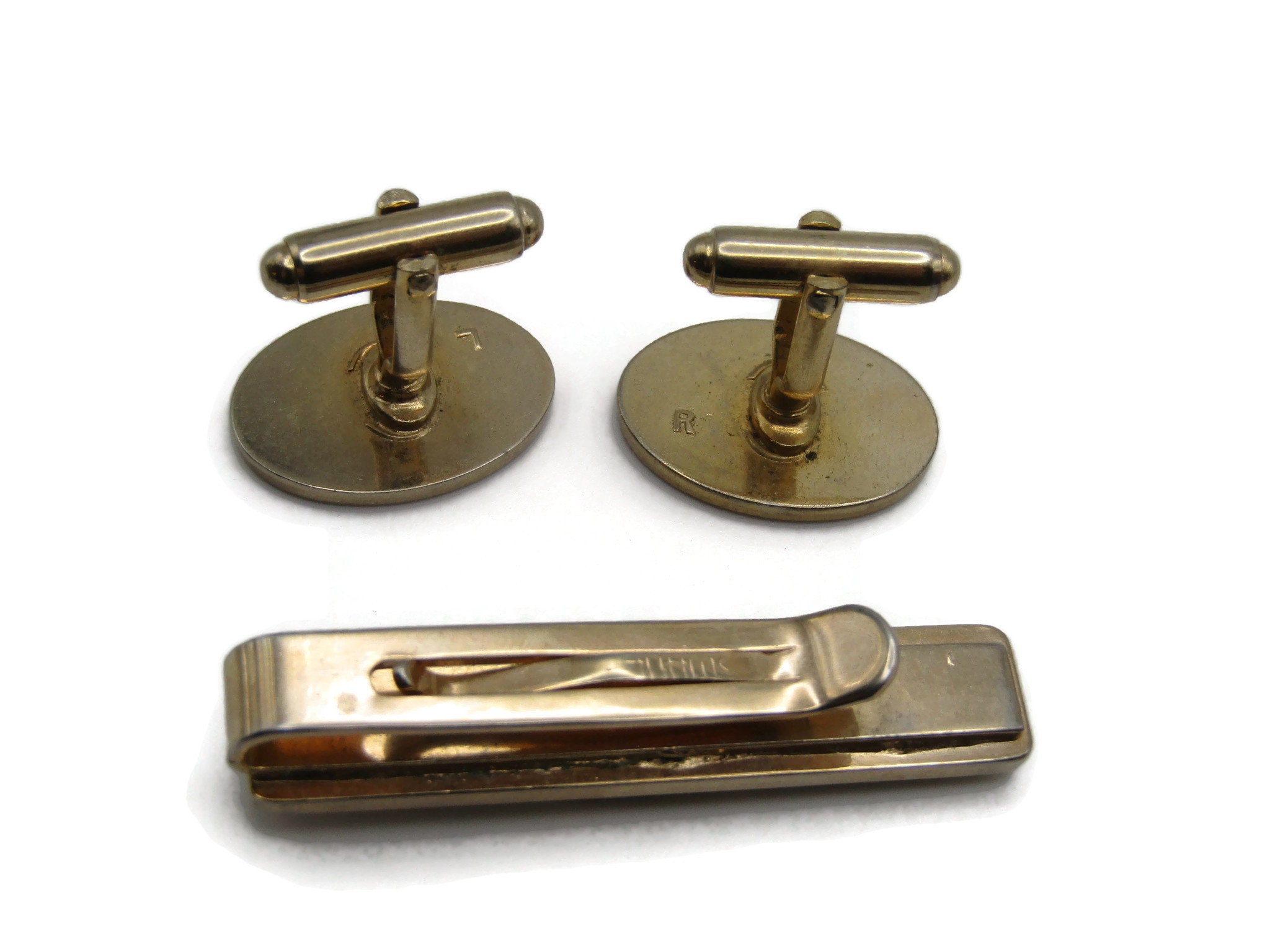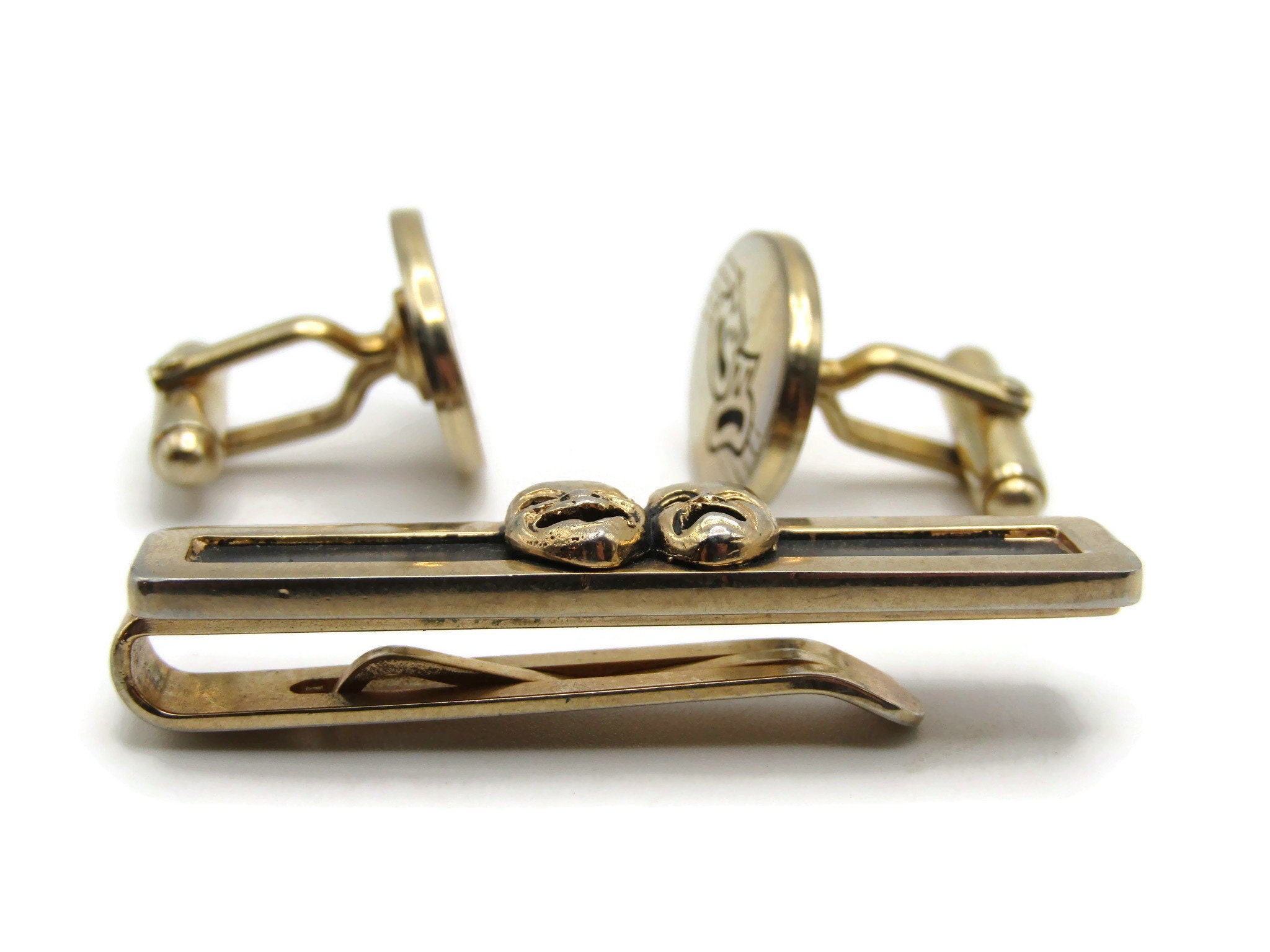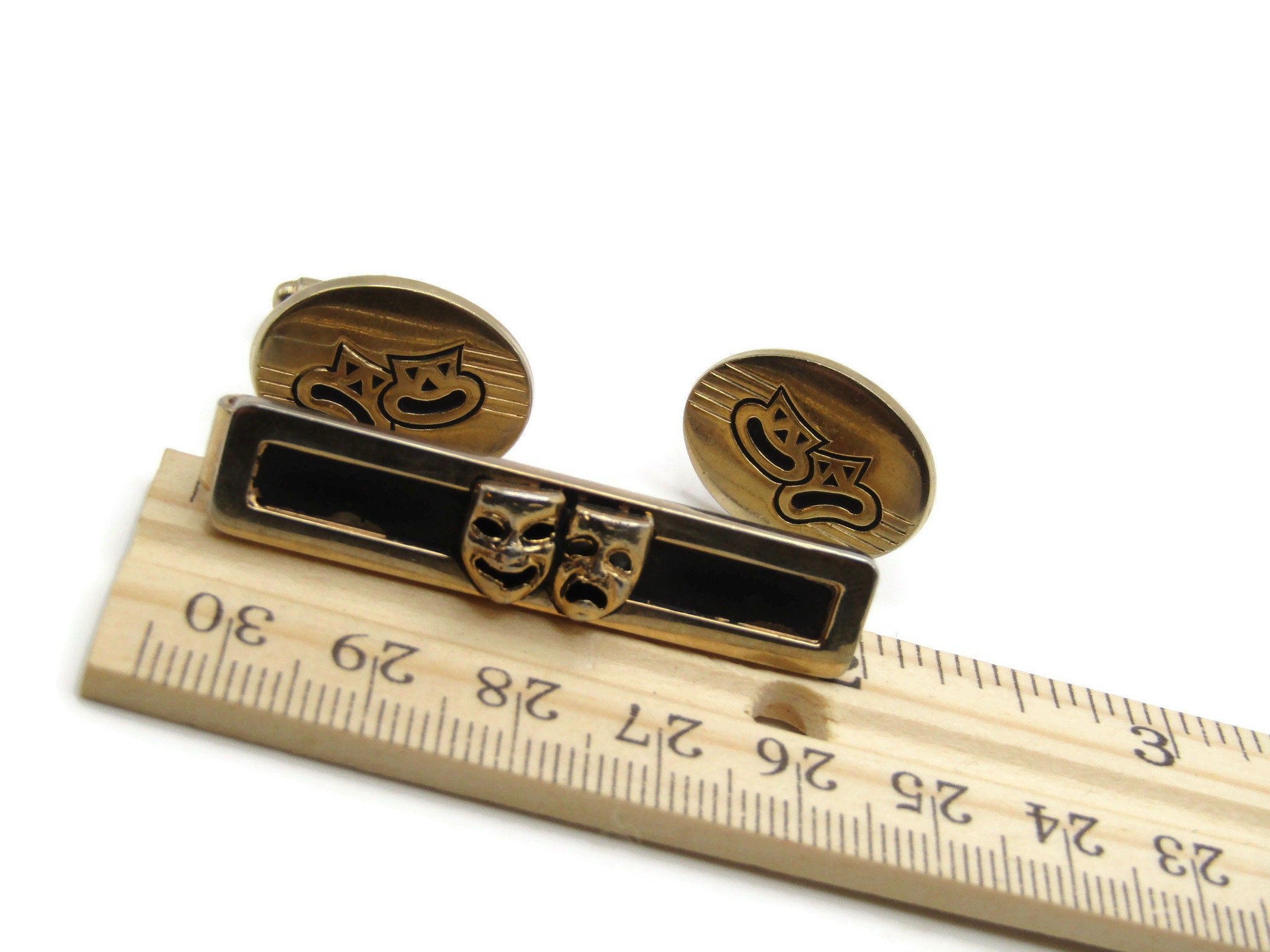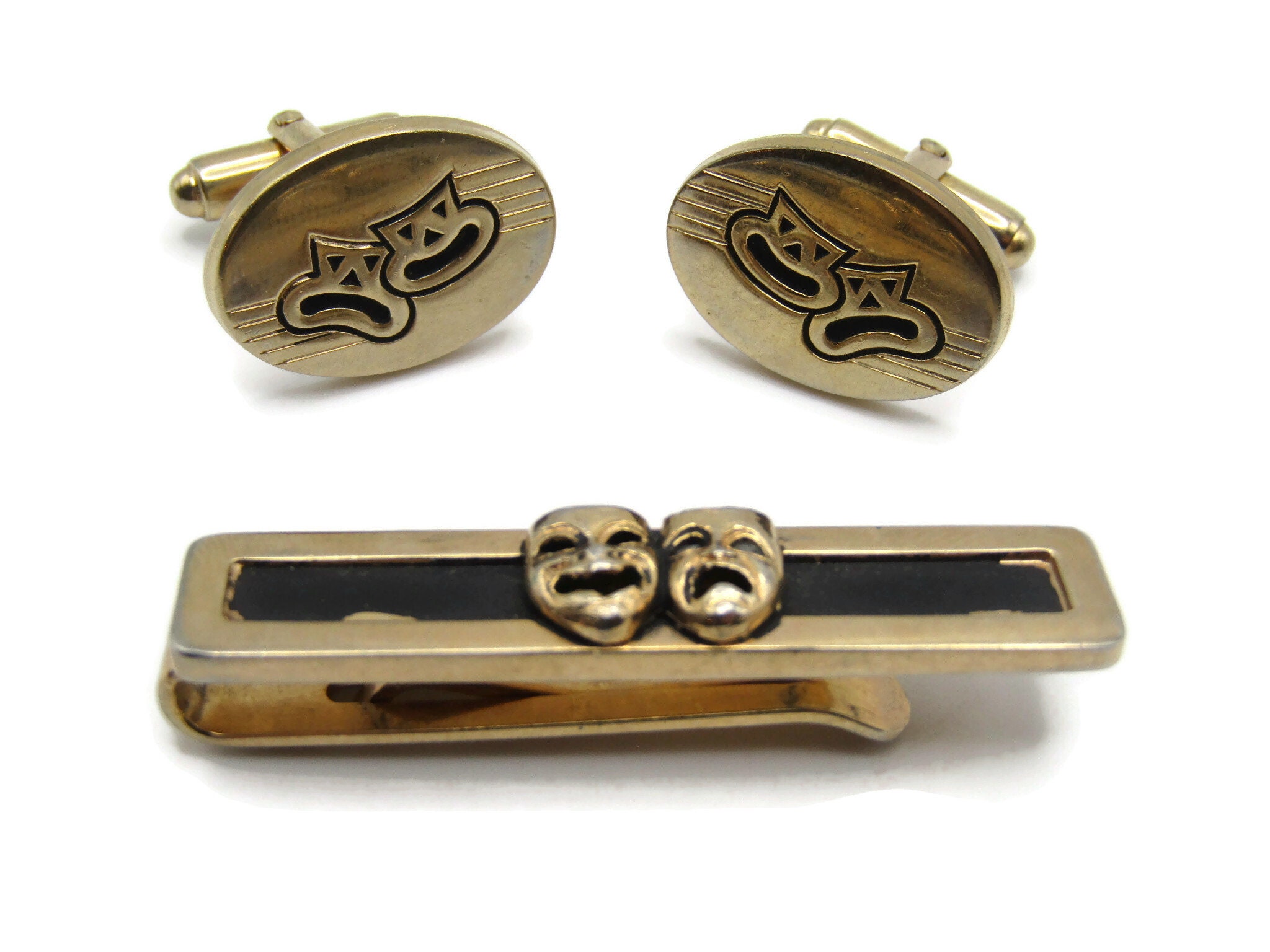 Vintage Men's Jewelry Set: Tie Bar Cufflinks Tragedy and Comedy Masks Gold Tone