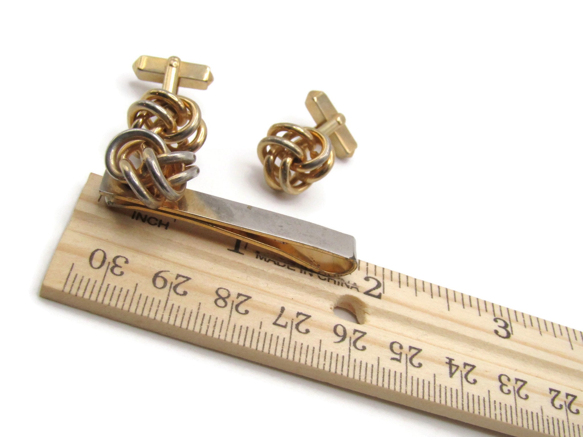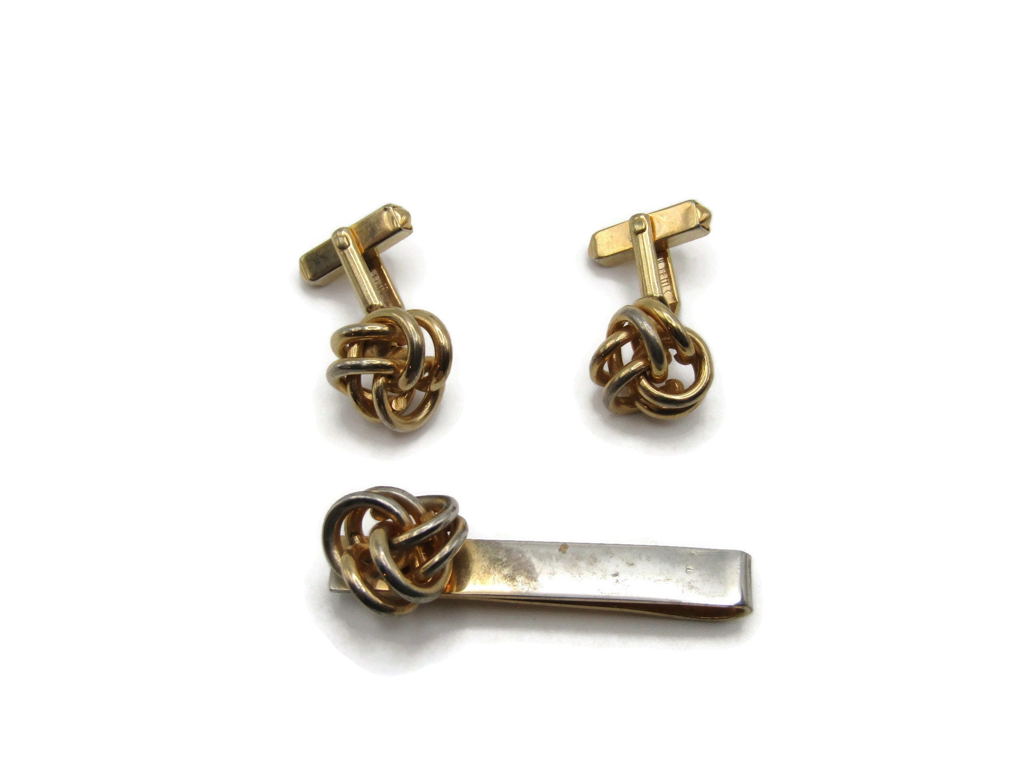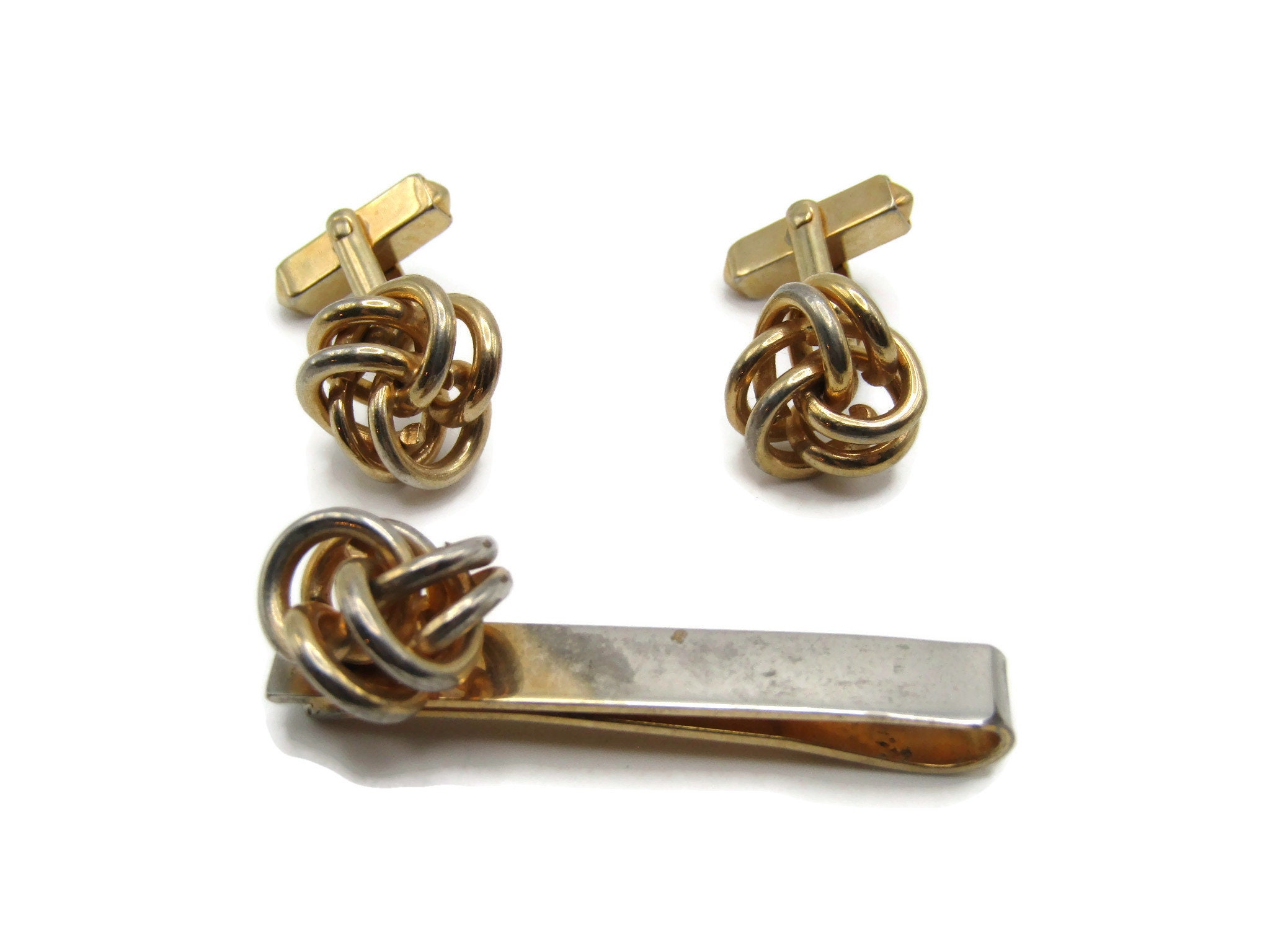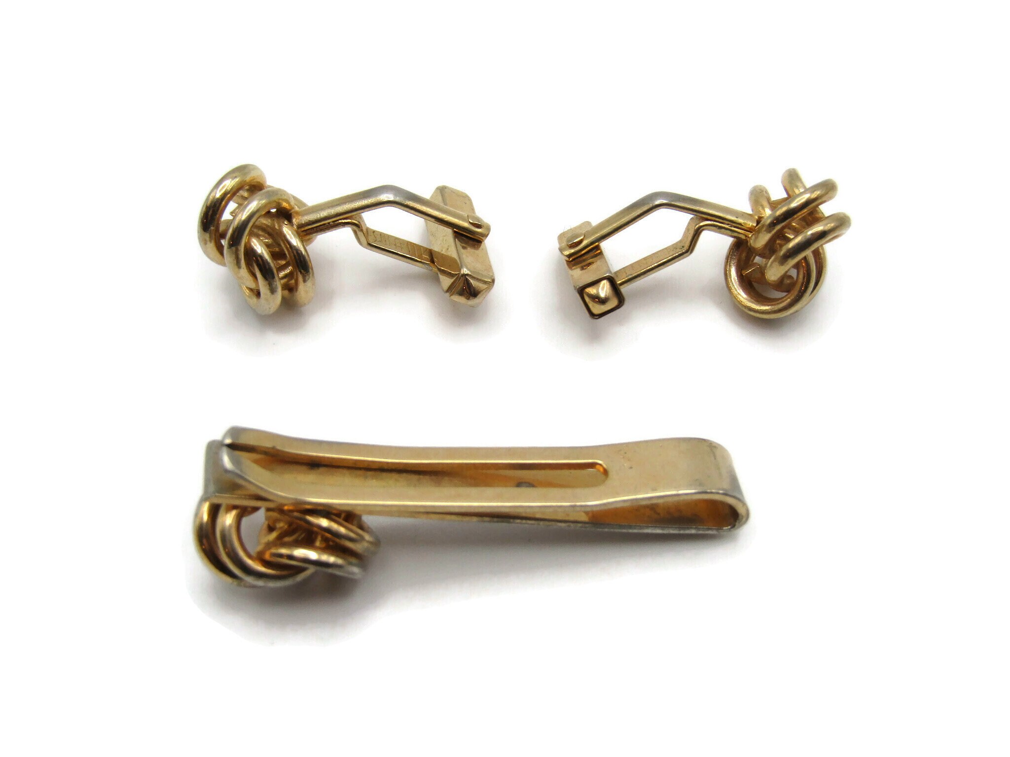 Knotted Design Vintage Men's Jewelry Set: Tie Bar Cufflinks Gold Tone