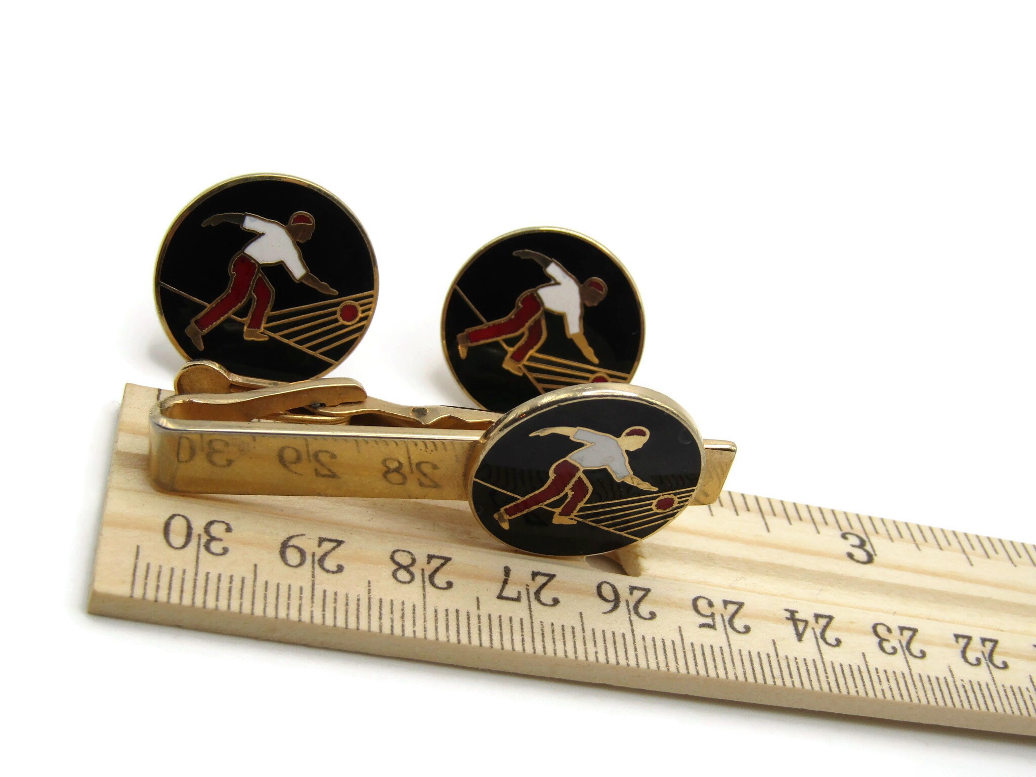 Bowling Lanes Bowler Gift Vintage Men's Jewelry Set: Tie Bar Cufflinks