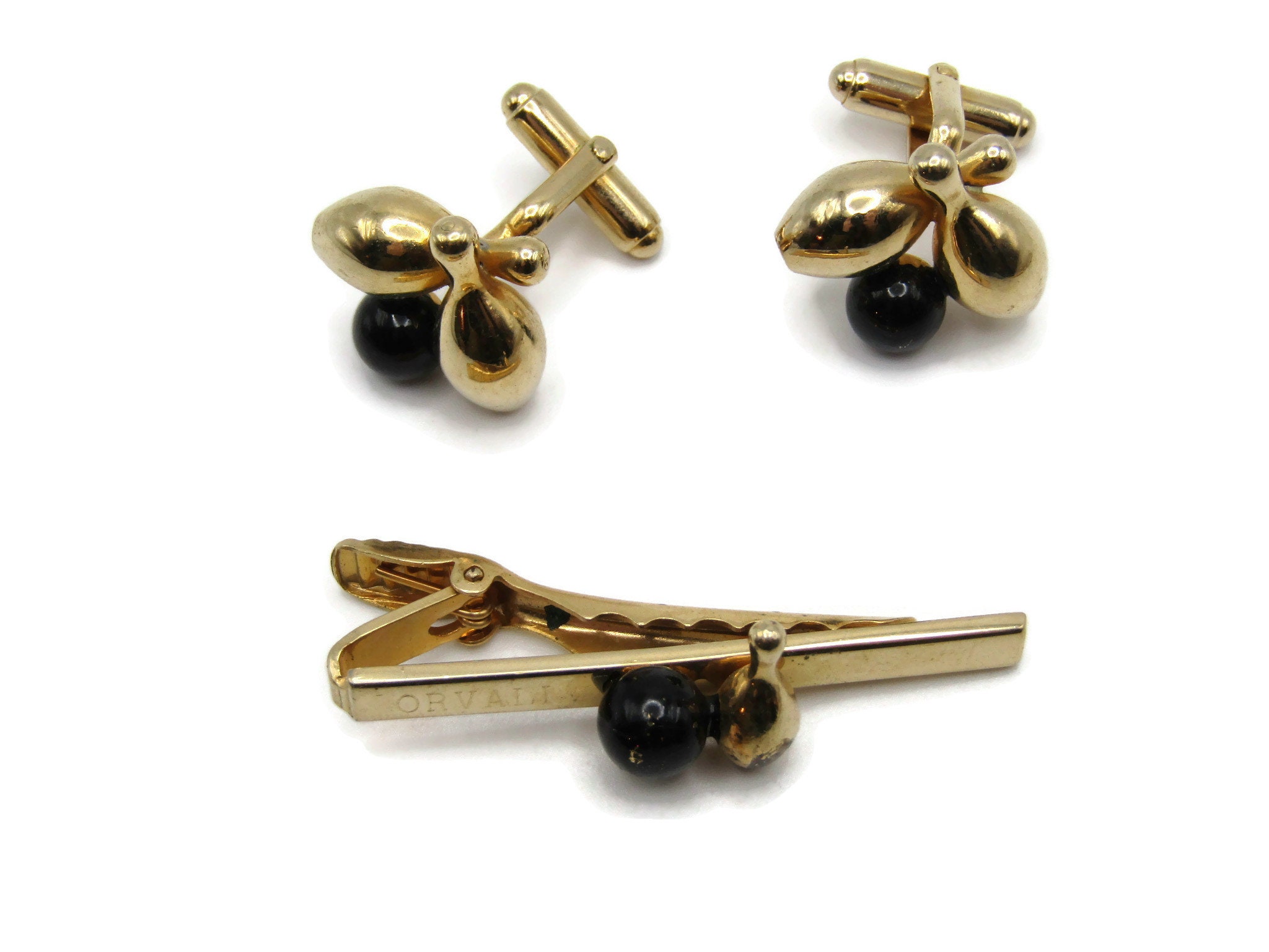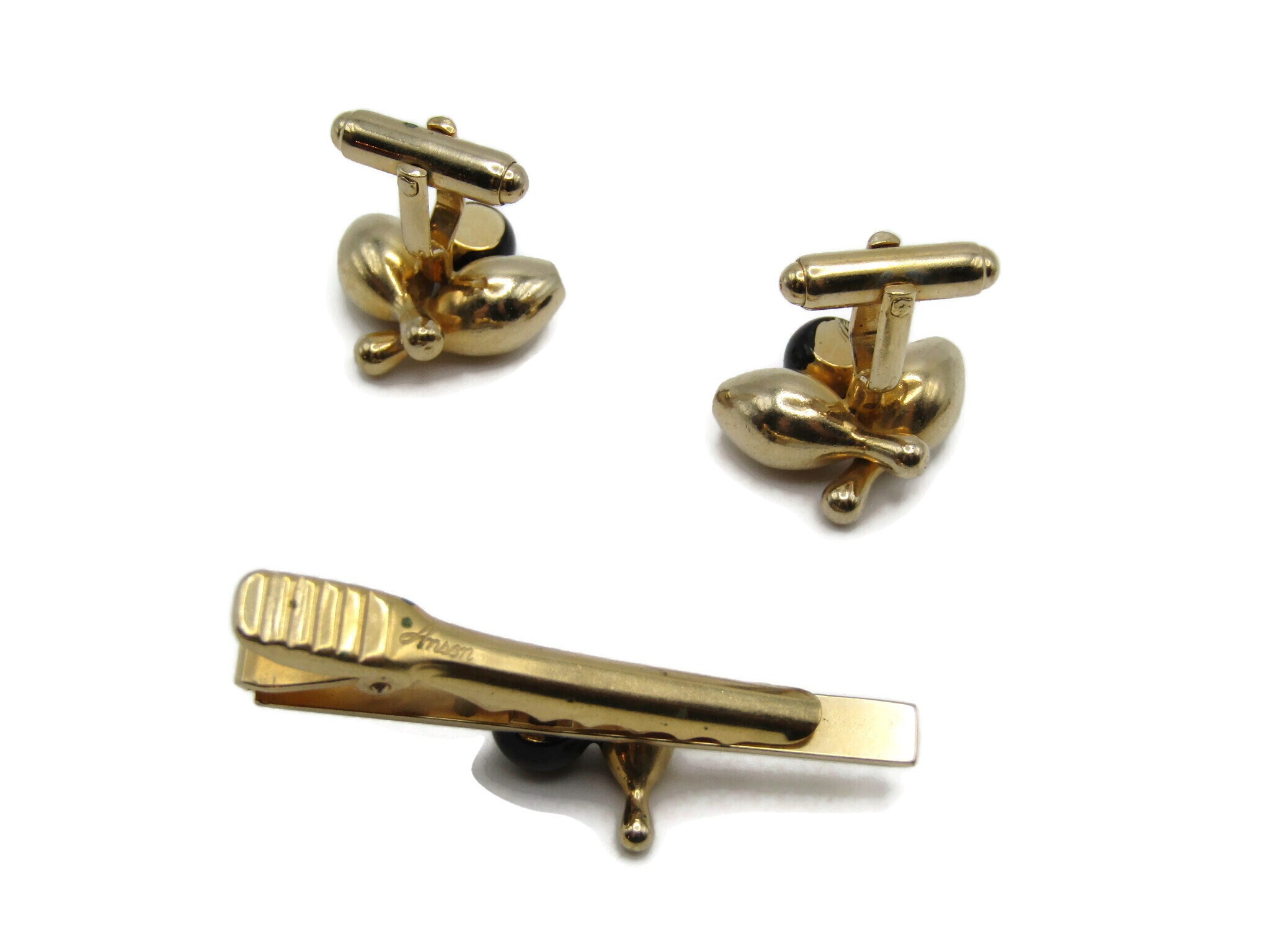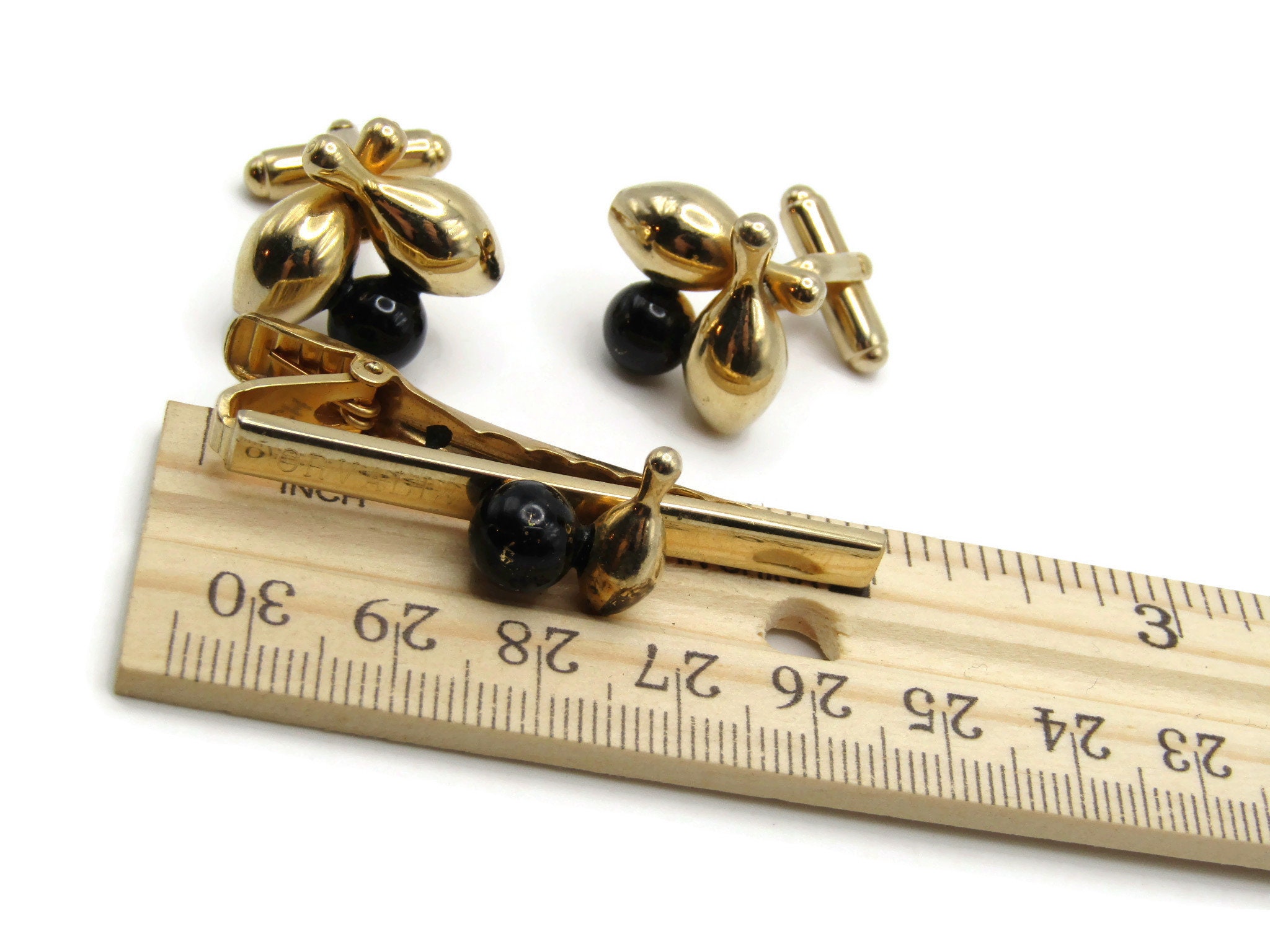 Bowling Ball and Pins Vintage Men's Jewelry Set: Tie Bar Cufflinks Black Gold Tone