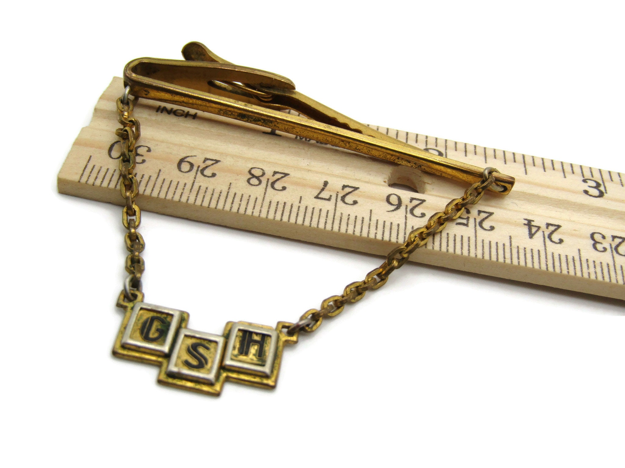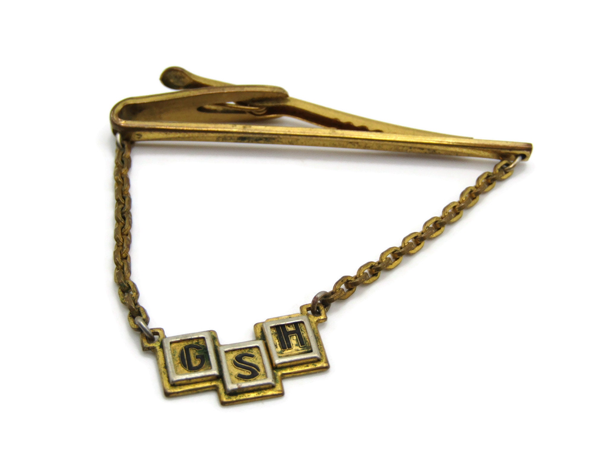 G S H Initial Letter Monogram Tie Chain Gold Tone Tie Bar Men's Jewelry