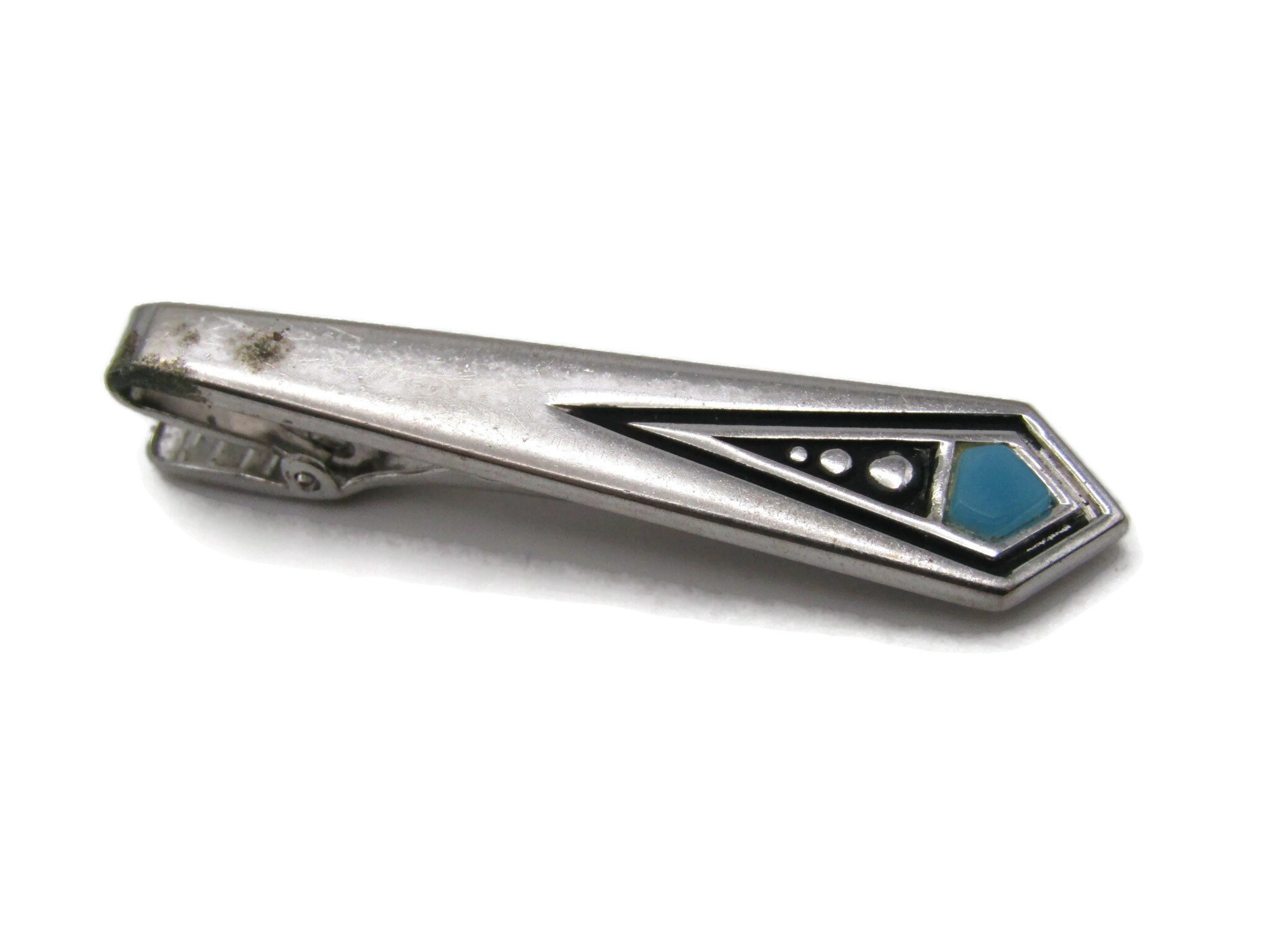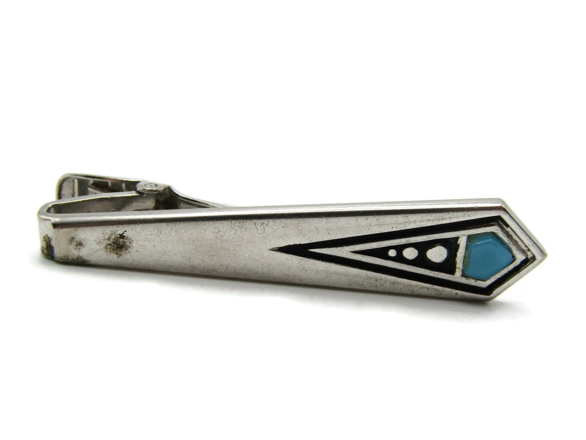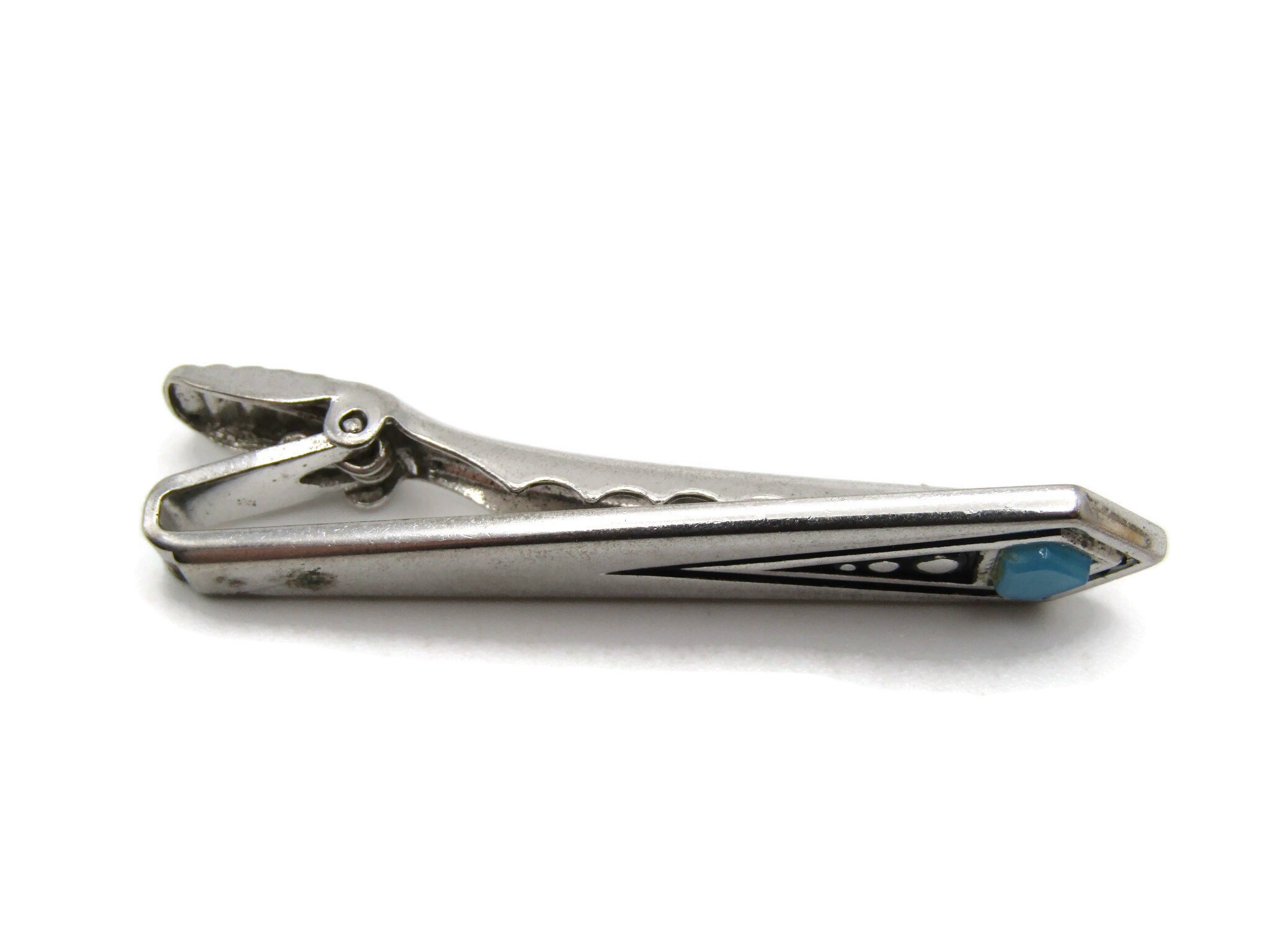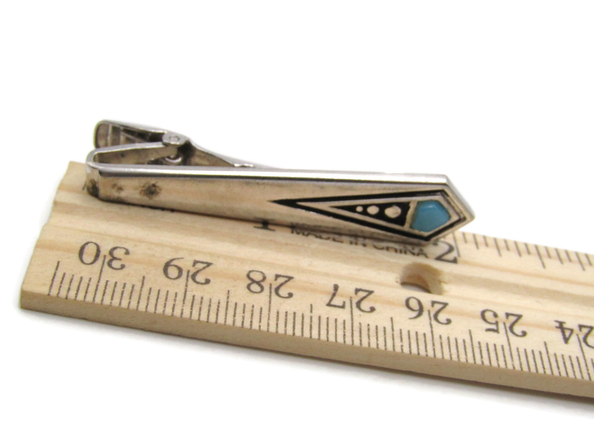 Blue Stone Southwestern Style Triangle Design Tie Clip Silver Tone Tie Bar Men's Jewelry