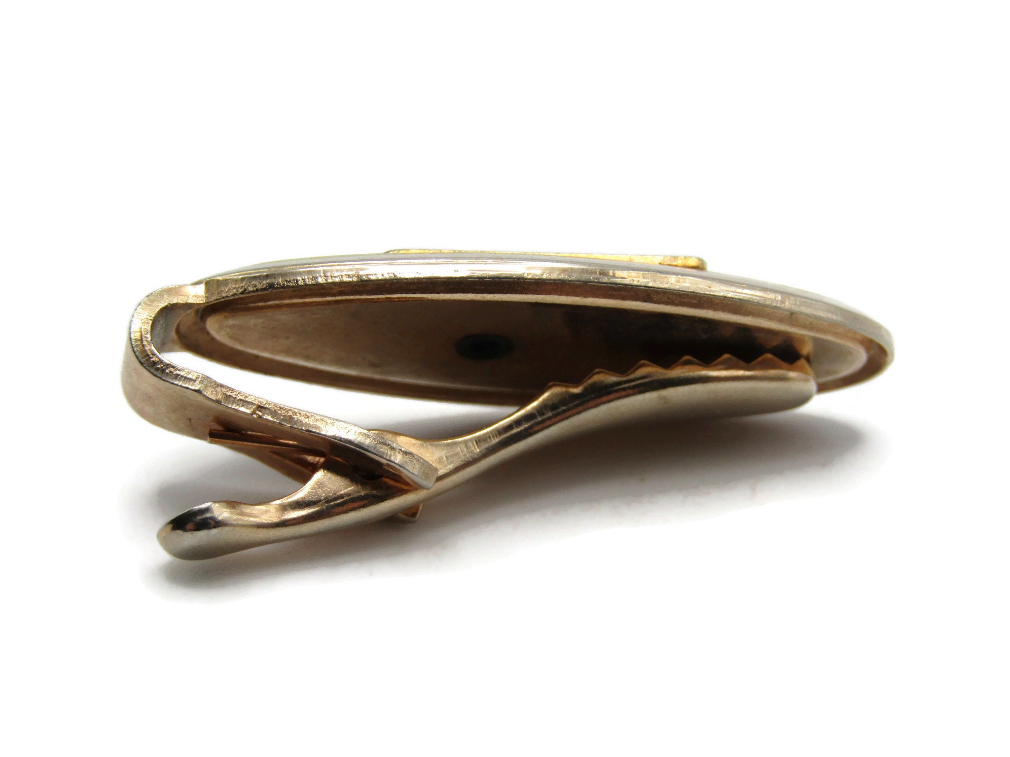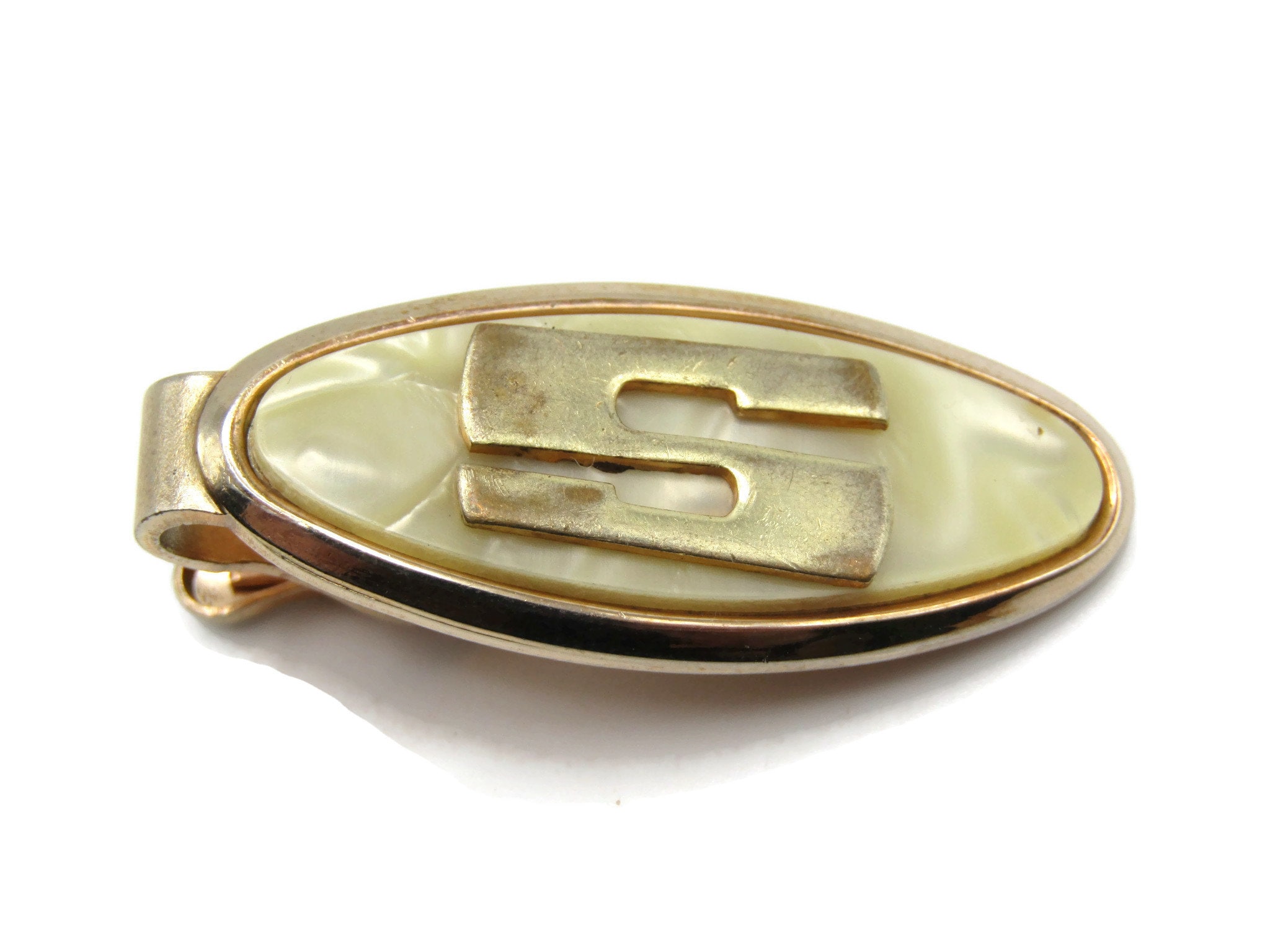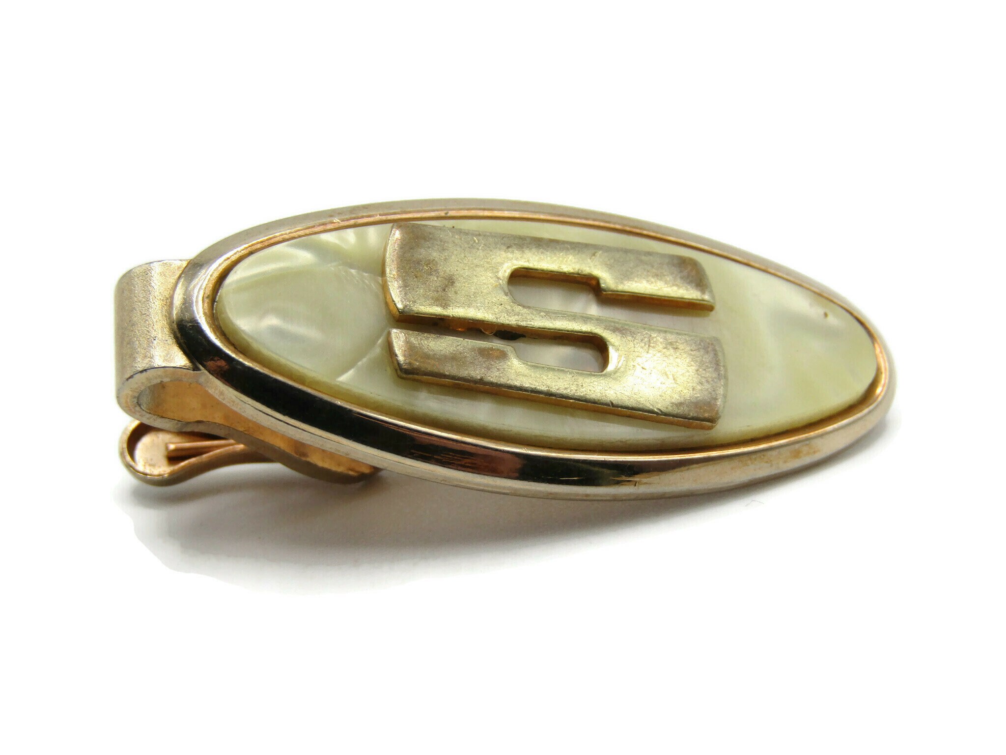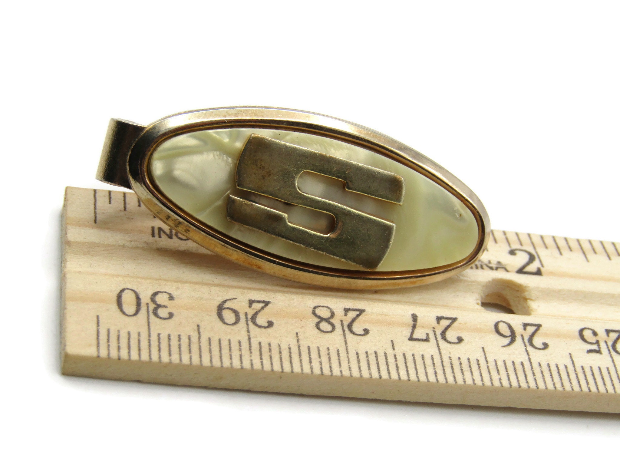 S Letter Initial Monogram Mother of Pearl Inlay Gold Tone Tie Clip Tie Bar Men's Jewelry