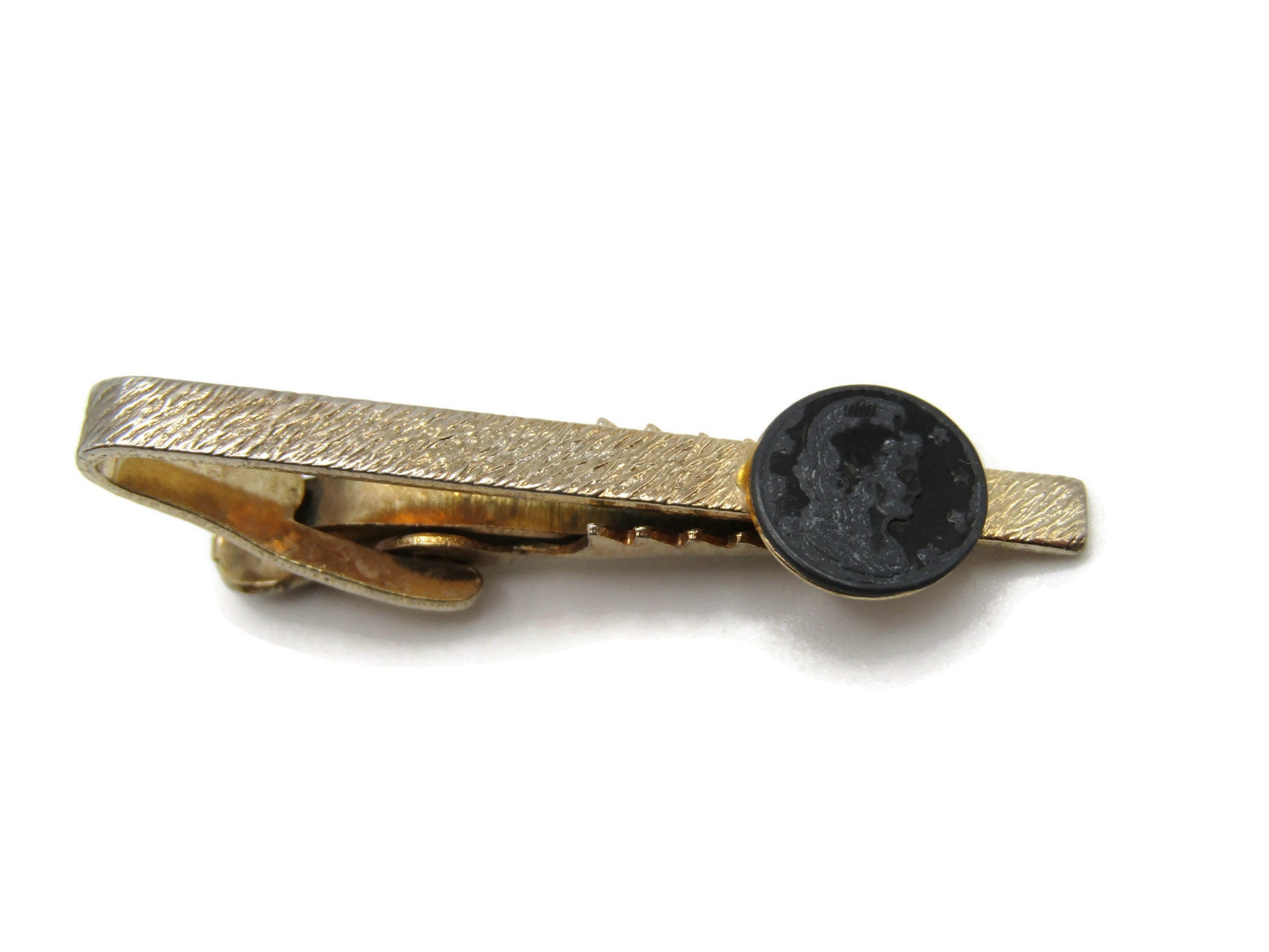 Roman Soldier Profile Black Stone Inlay Textured Gold Tone Tie Bar Tie Clip Men's Jewelry