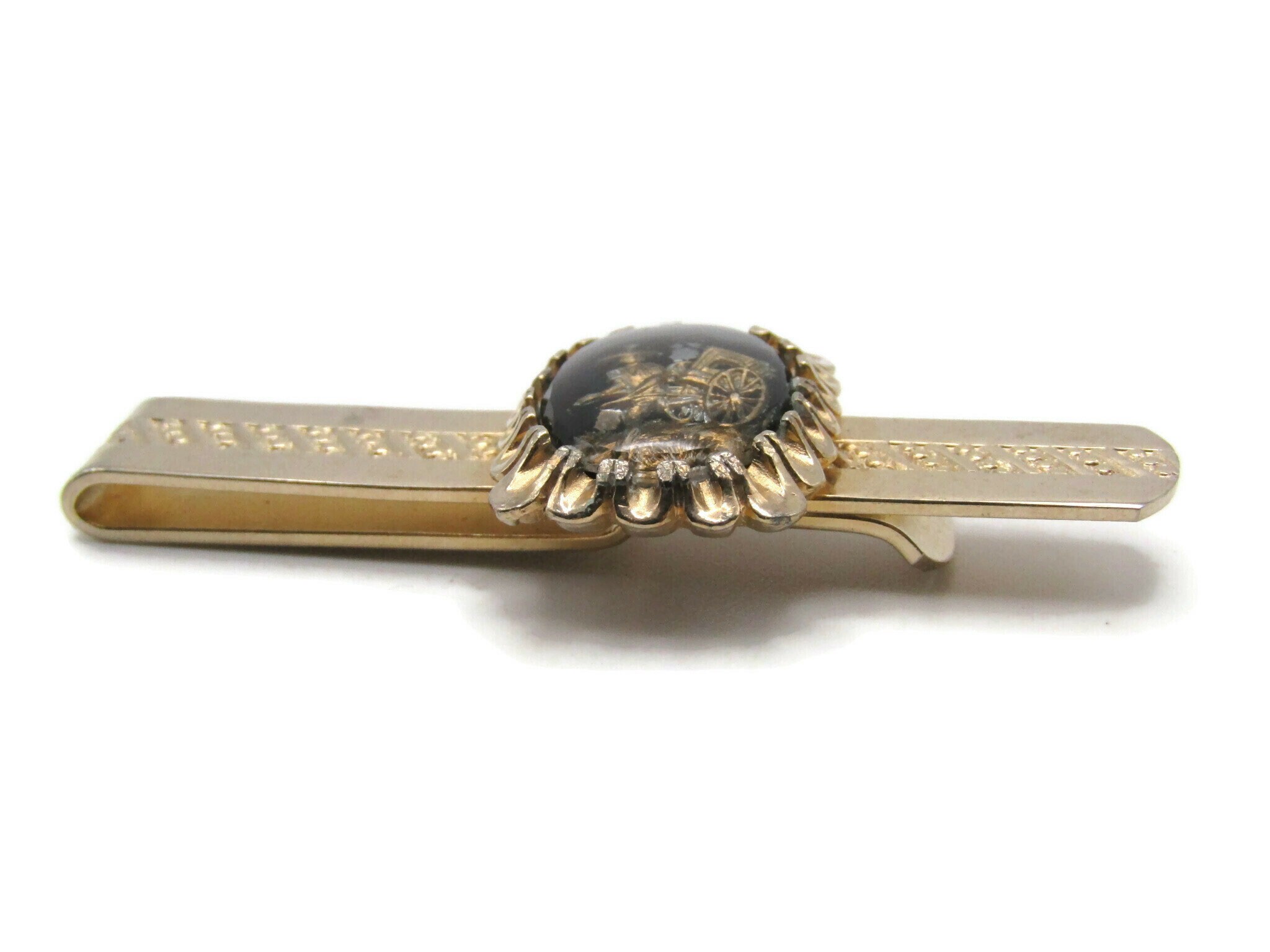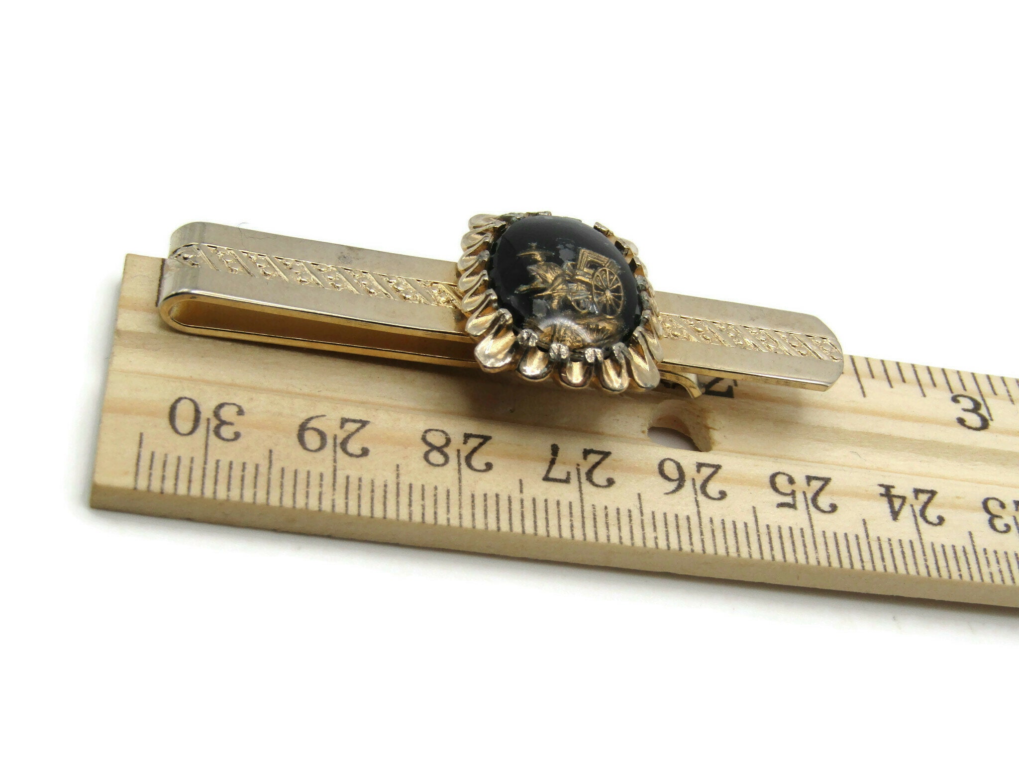 Person and Carriage Black Stone Inlay Etched Design Gold Tone Tie Bar Tie Clip Men's Jewelry