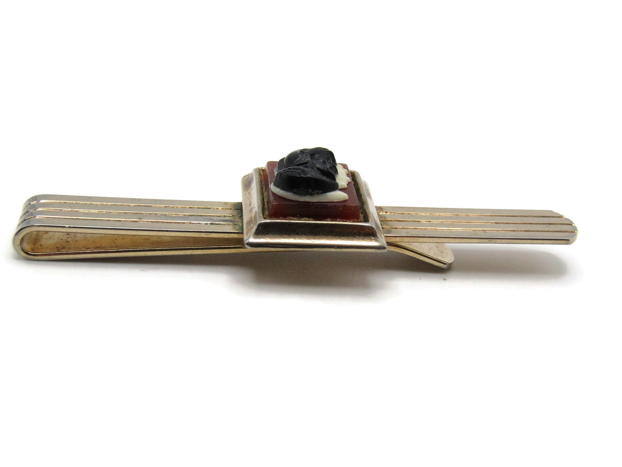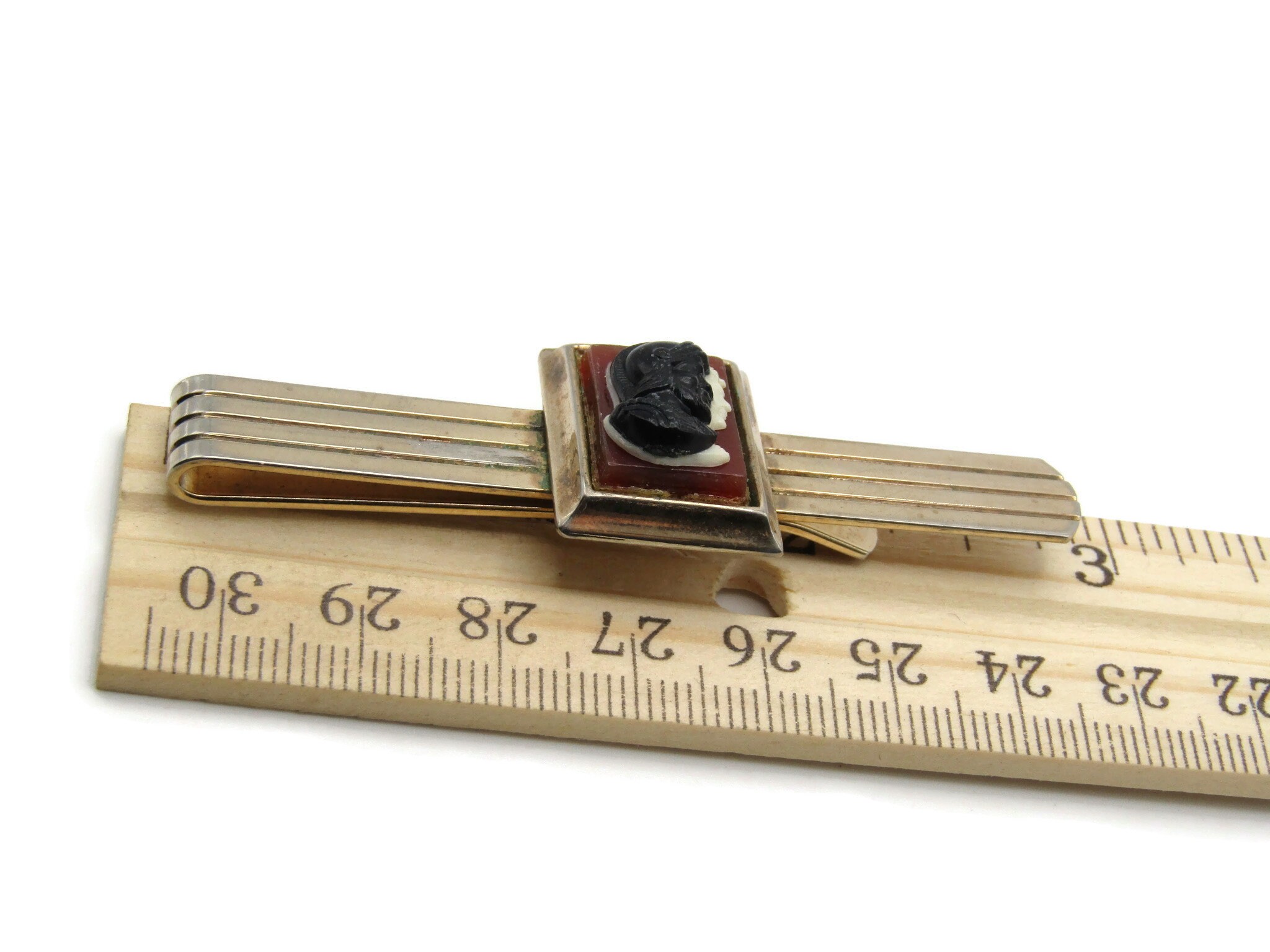 Roman Soldier Heads Brown Stone Inlay Line Design Gold Tone Tie Clip Tie Bar Men's Jewelry