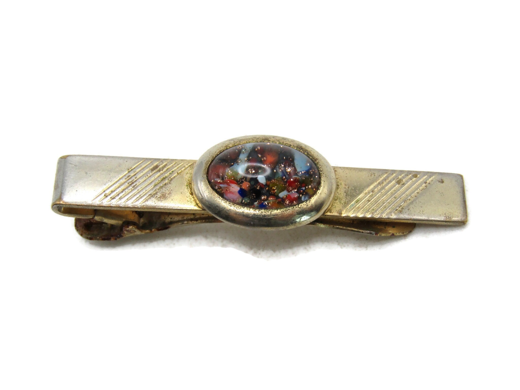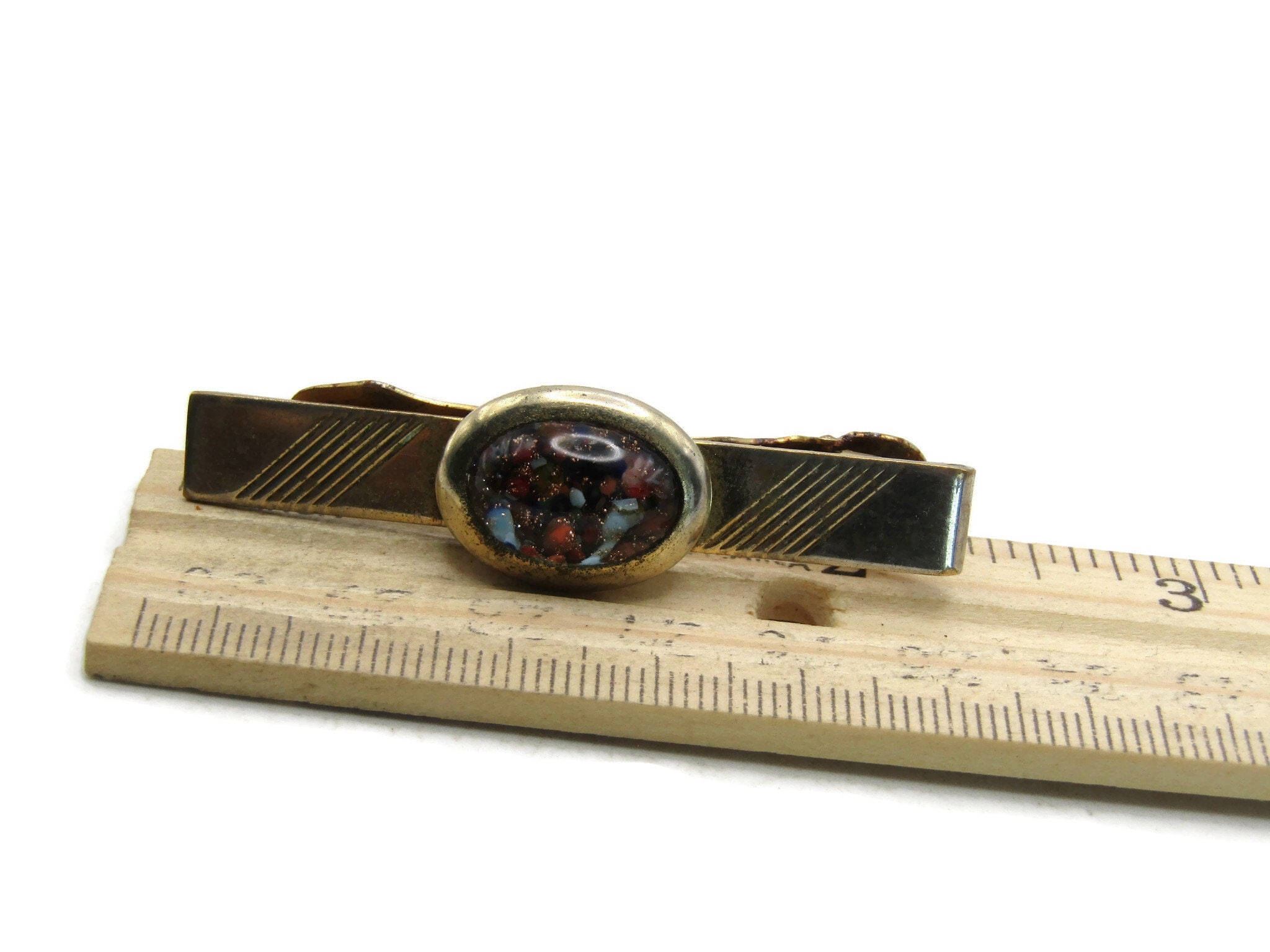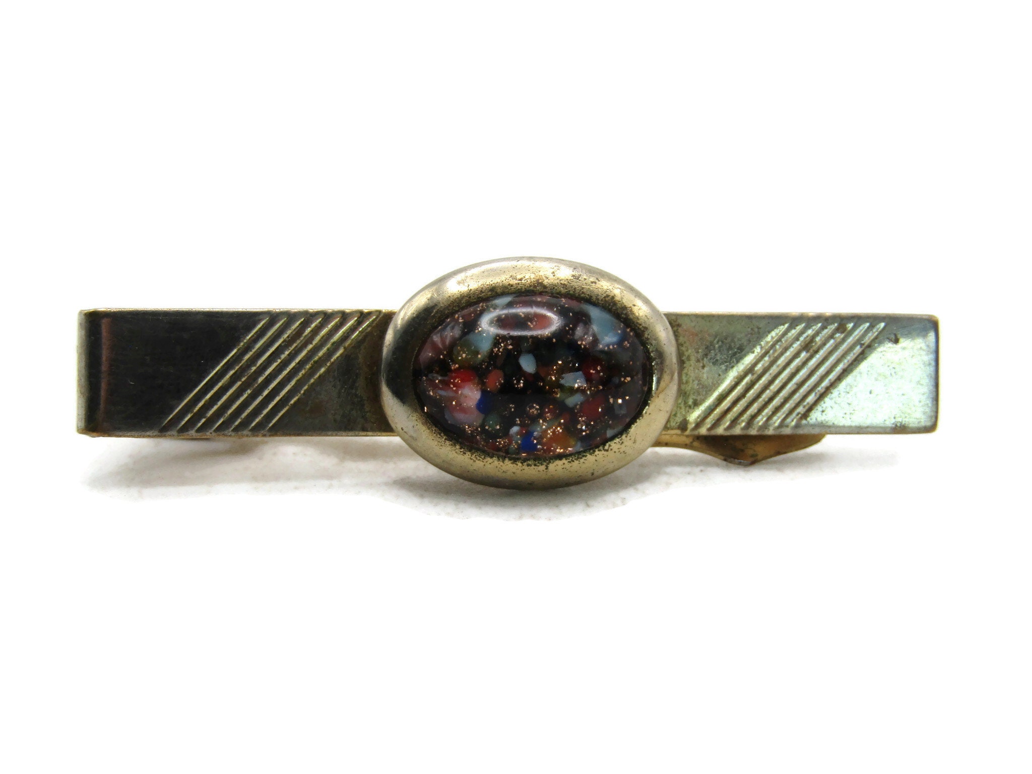 Multicolored Stone Inlay Tie Clip Vintage Tie Bar Etched Gold Tone Men's Jewelry