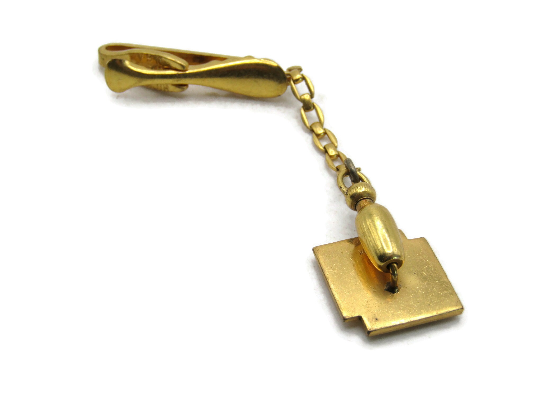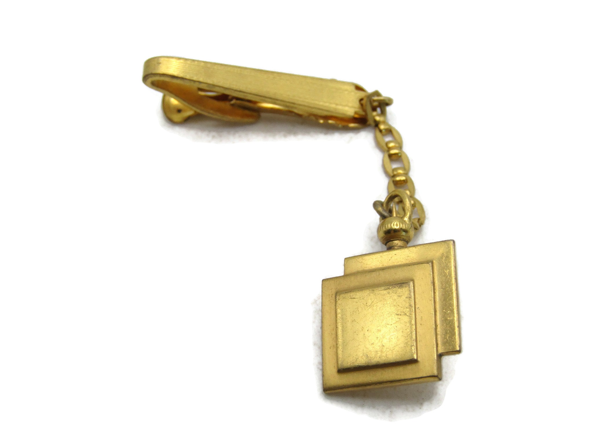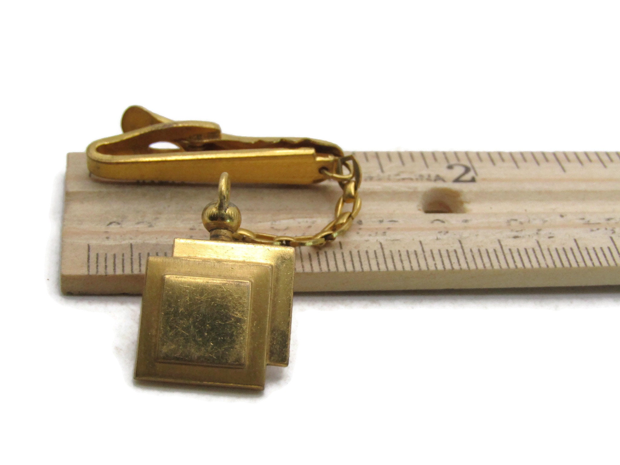Vintage Gold Tone Tie Clip & Clain Set Square Patterned Tie Bar Men's Jewelry