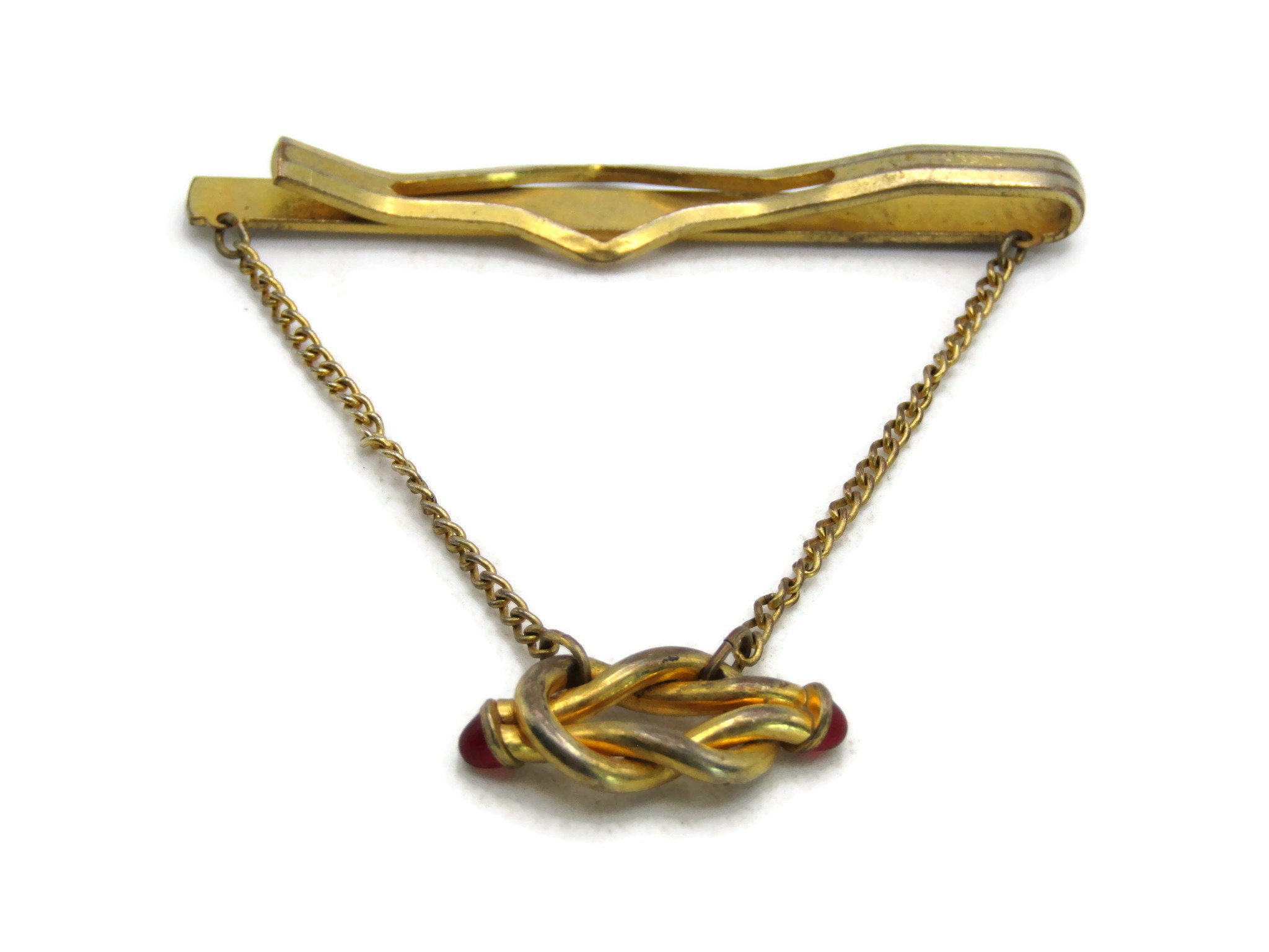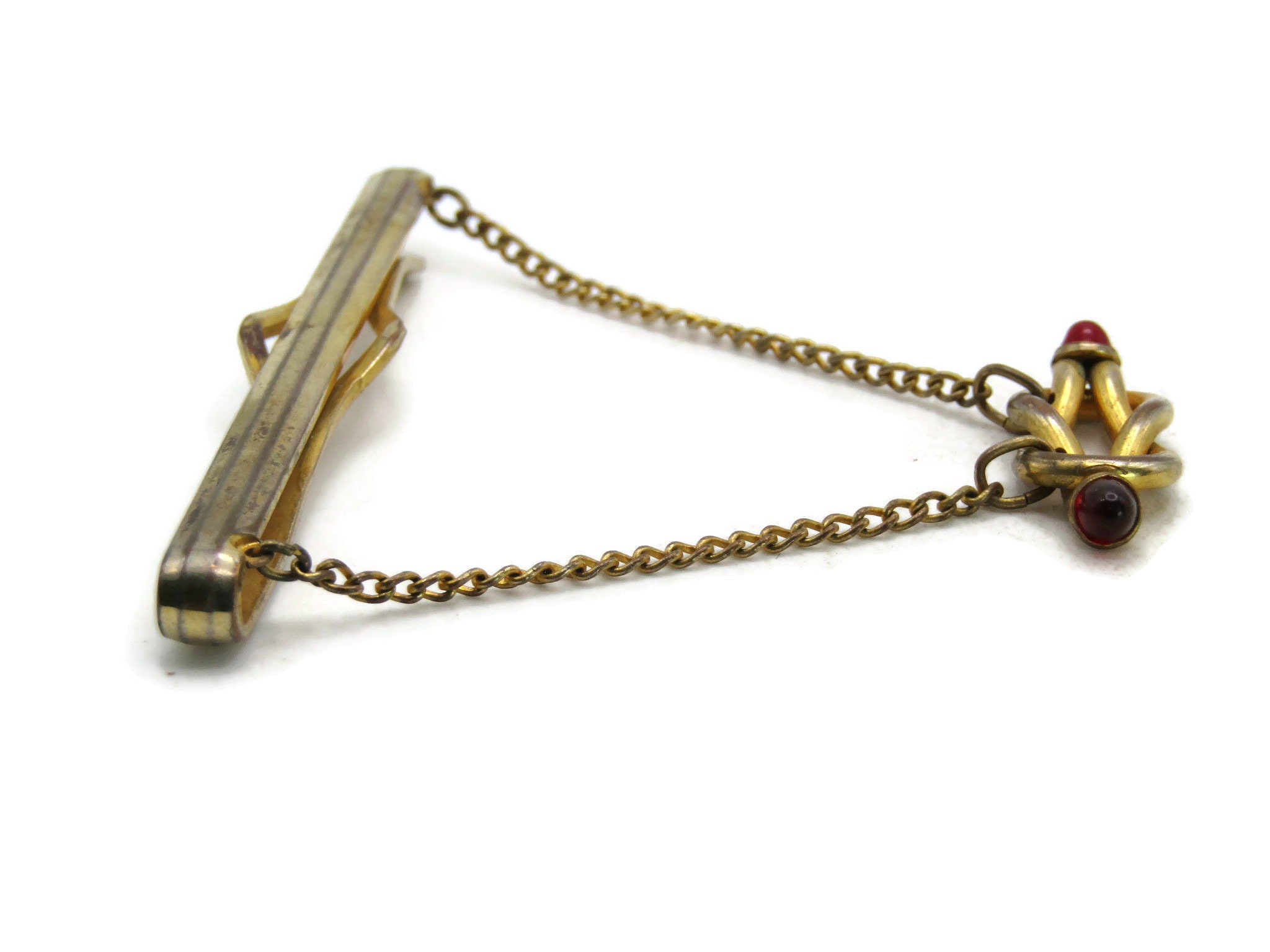 Red Stone Inlay Knot Tie Bar & Chain Modernist Industrial Tie Clip Gold Tone Men's Jewelry