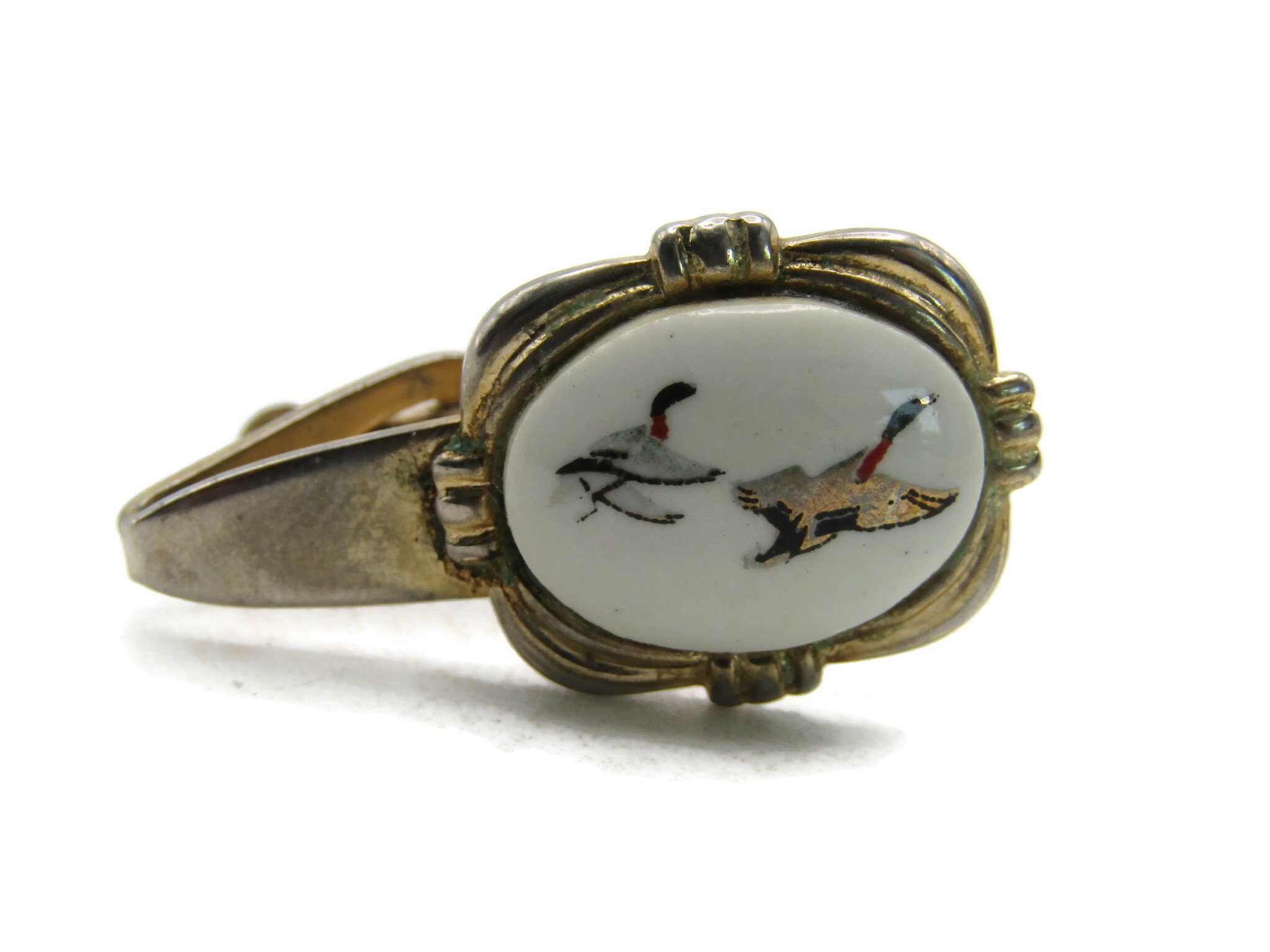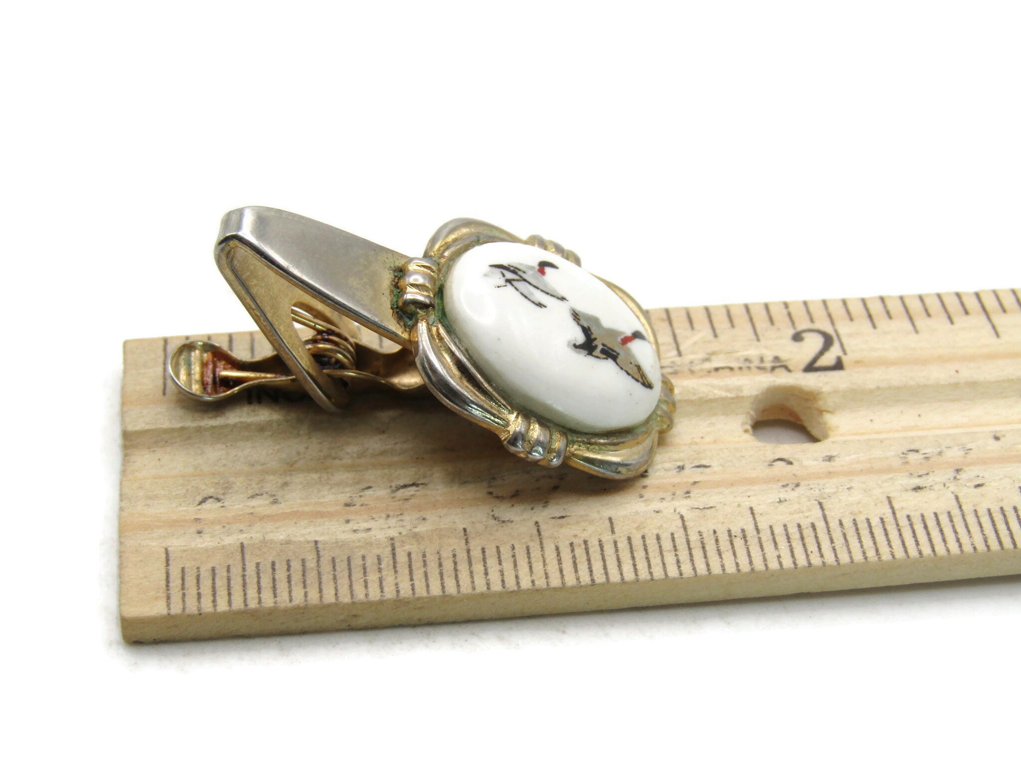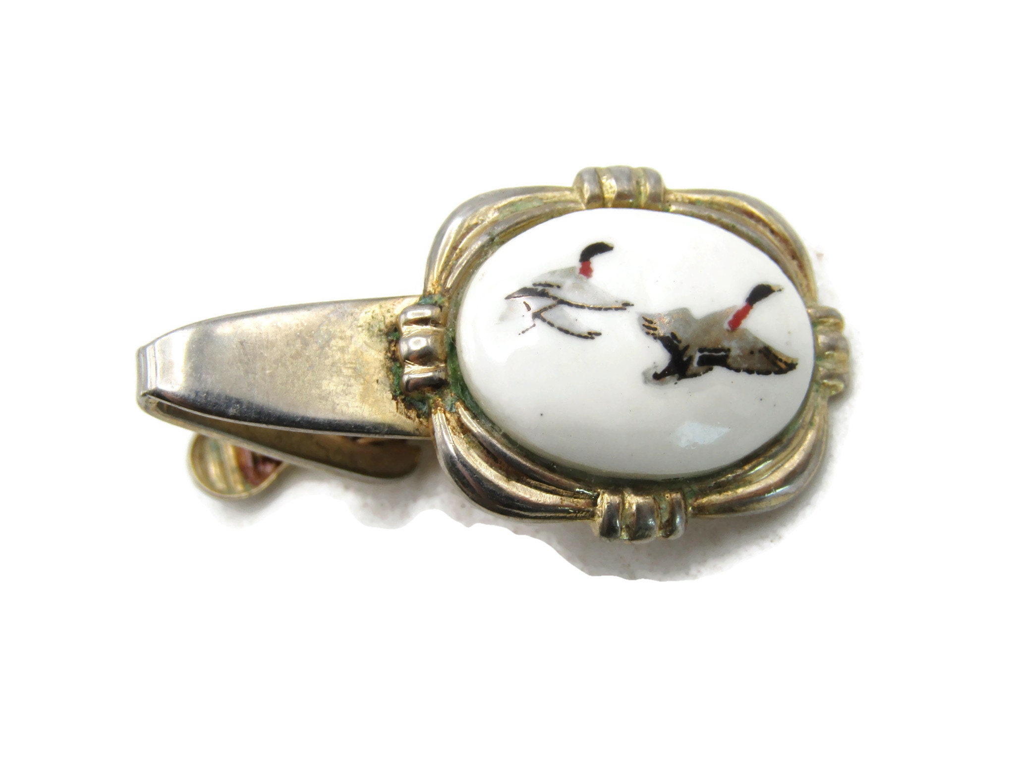 Flying Ducks White Stone Inlay Tie Clip Hunter Gift Gold Tone Tie Bar Men's Jewelry