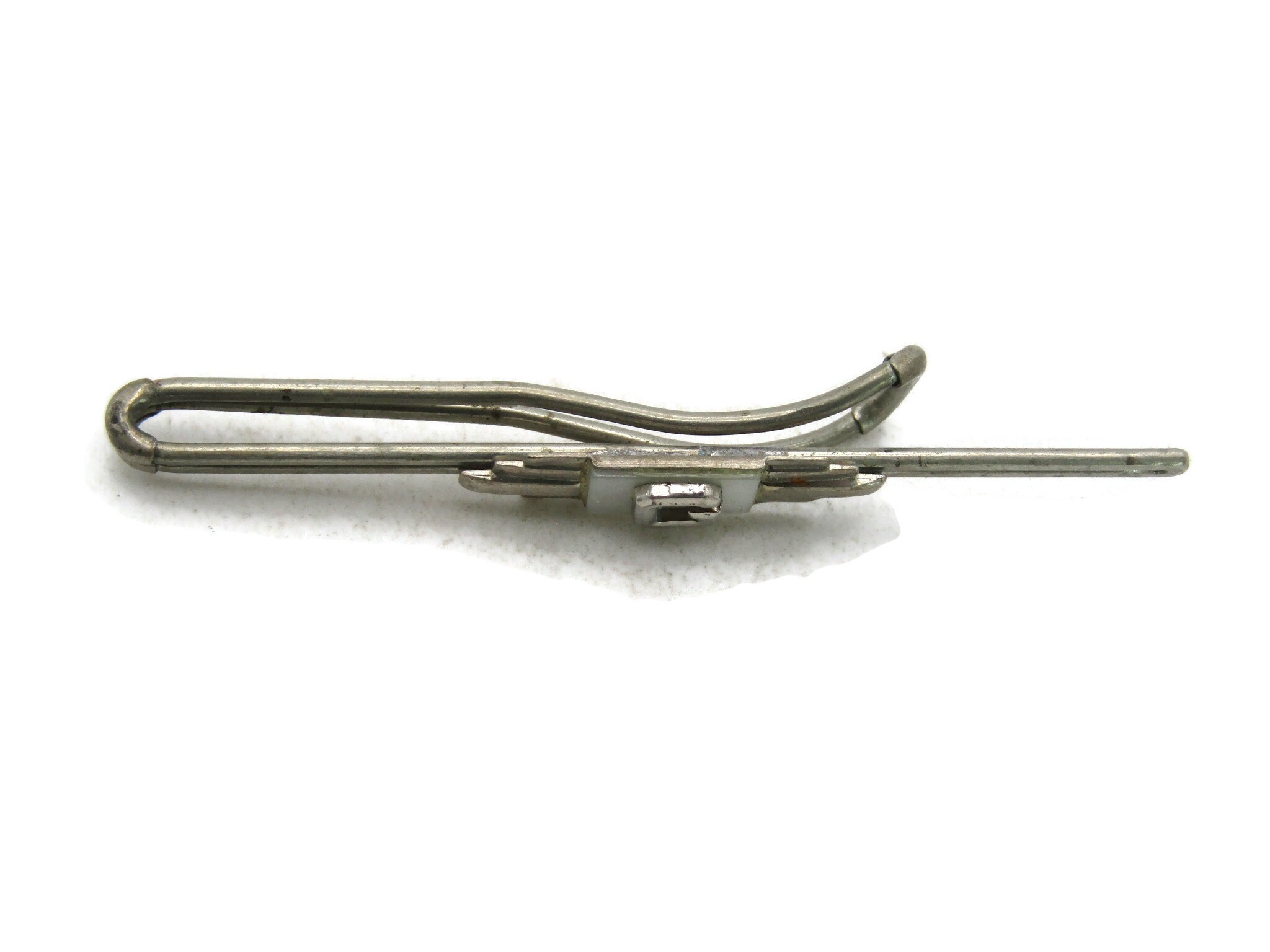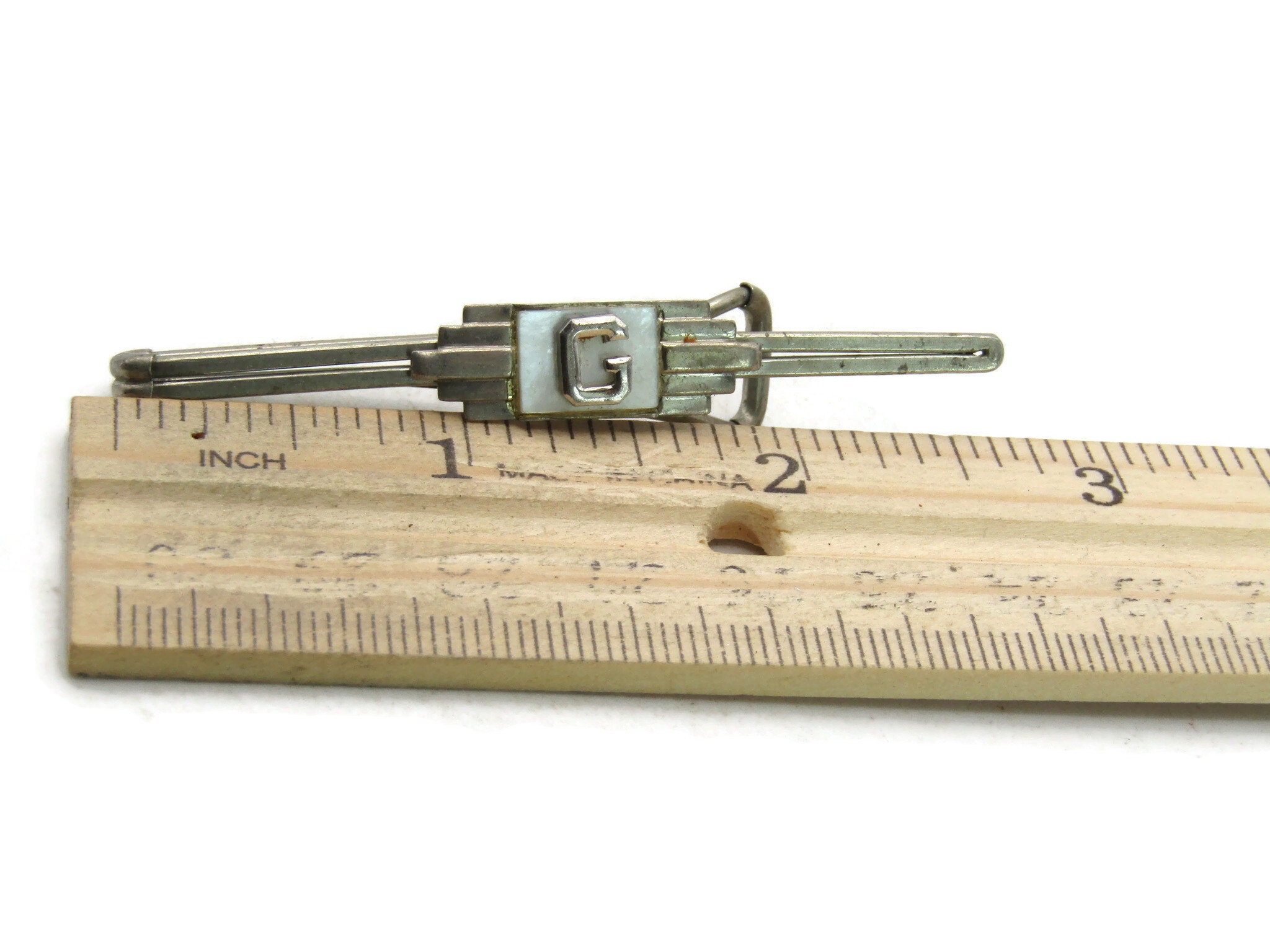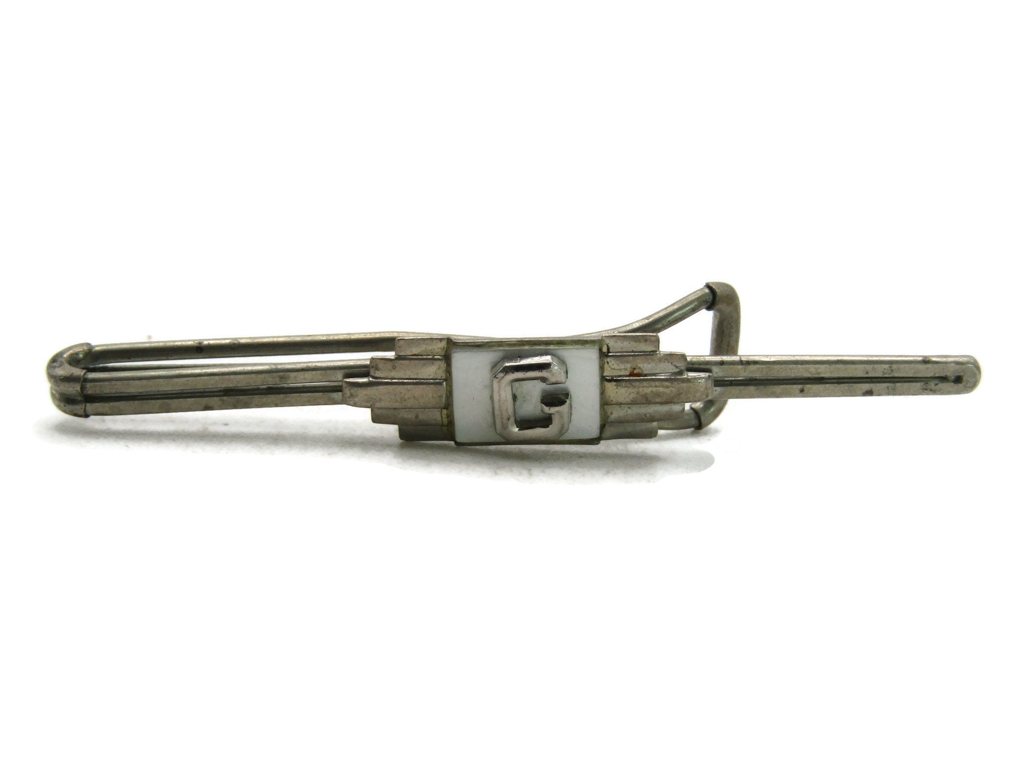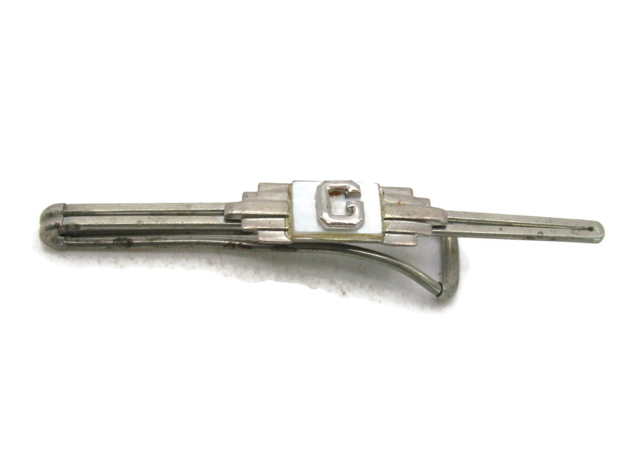 G Letter Initial Monogram Mother Of Pearl Tie Clip Art Deco Style Silver Tone Tie Bar Men's Jewelry