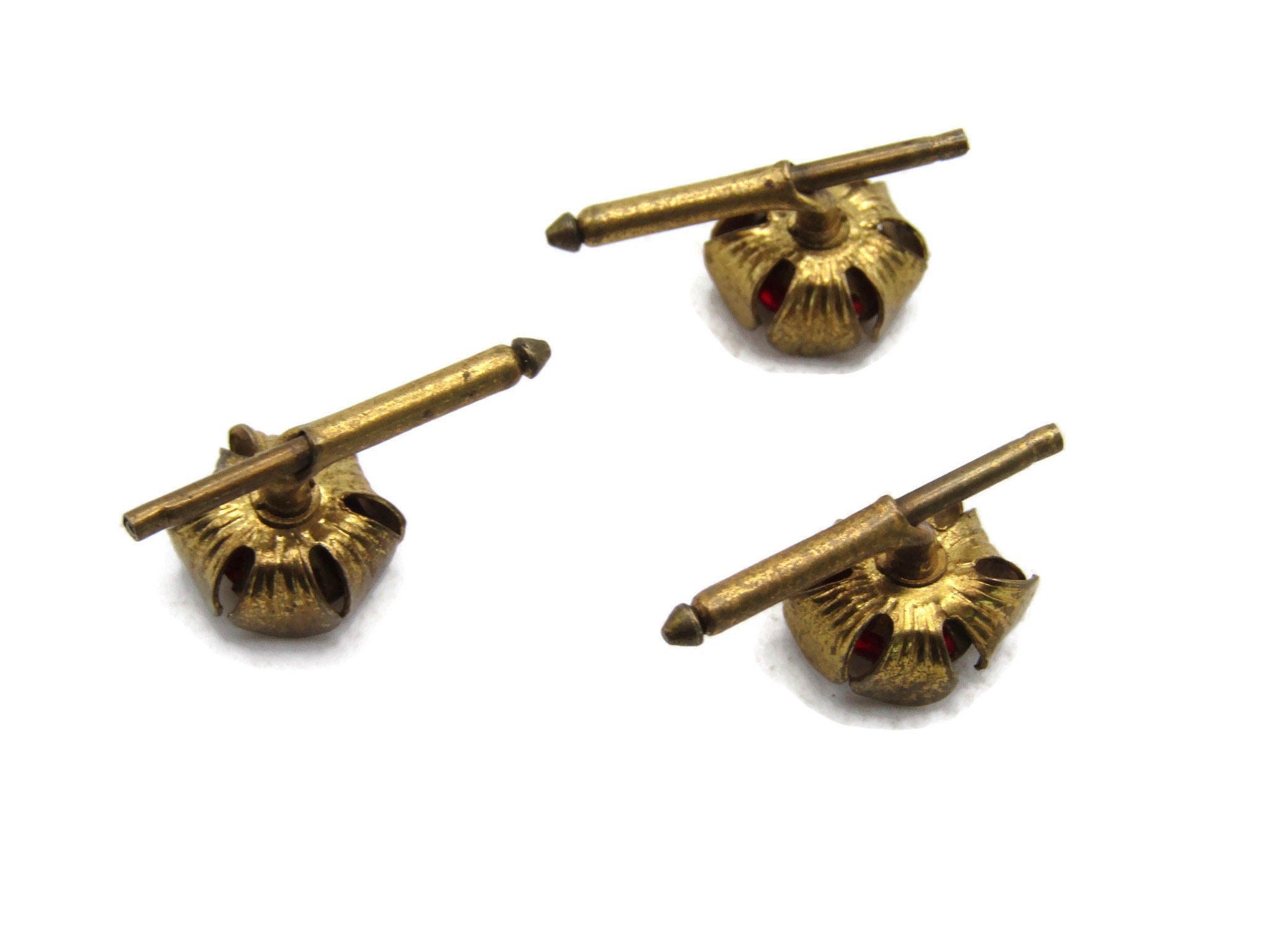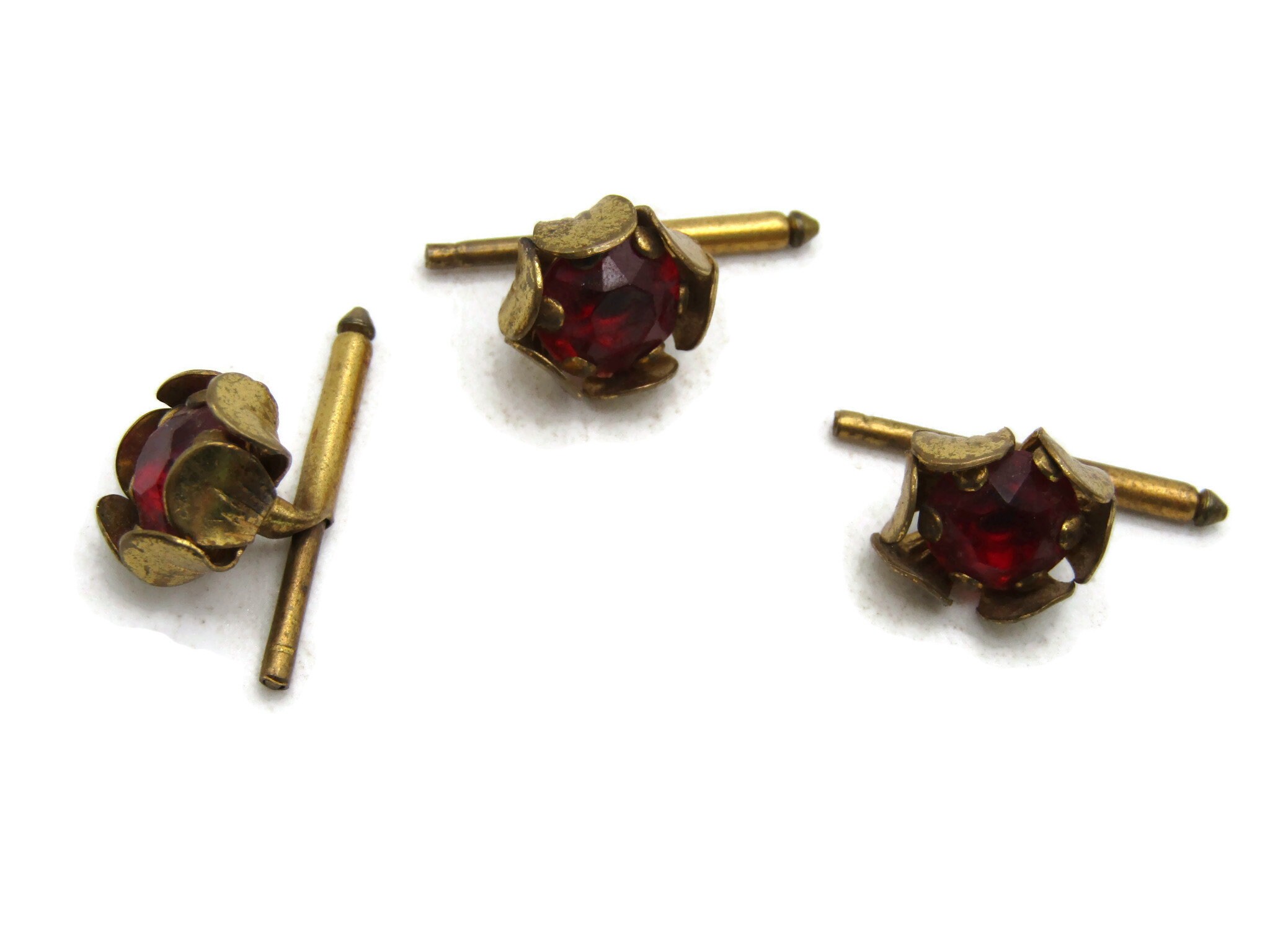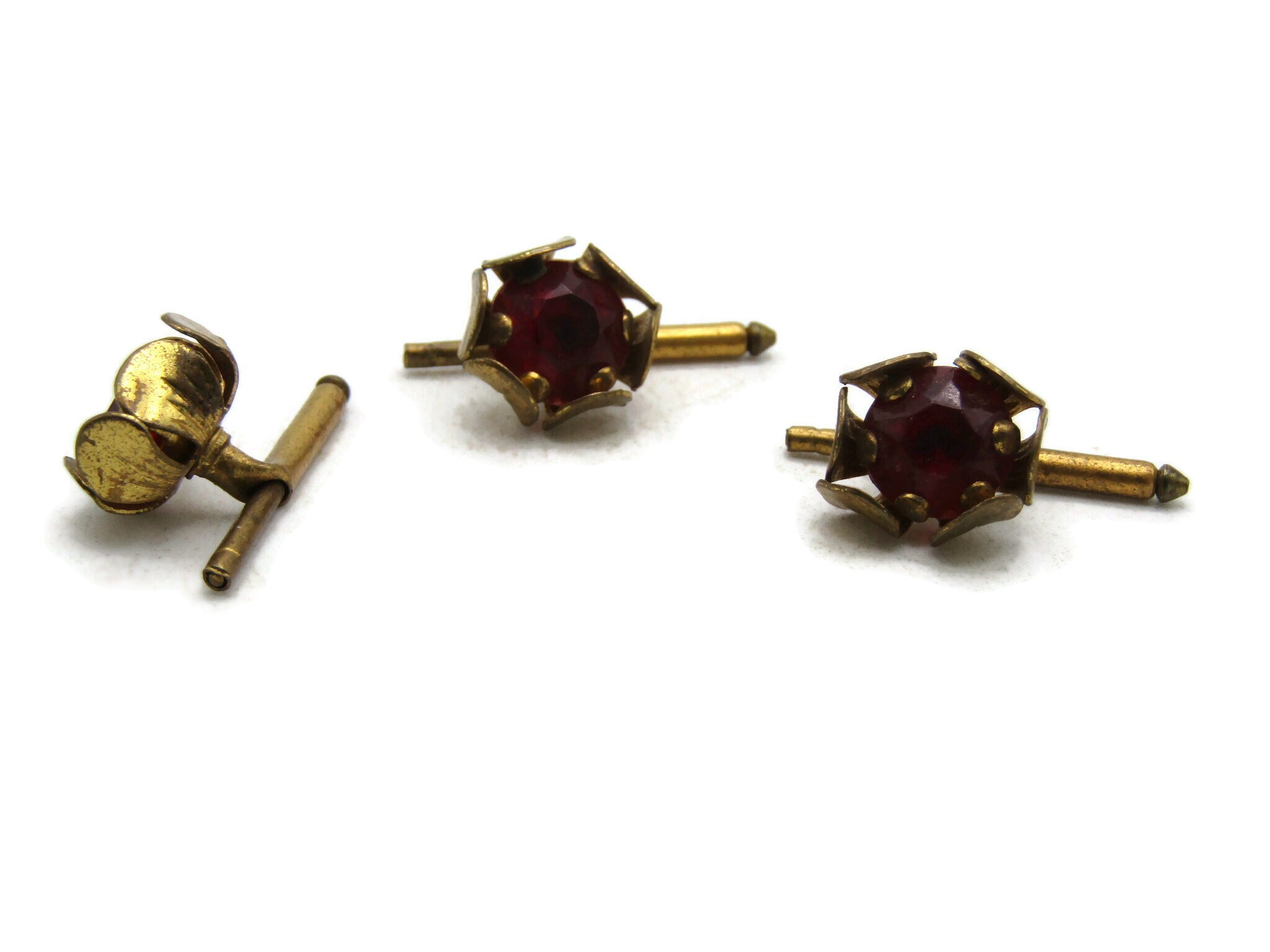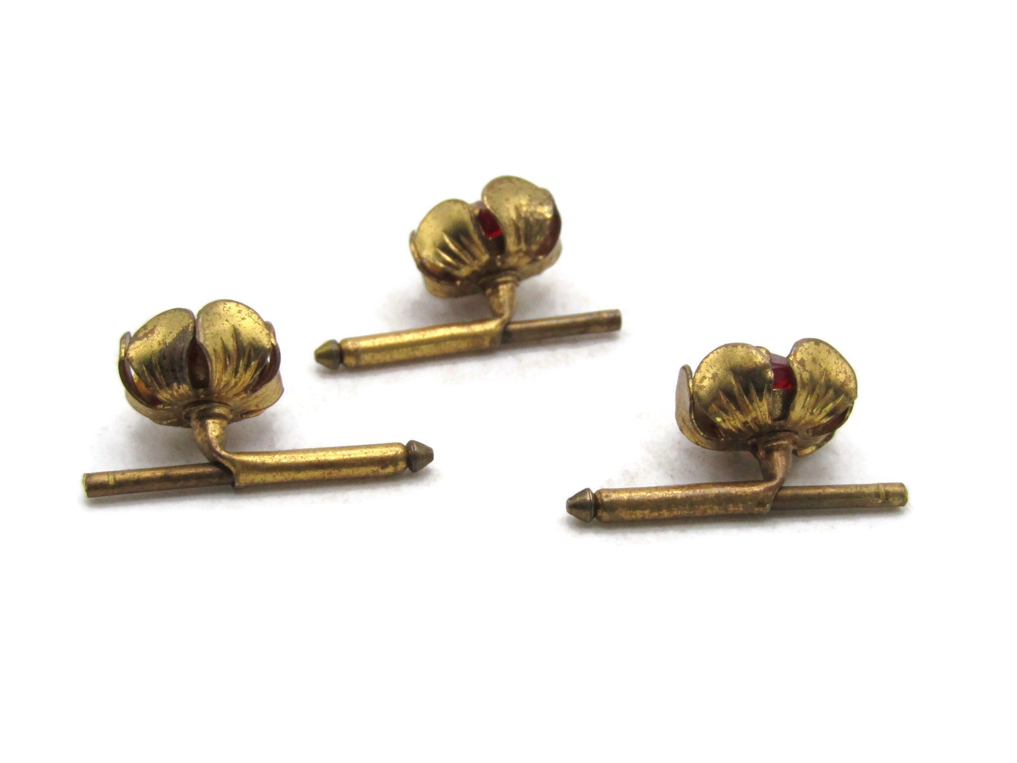 Red Stone Floral Shape Cuff Link Set of 3 Gold Tone Men's Jewelry