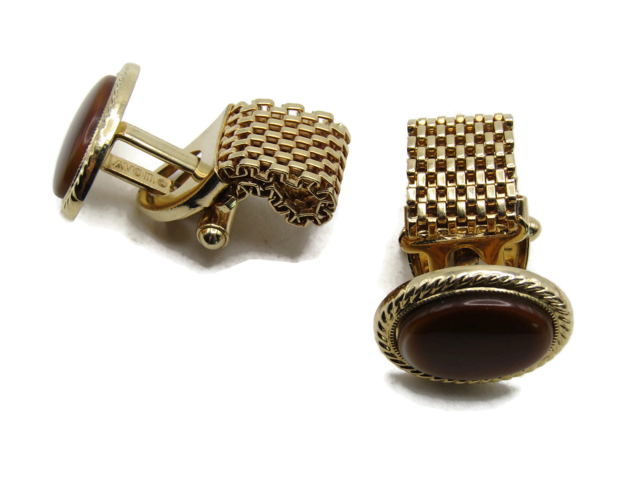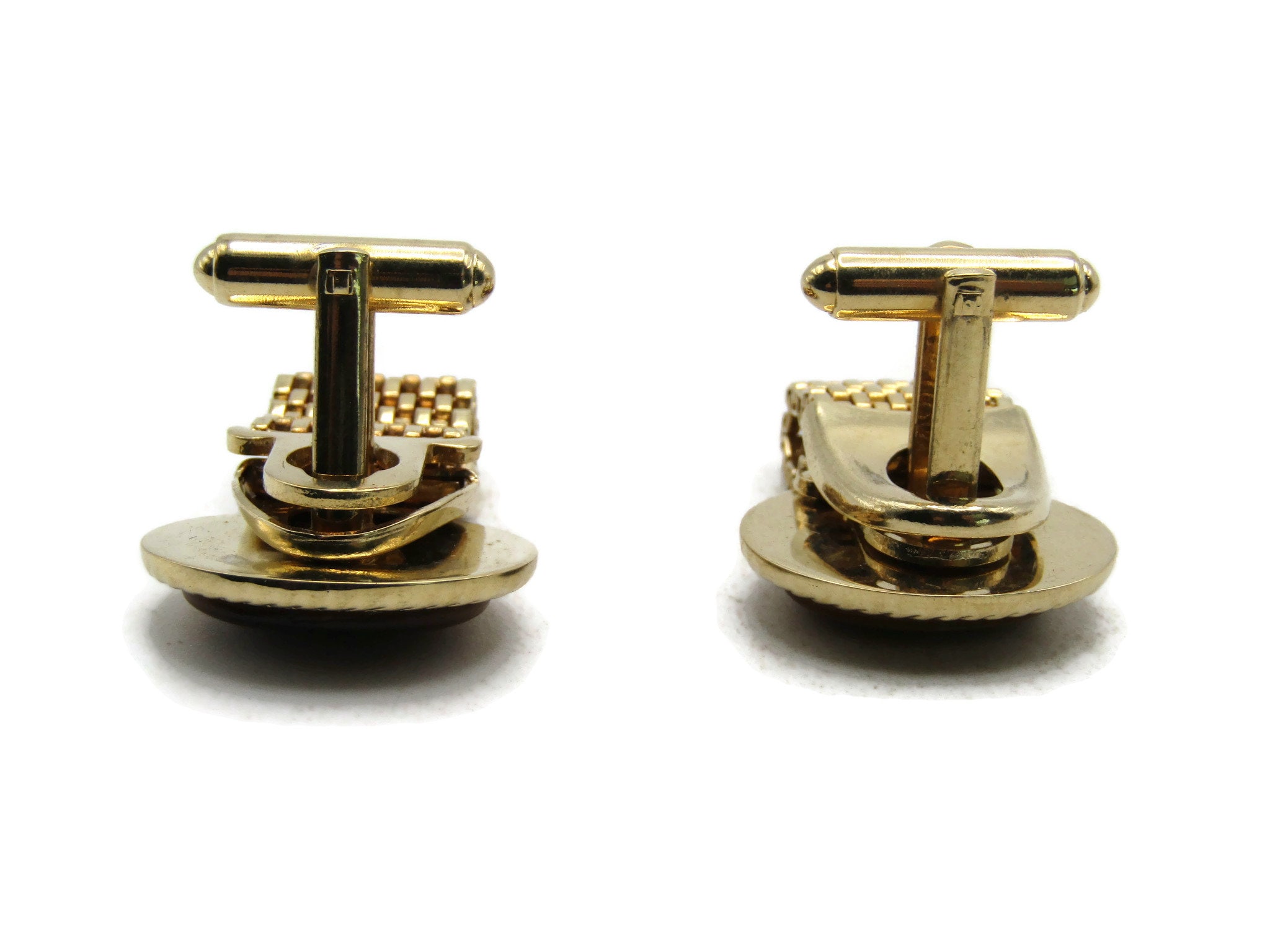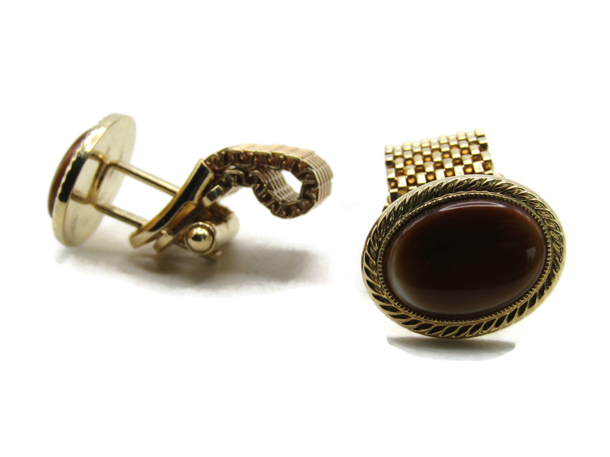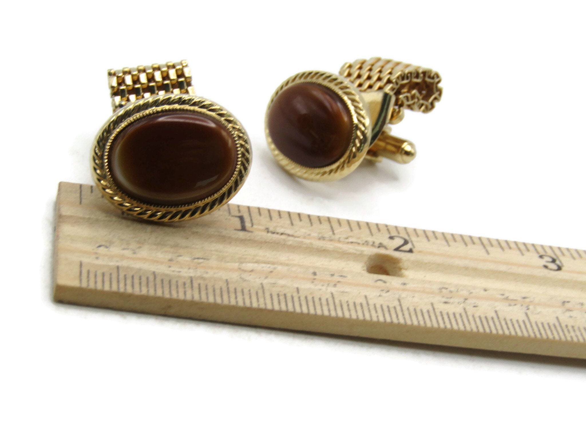 Brown Stone Inlay Chain Cuff Links Gold Tone Men's Jewelry