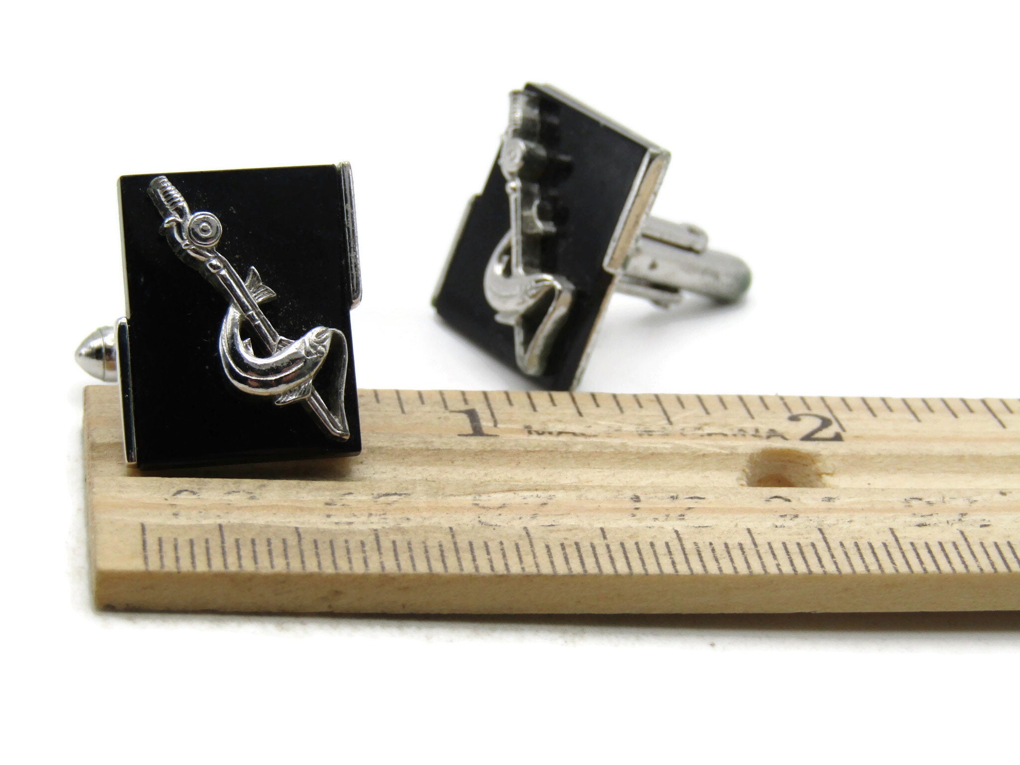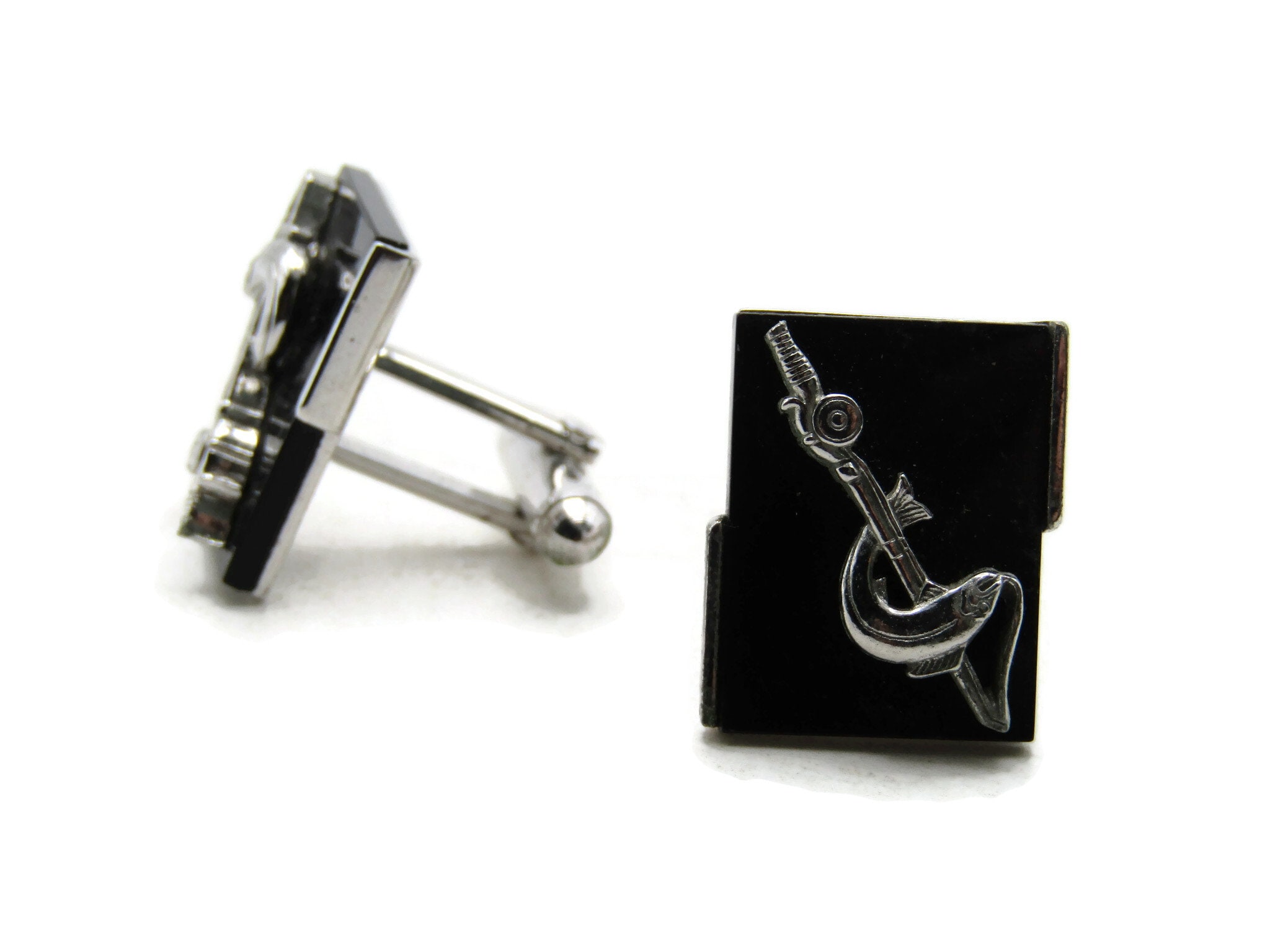 Fish & Fishing Rod Cuff Links Black Background Silver Tone Men's Jewelry