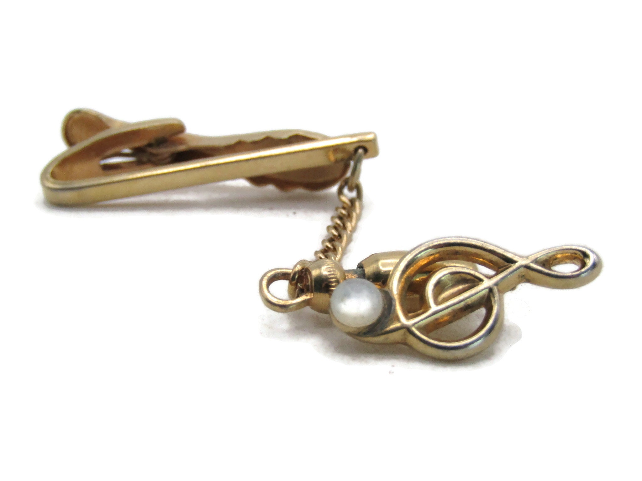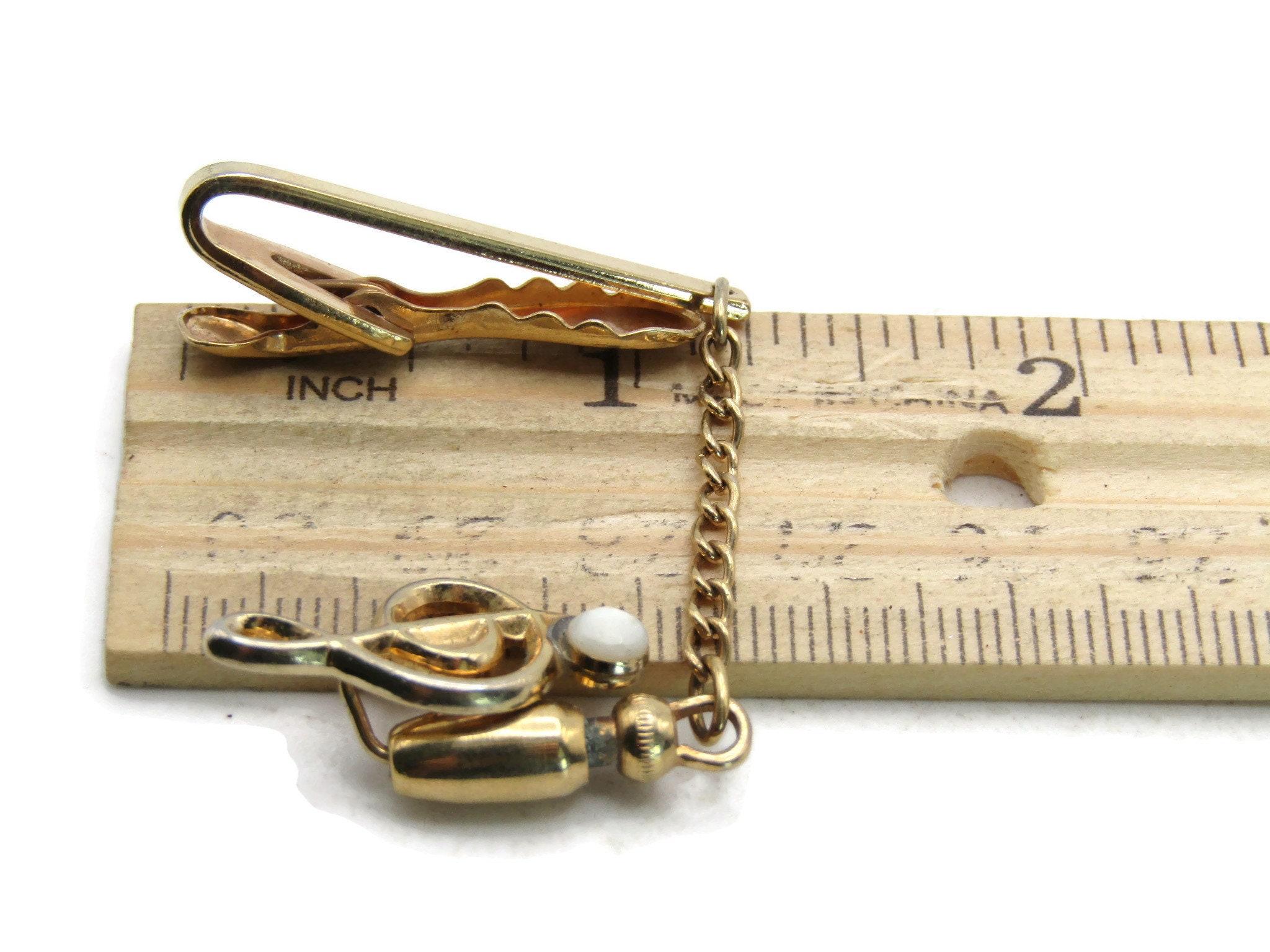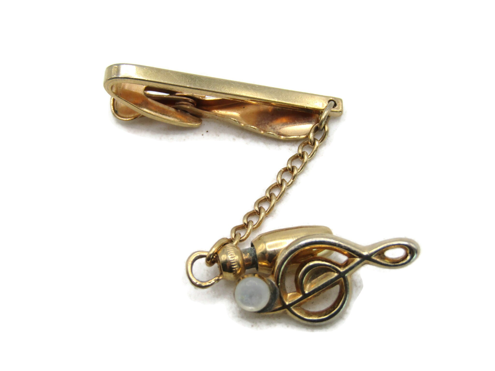 Stone Inlay Music Note Tie Clip & Chain Set Musician Gift Gold Tone Tie Bar Men's Jewelry