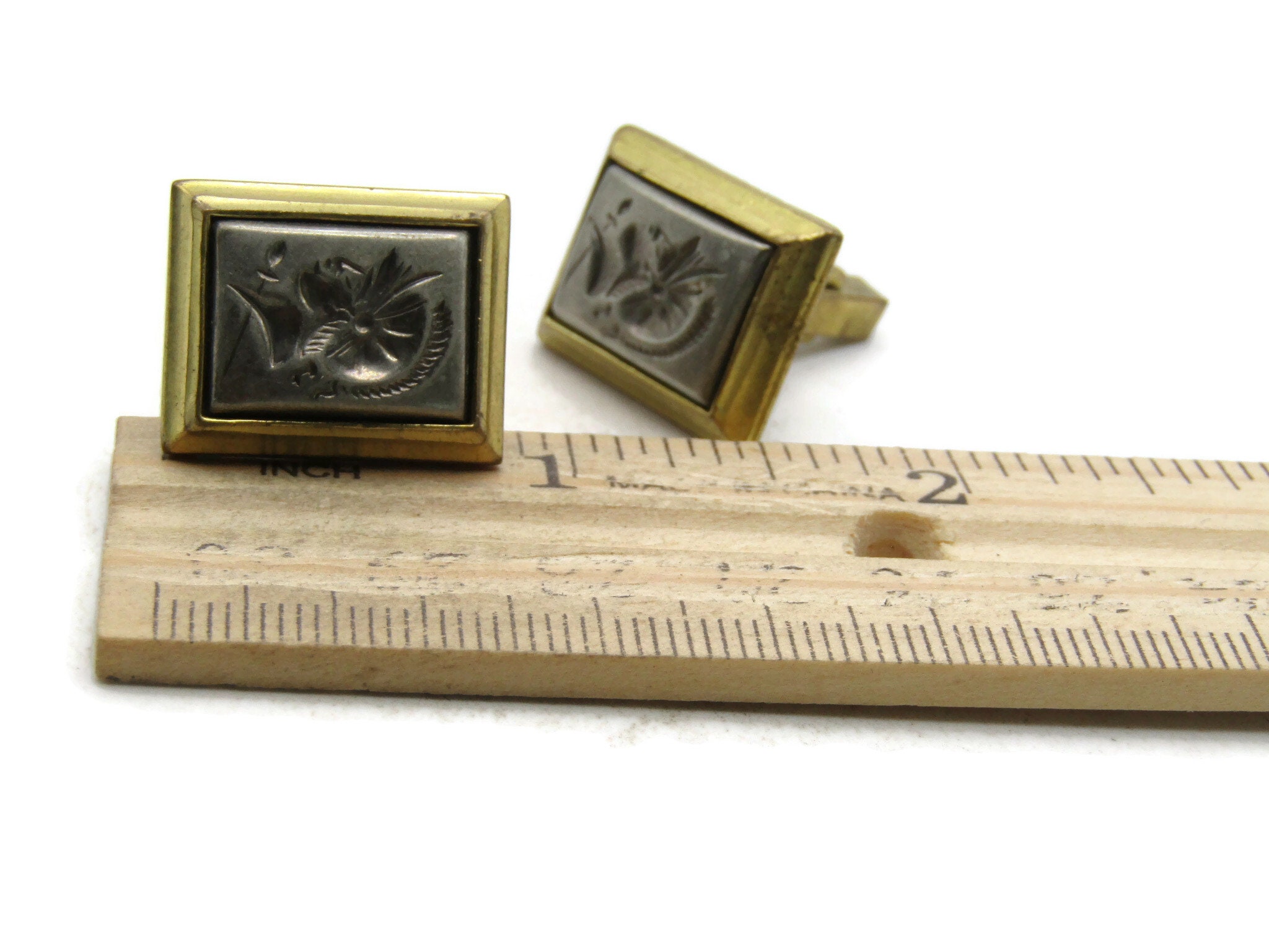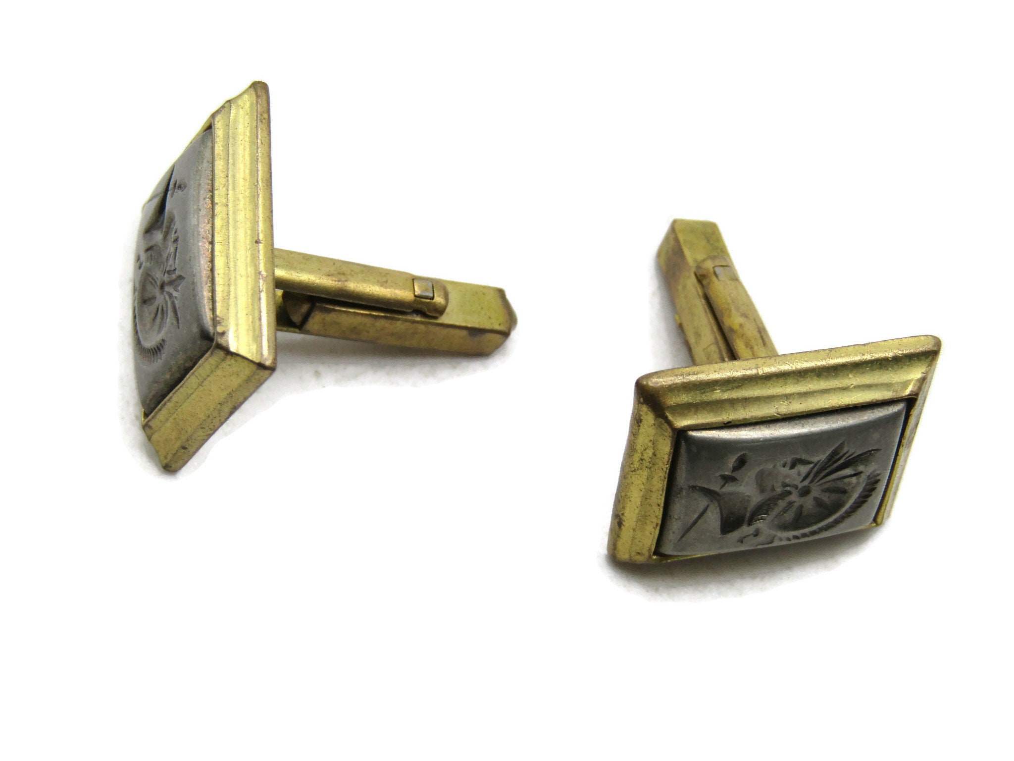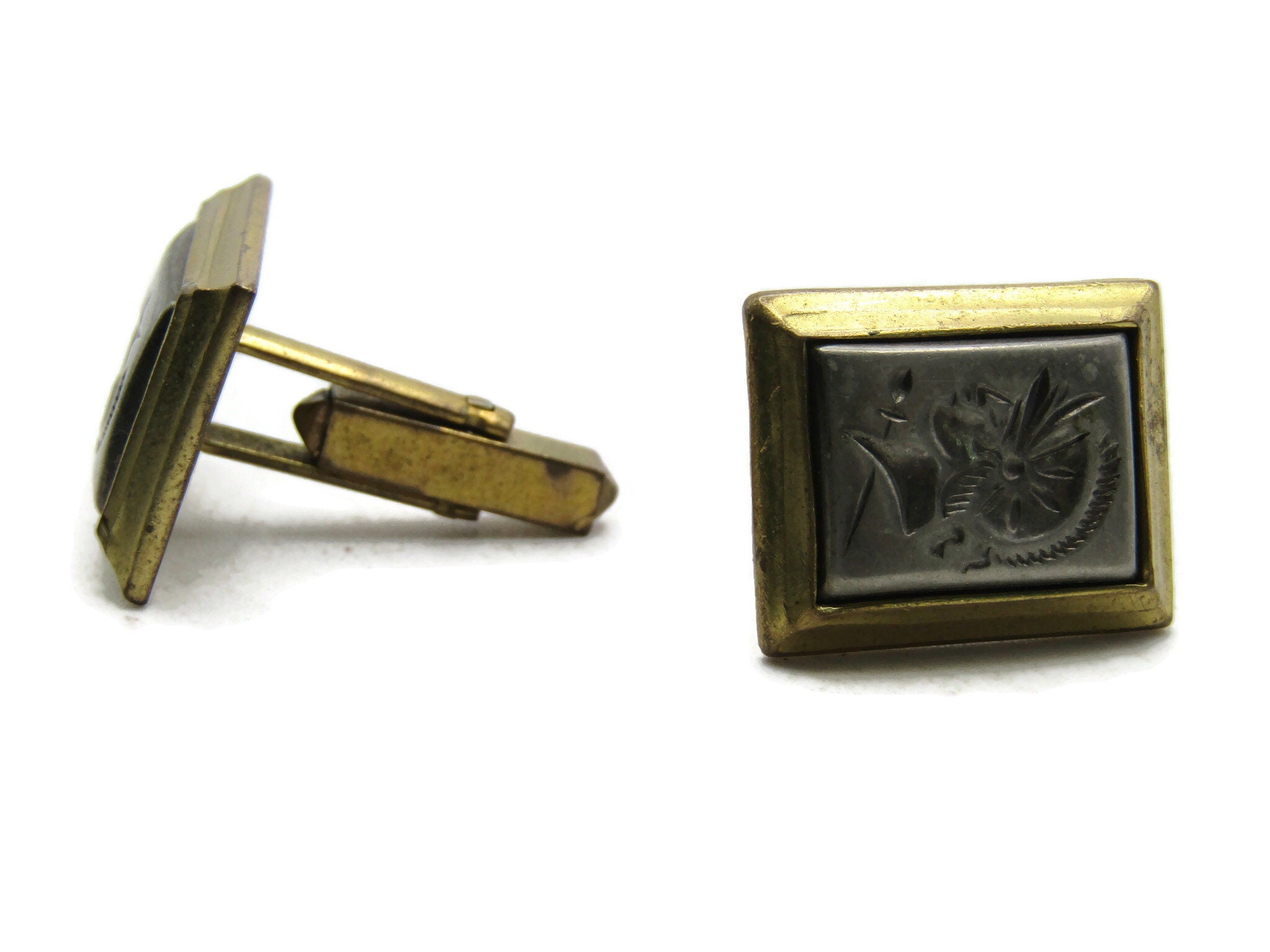 Floral Motif Silver Tone Inlay Cuff Links Gold Tone Men's Jewelry
