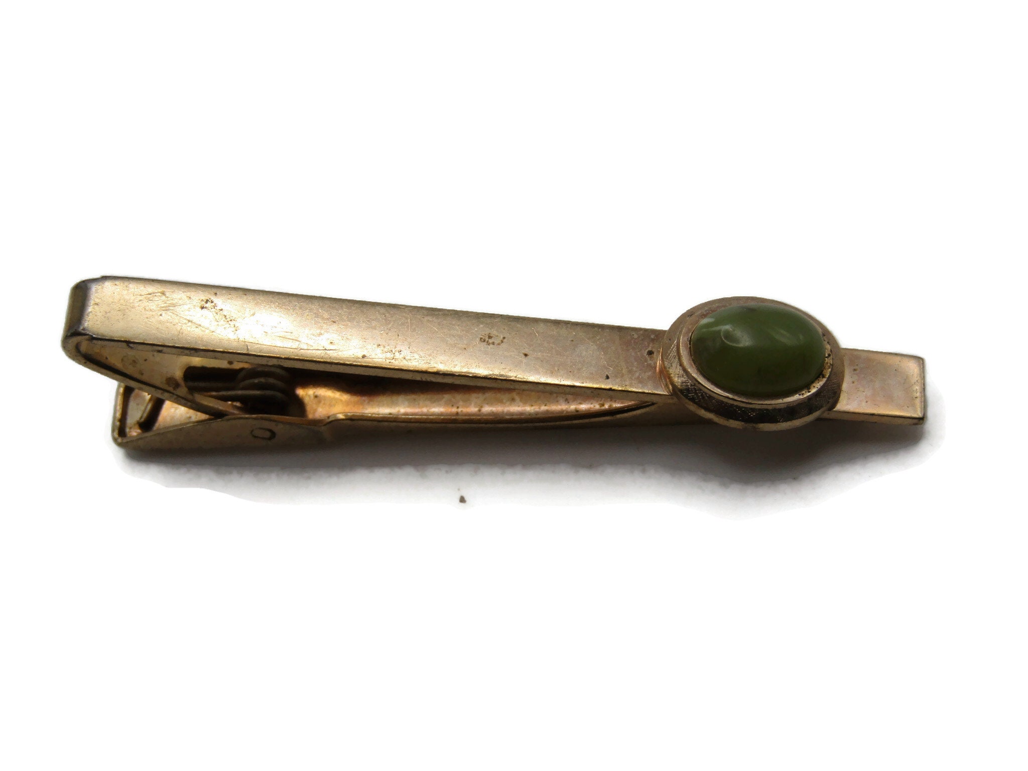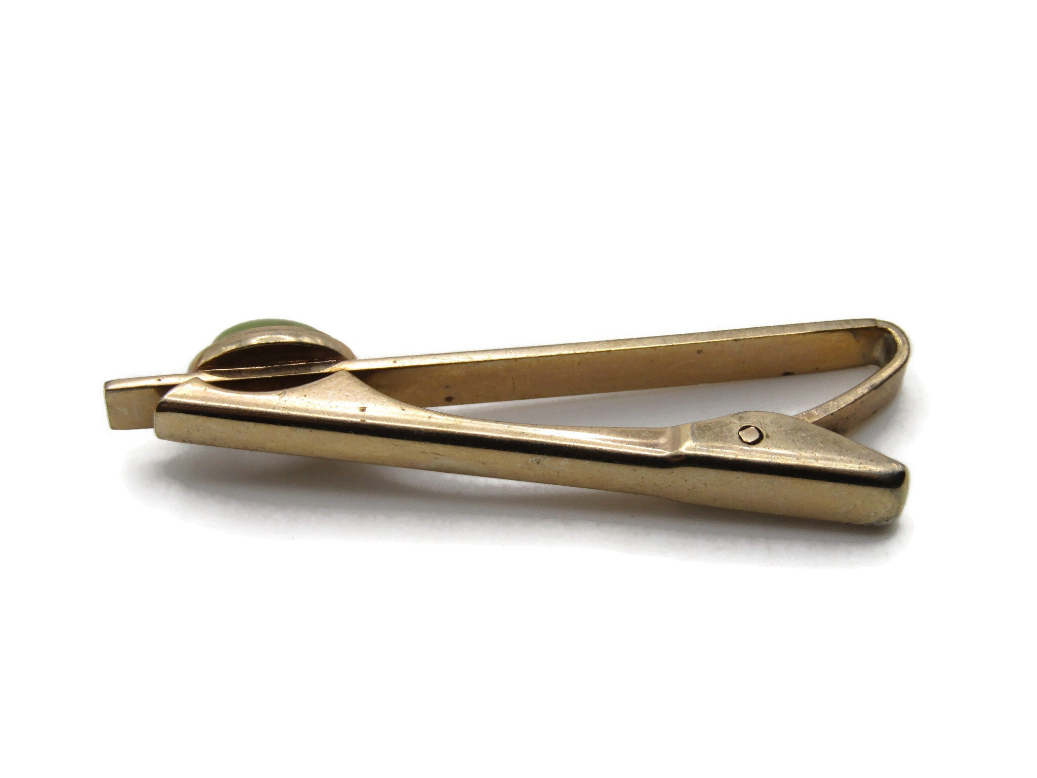 Light Green Stone Inlay Modernist Tie Clip Tie Bar Men's Jewelry Gold Tone
