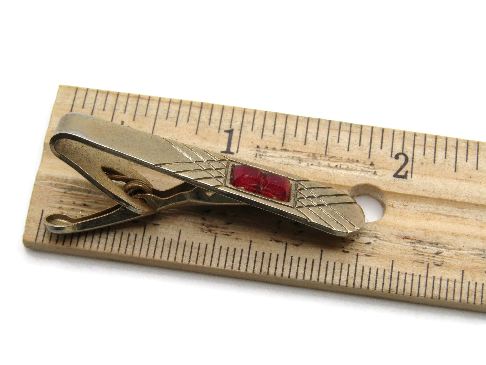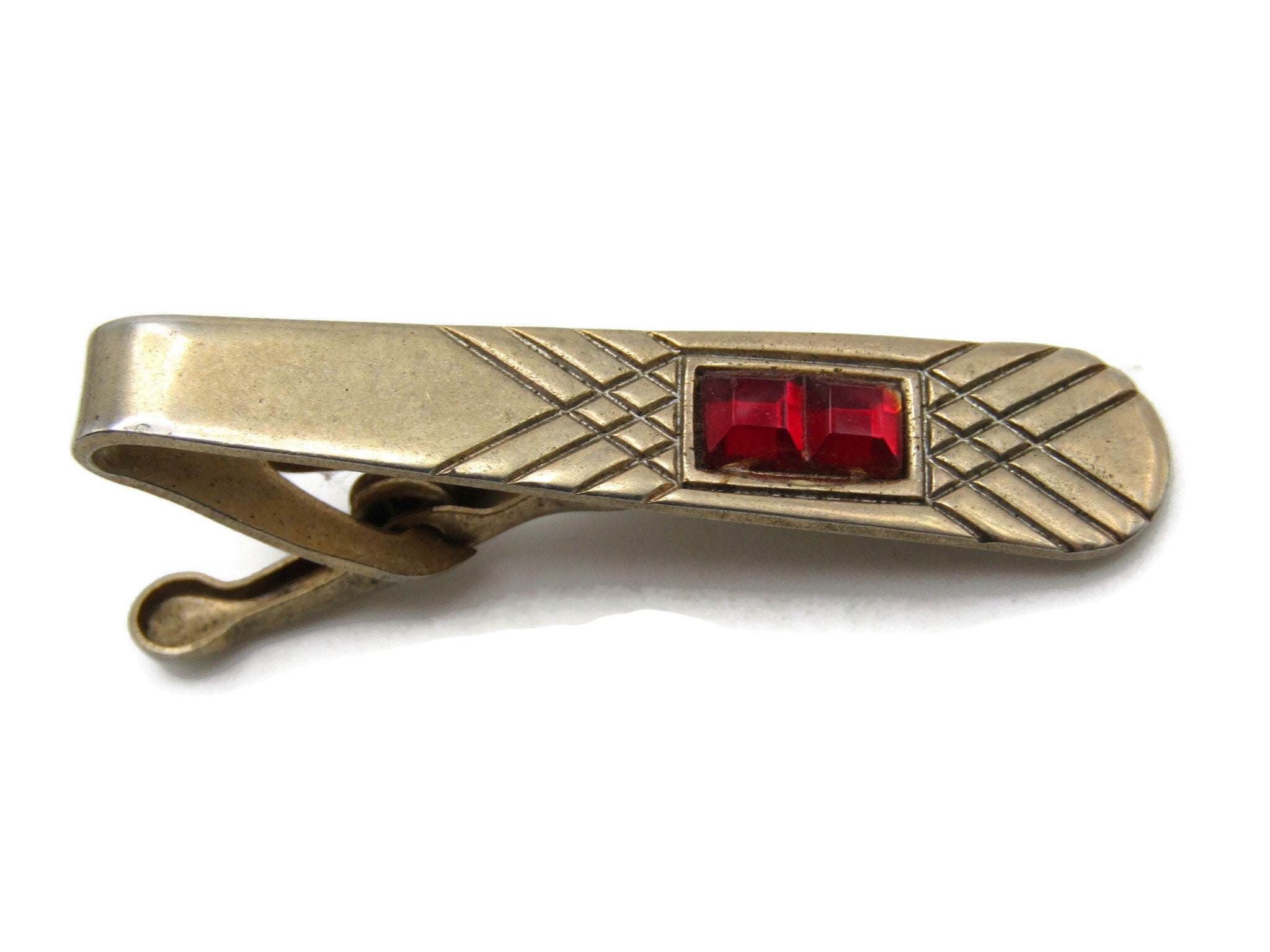 Red Stone Inlay Diagonal Lines Tie Clip Tie Bar Men's Jewelry Gold Tone