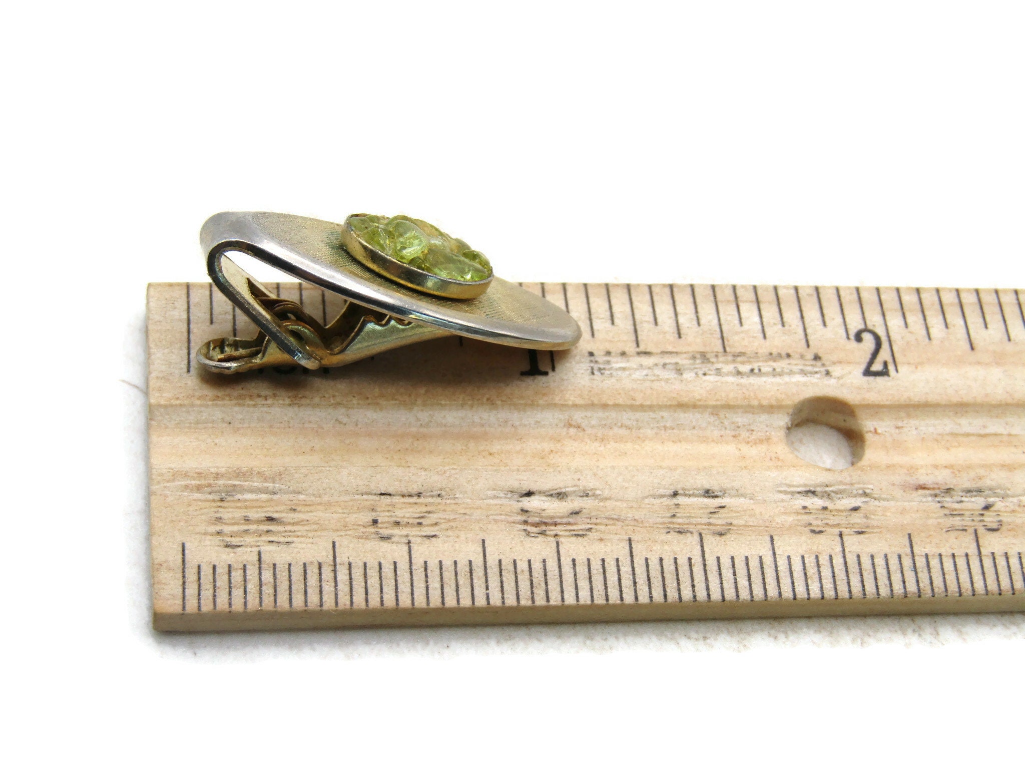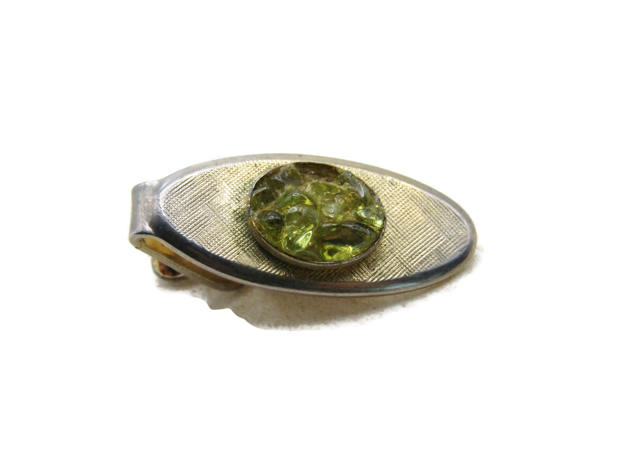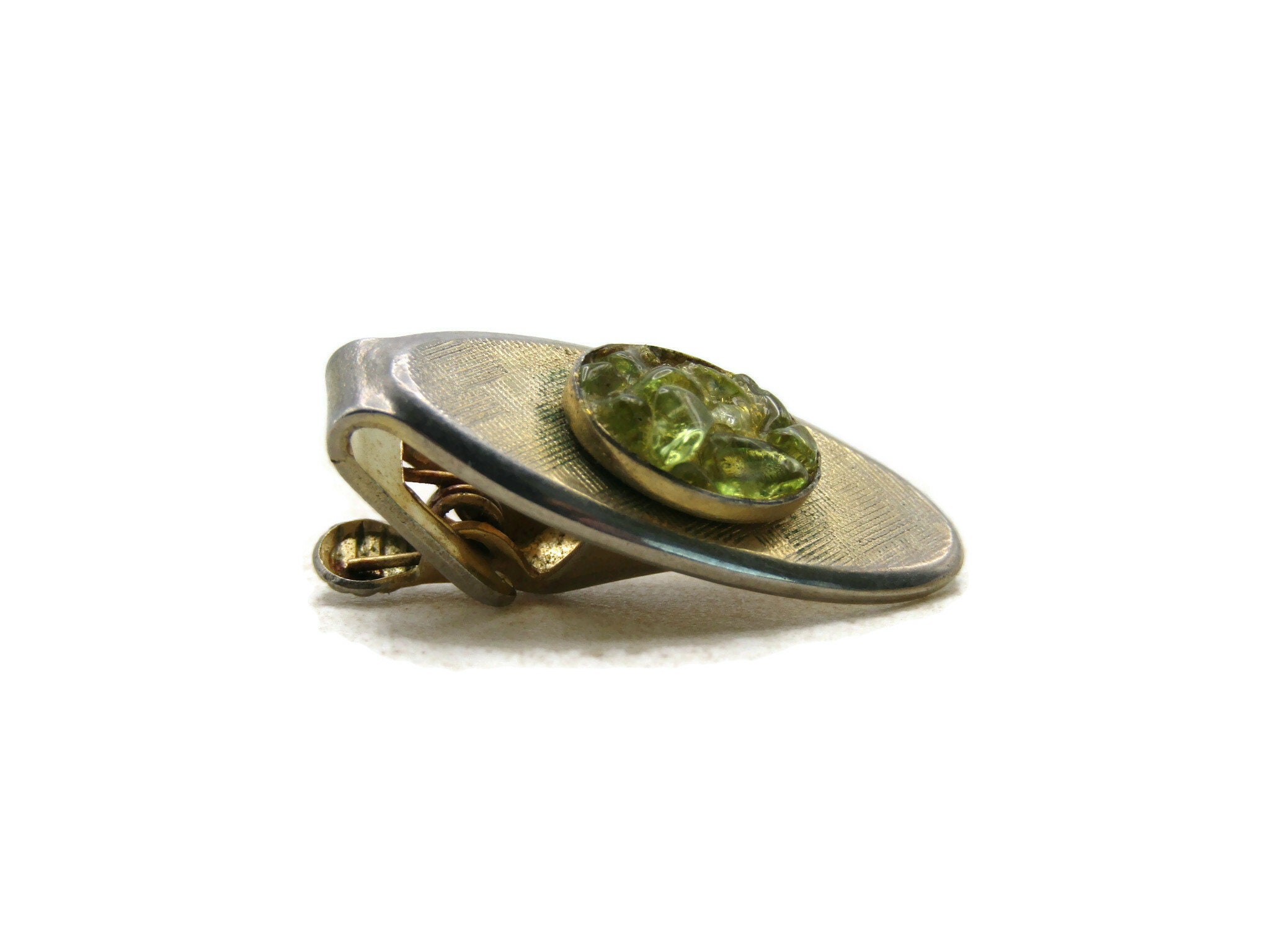 Oval & Green Stone Inlay Tie Bar Tie Clip Men's Jewelry Gold Tone