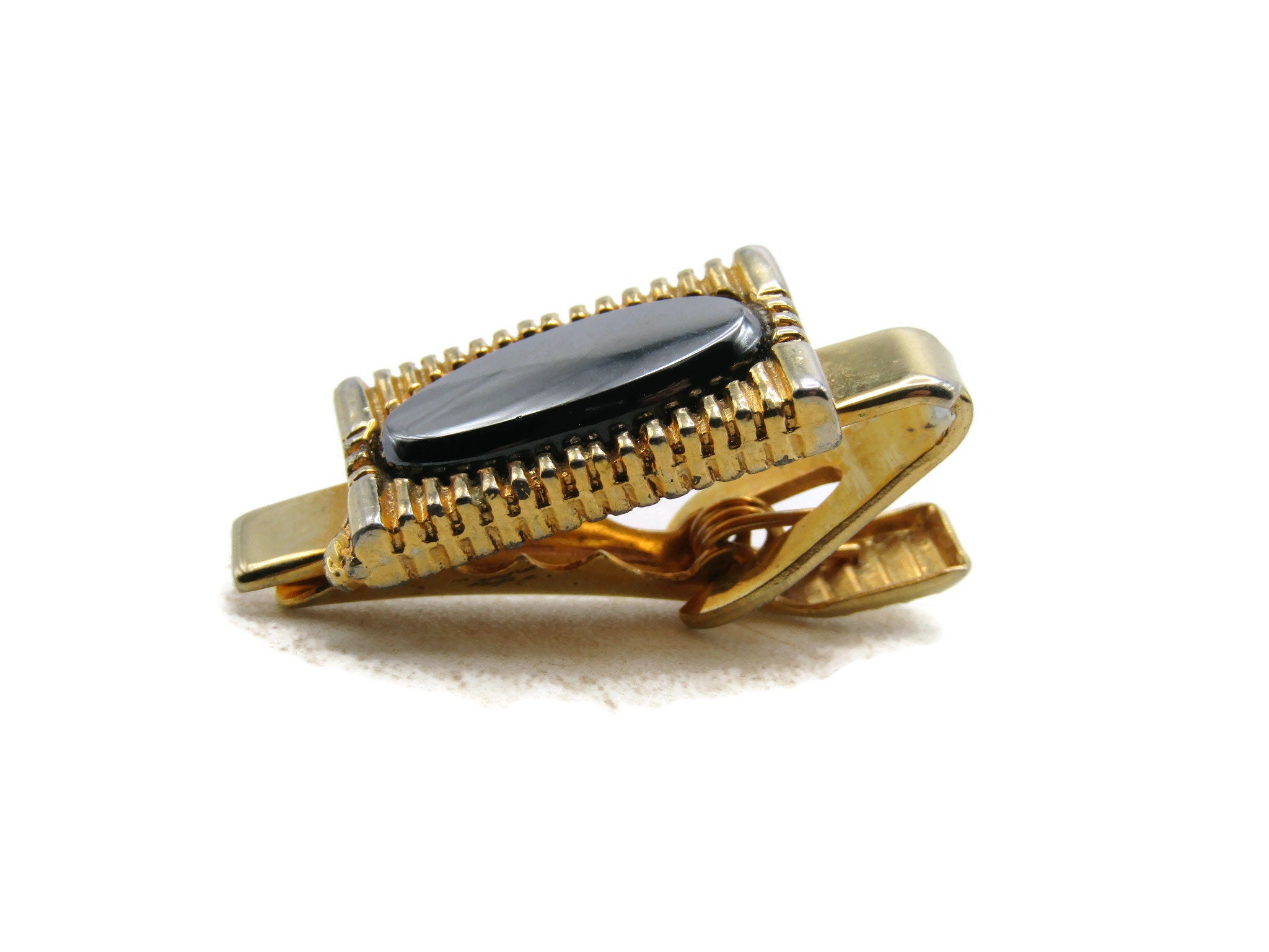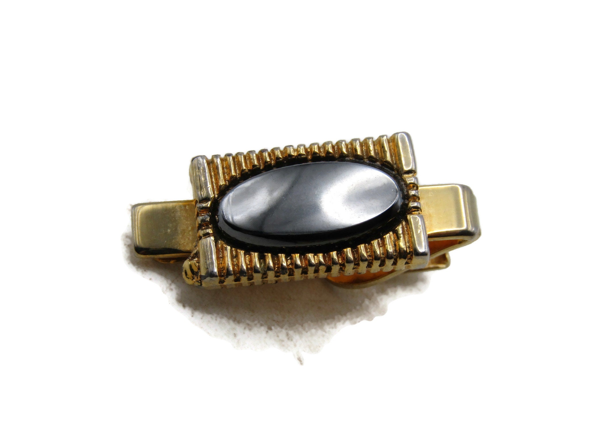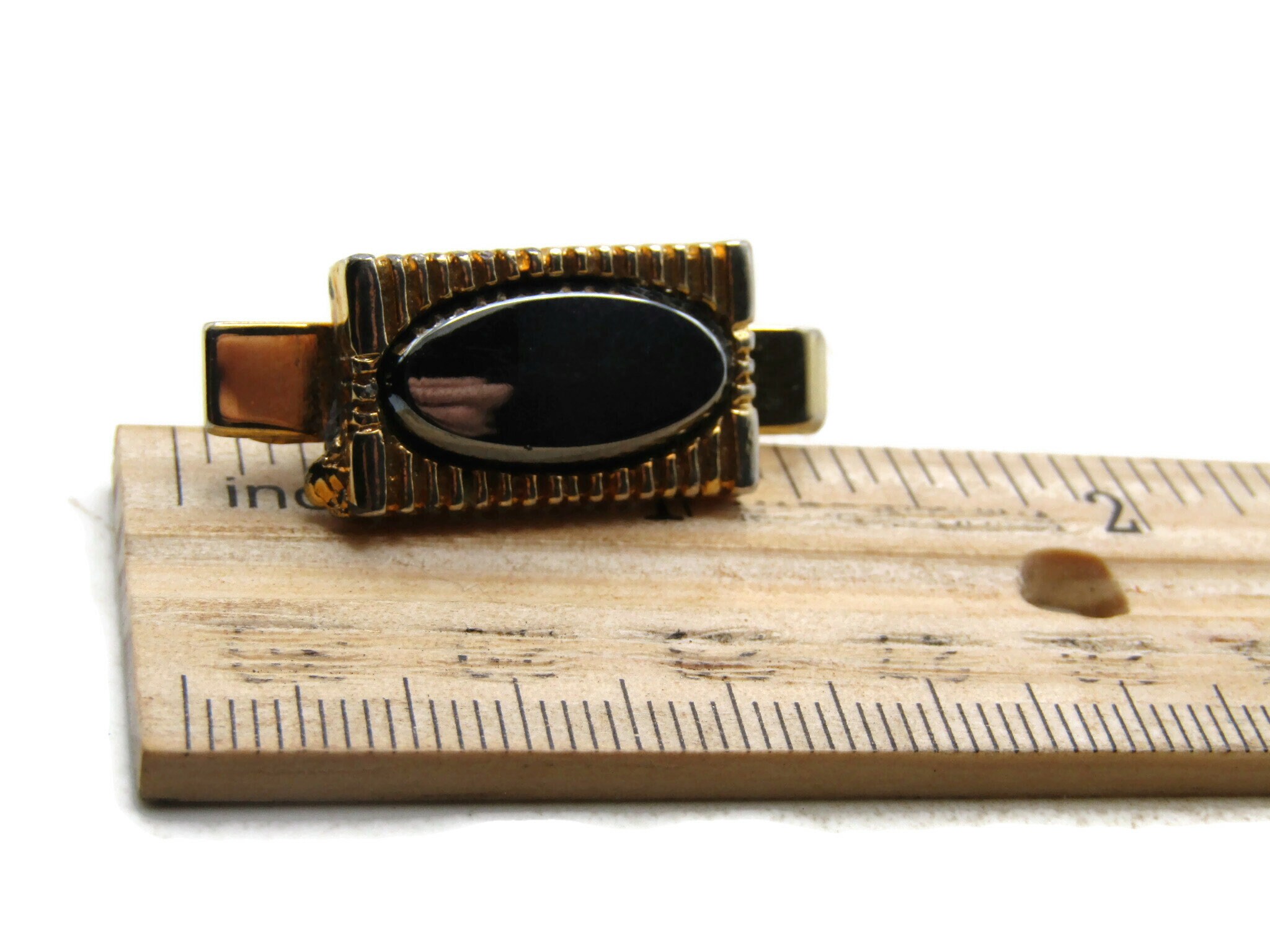 Shiny Black Oval Stone & Etched Line Design Tie Clip Tie Bar Men's Jewelry Gold Tone