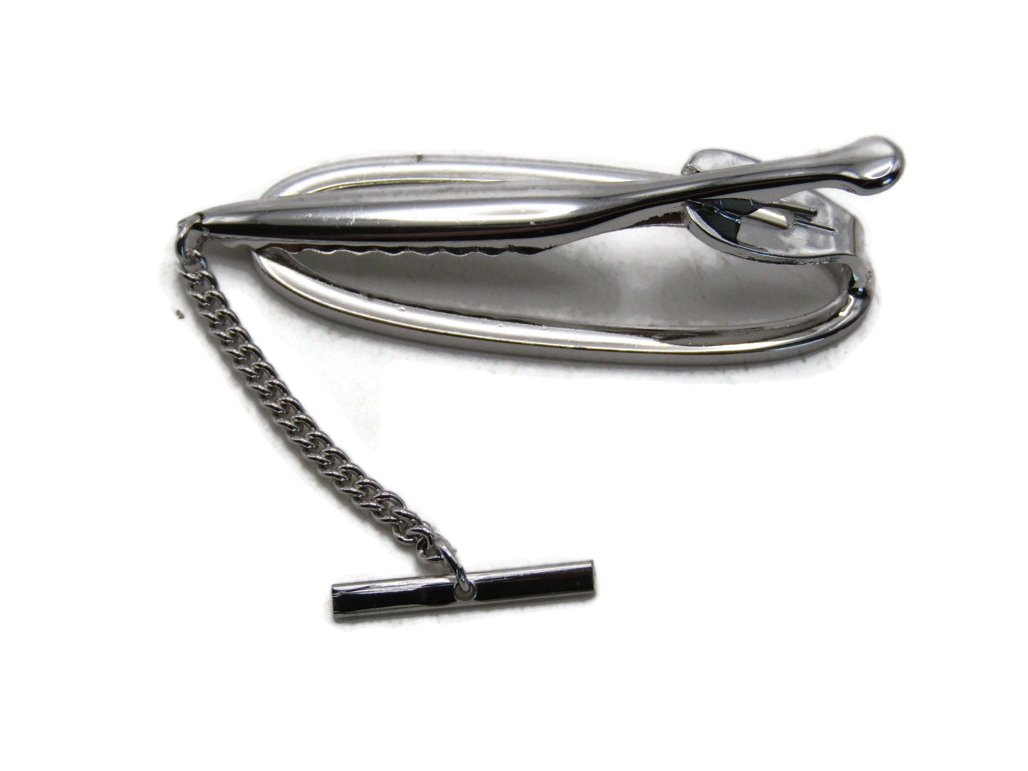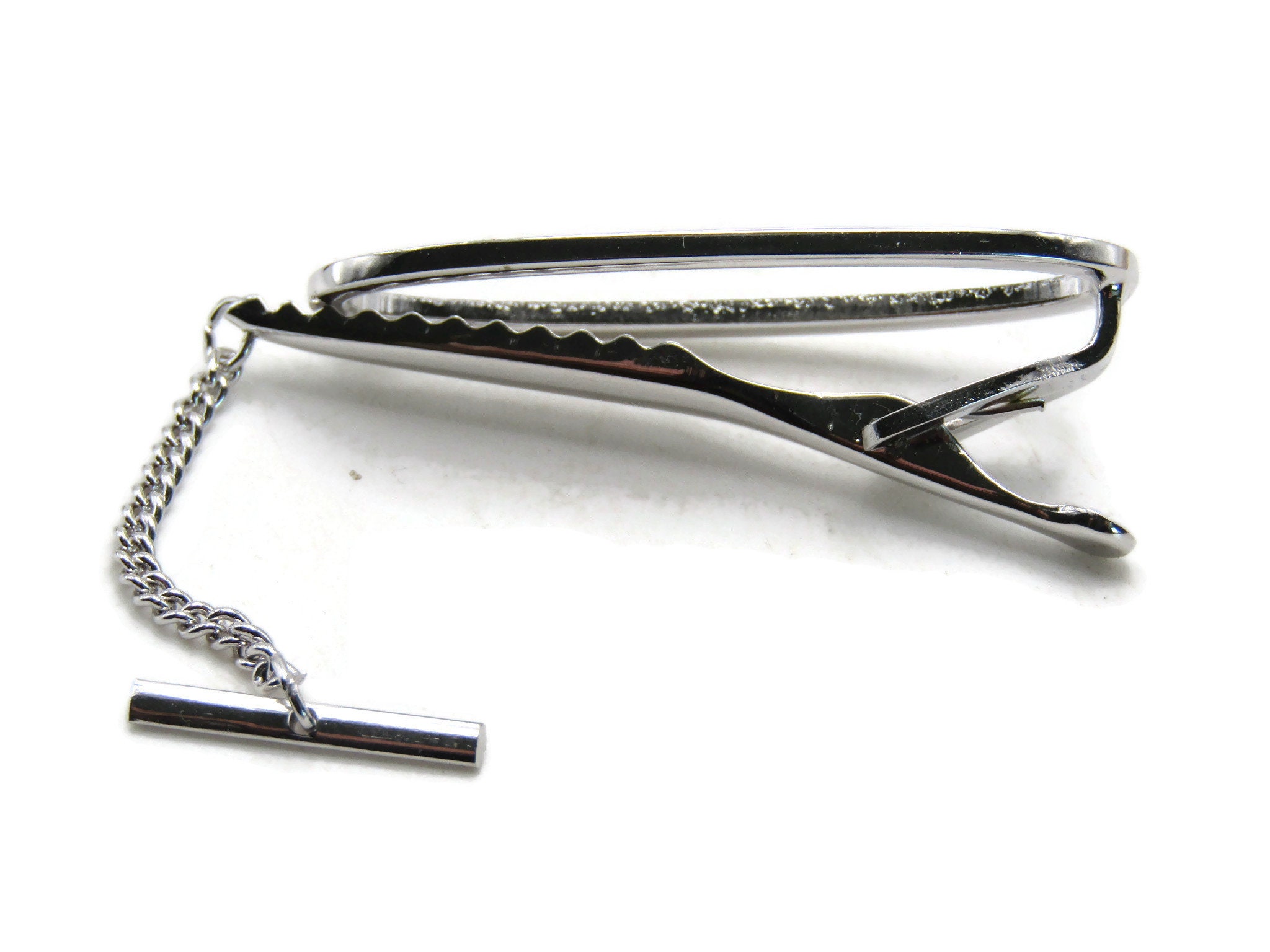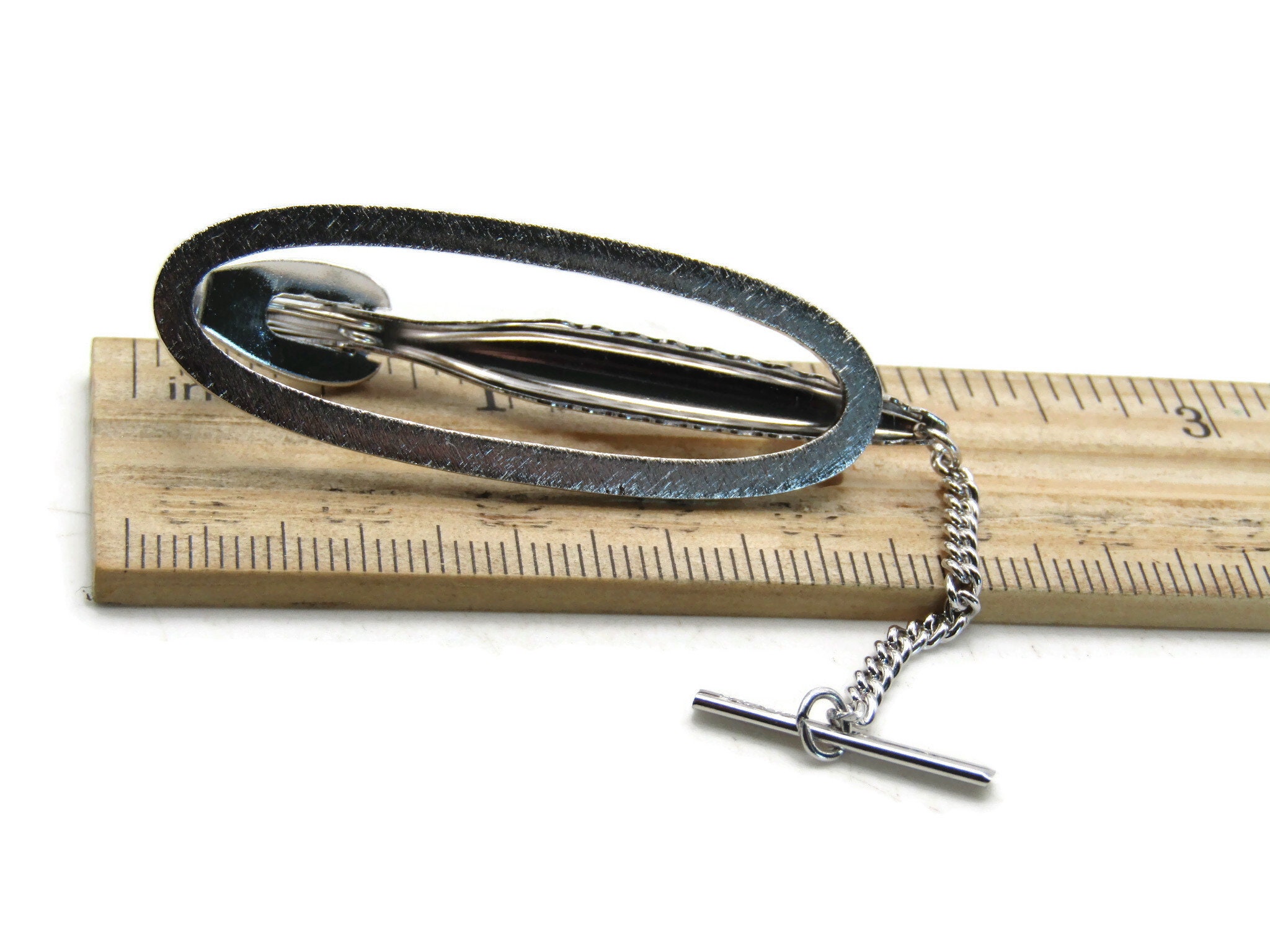 Open Textured Oval Tie Clip With Chain Tie Bar Men's Jewelry Silver Tone