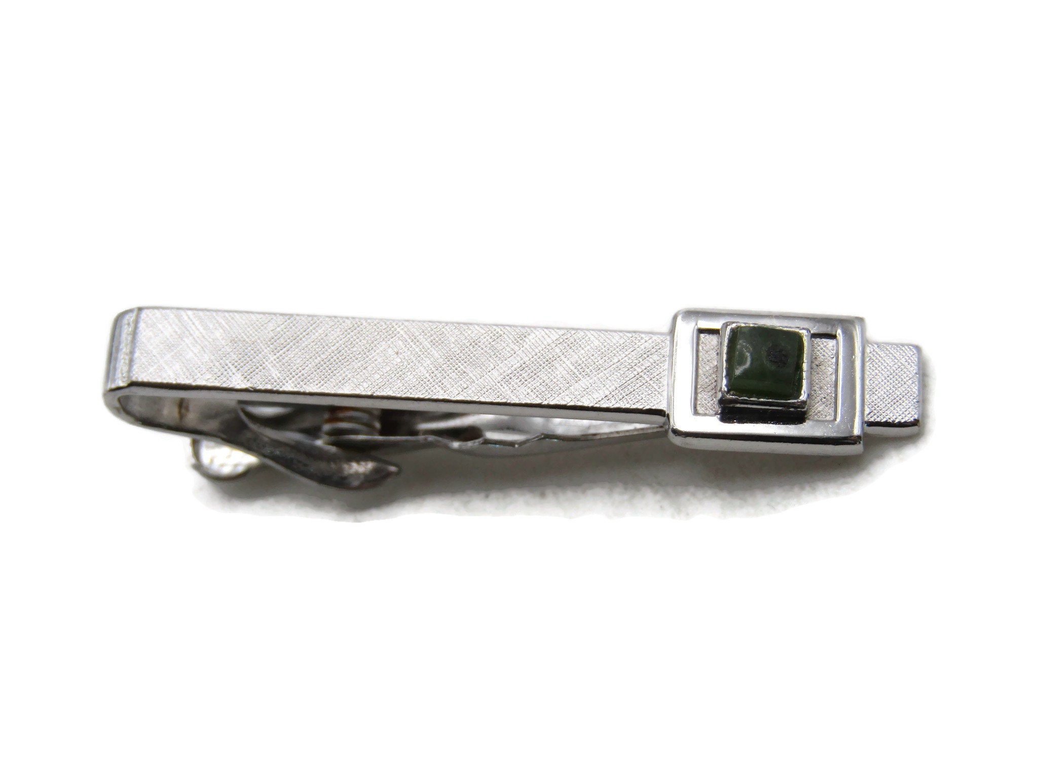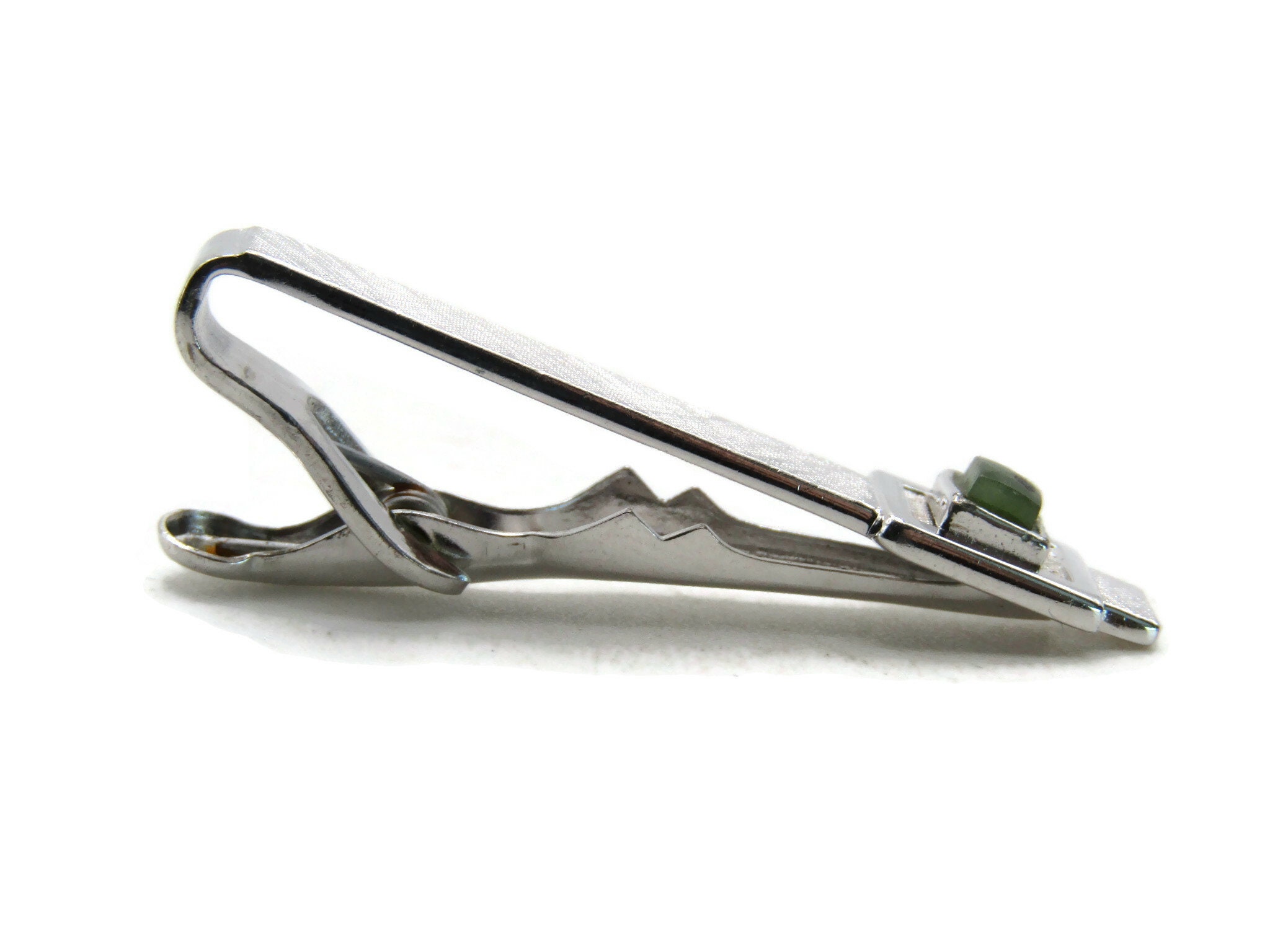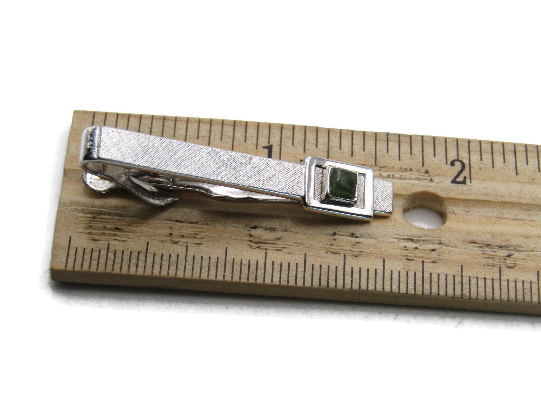 Green Stone Inlay Brushed Finished Tie Bar Tie Clip Men's Jewelry Silver Tone
