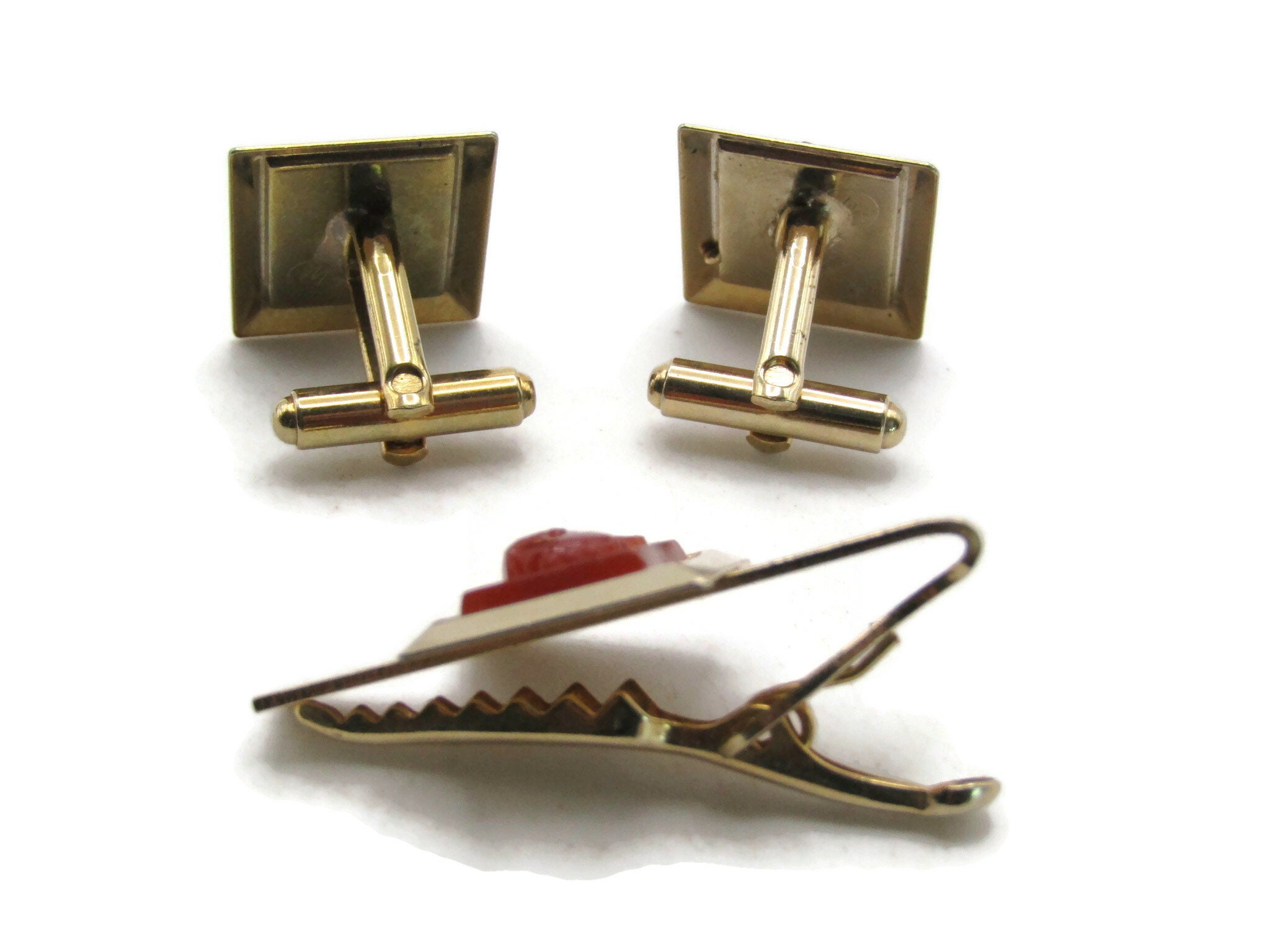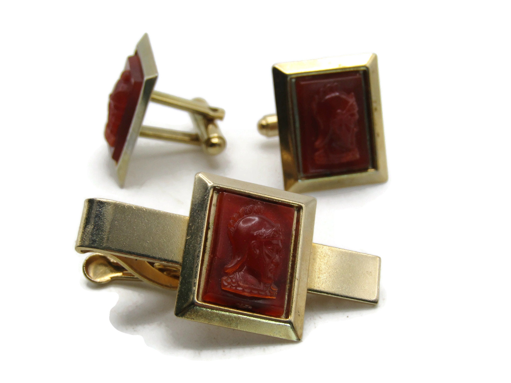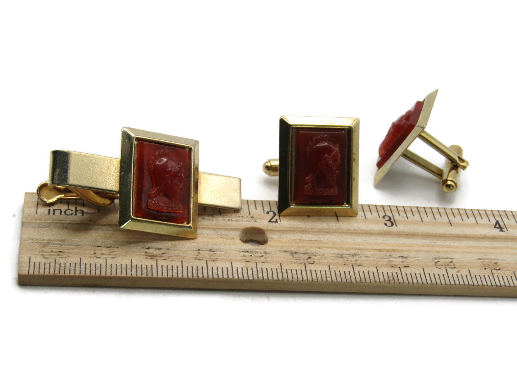 Red Stone Roman Head Tie Clip And Cuff Links Set Men's Jewelry Gold Tone