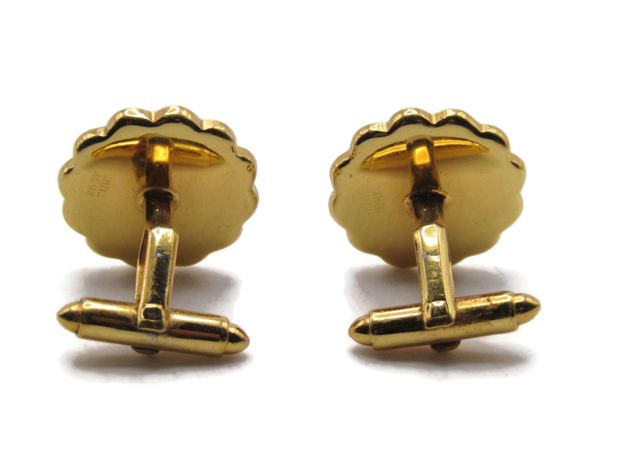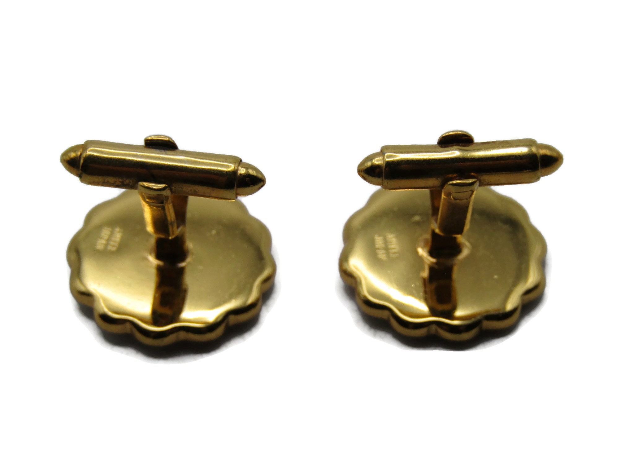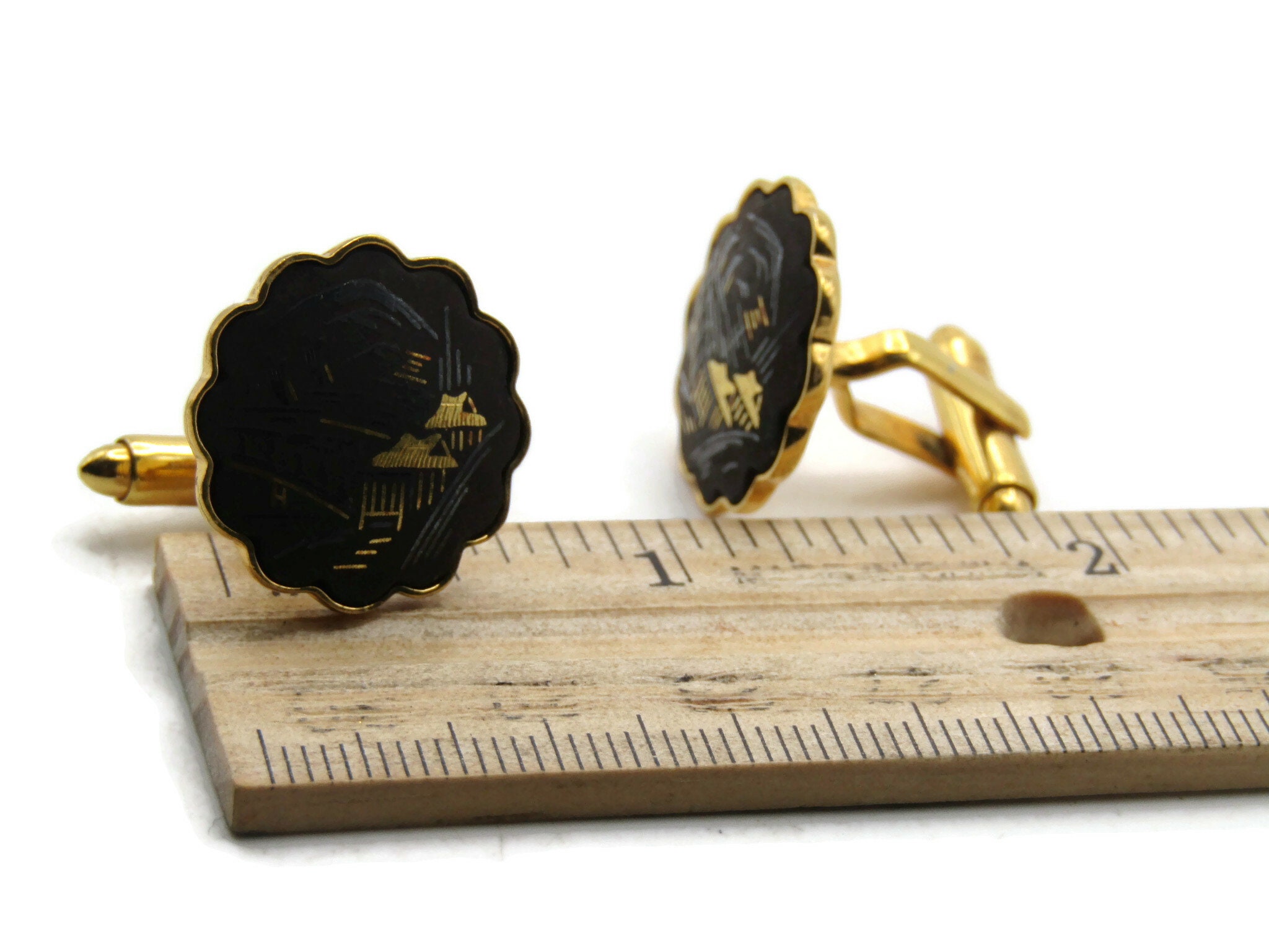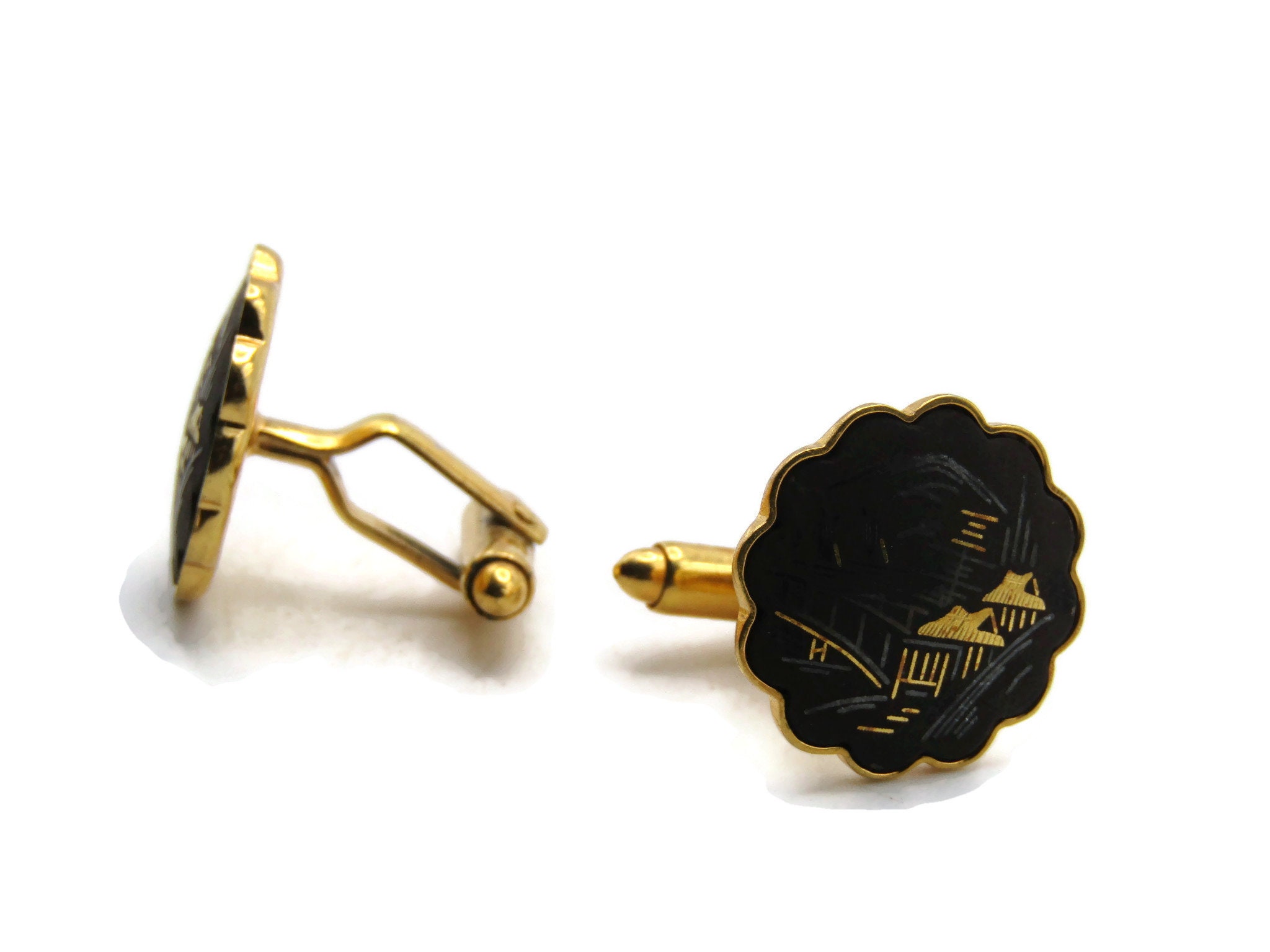 Houses And Bridge Scene Cuff Links Scalopped Edge Men's Jewelry Black & Gold Tone