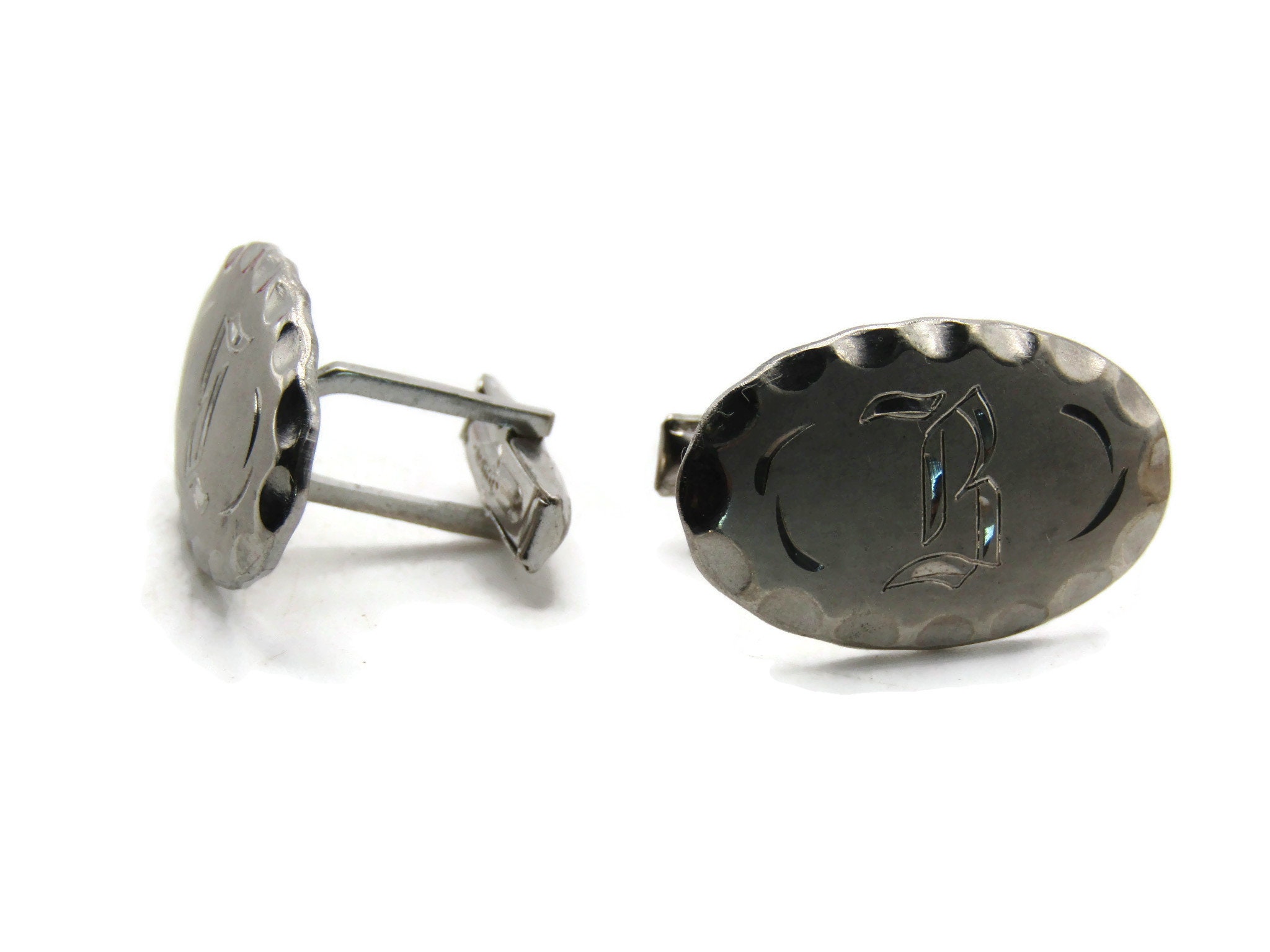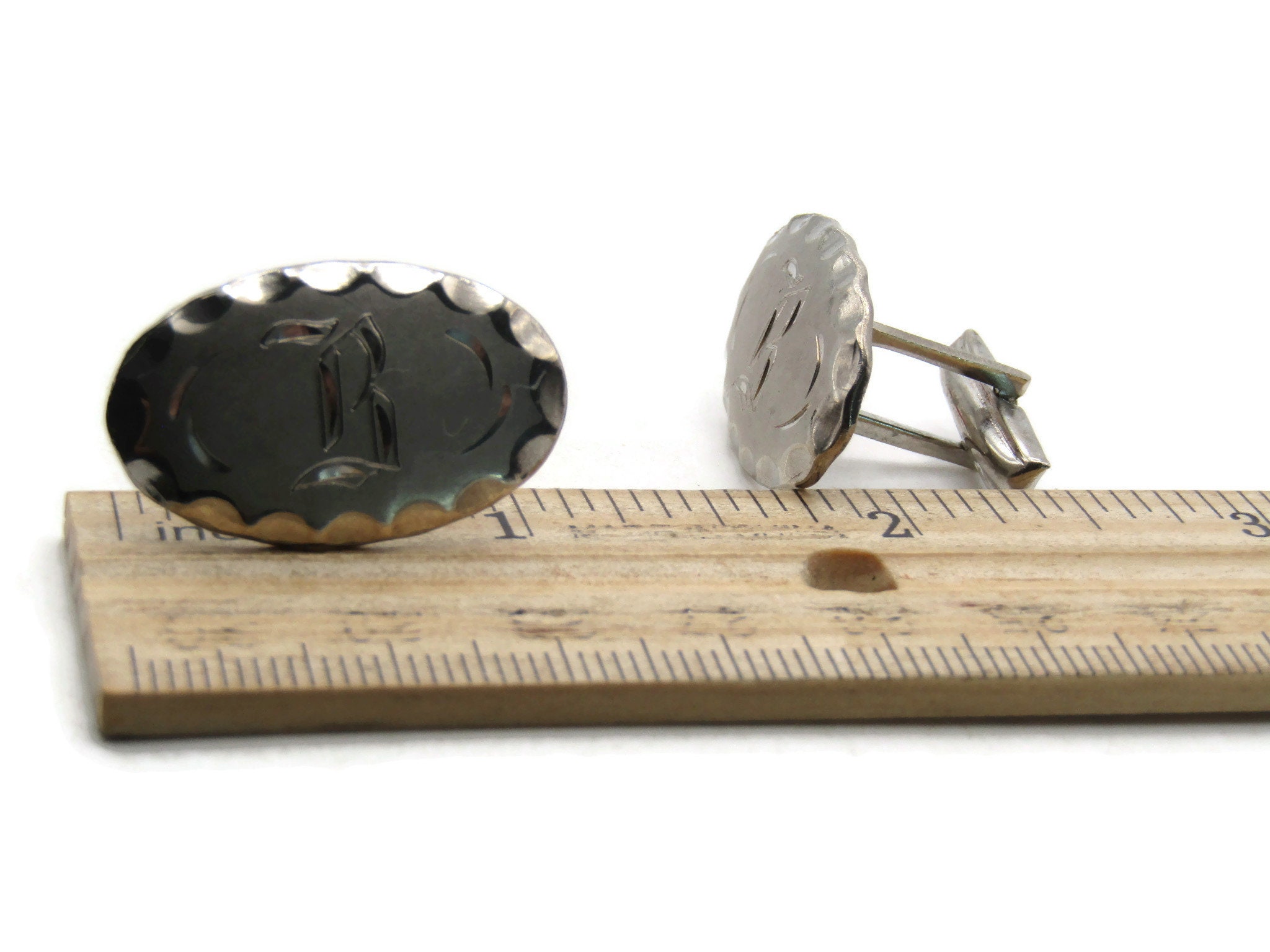 B Letter Initial Monogram Oval Beveled Edge Cuff Links Men's Jewelry Silver Tone