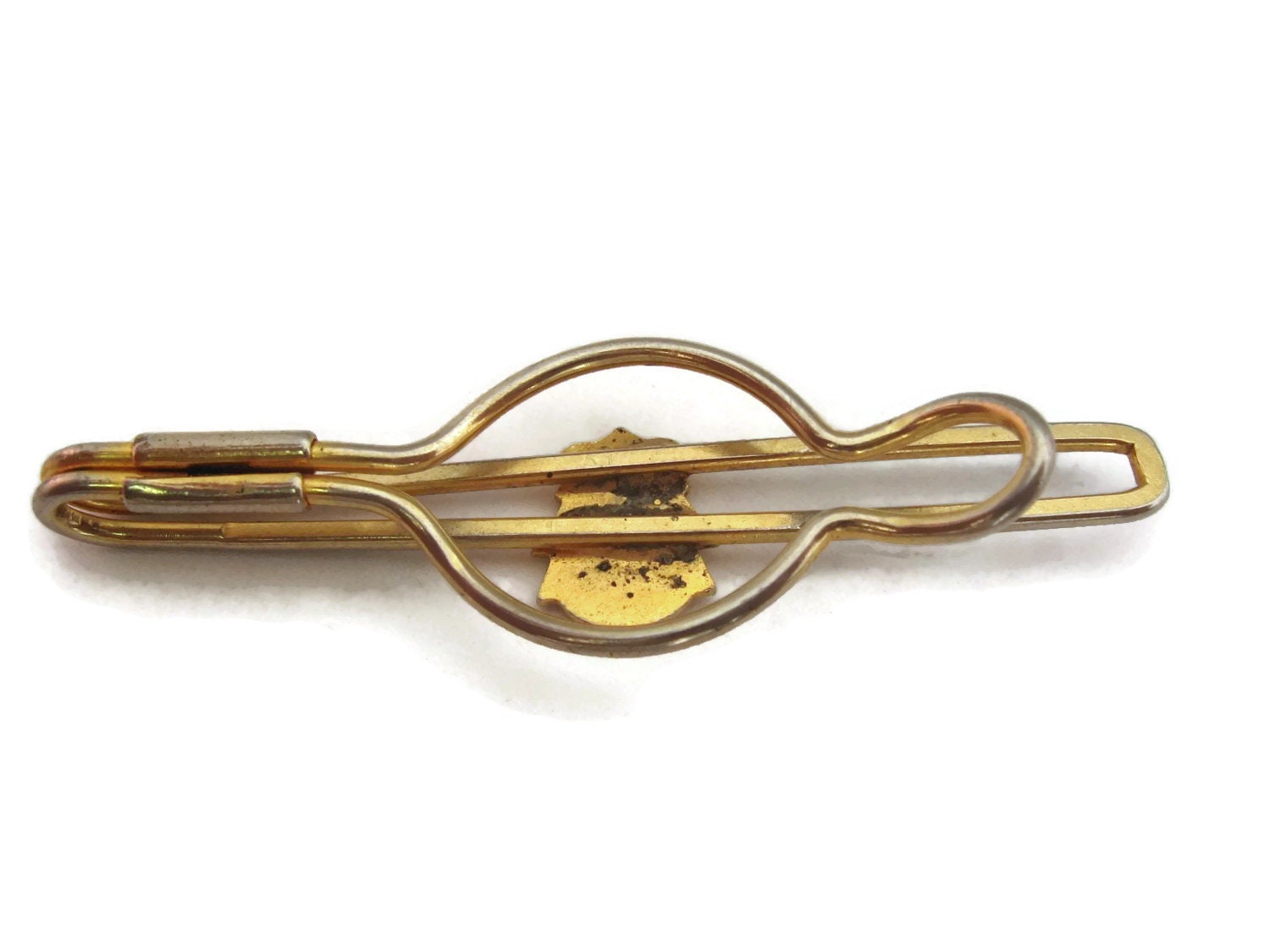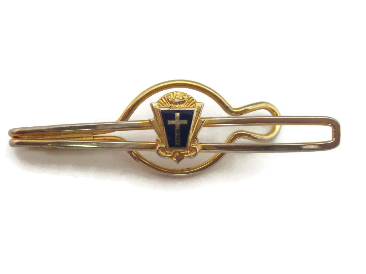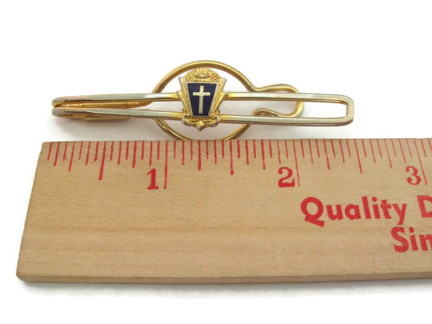 Vintage Men's Tie Bar Clip Jewelry: Cross on Blue Enamel Open Design Faded Gold Tone