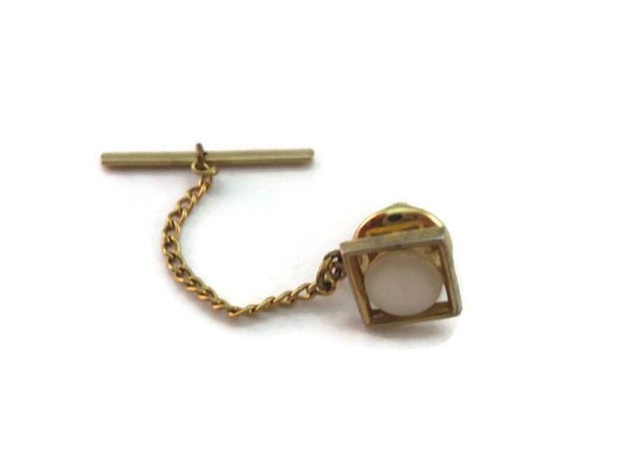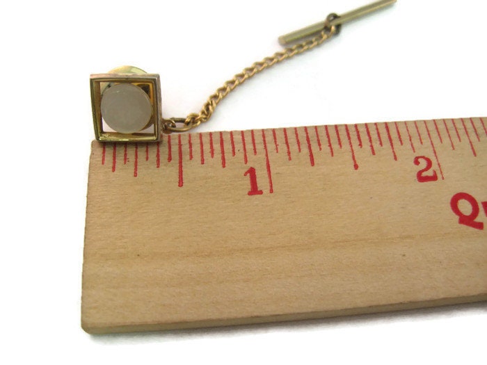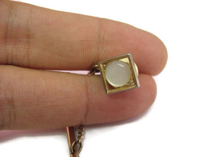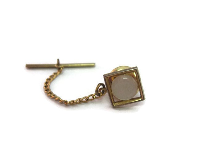 Vintage Men's Tie Tack Pin Jewelry: Opalescent Milky White Accent Gold Tone Open Square Design
