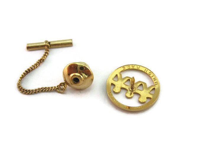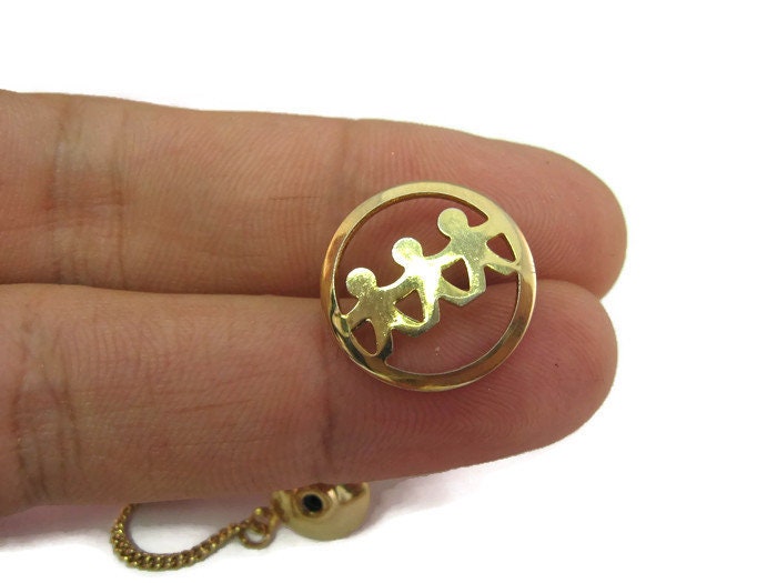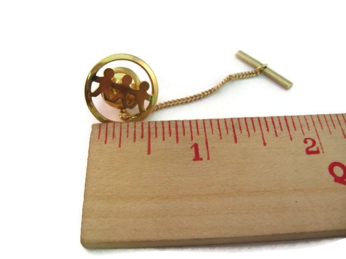 Vintage Men's Tie Tack Pin Jewelry: Three People Holding Hands Gold Tone Circle See Through Design