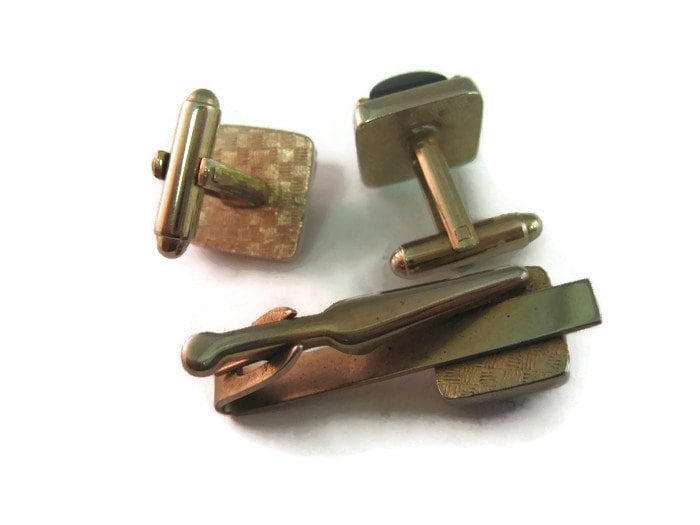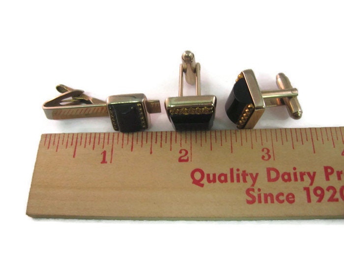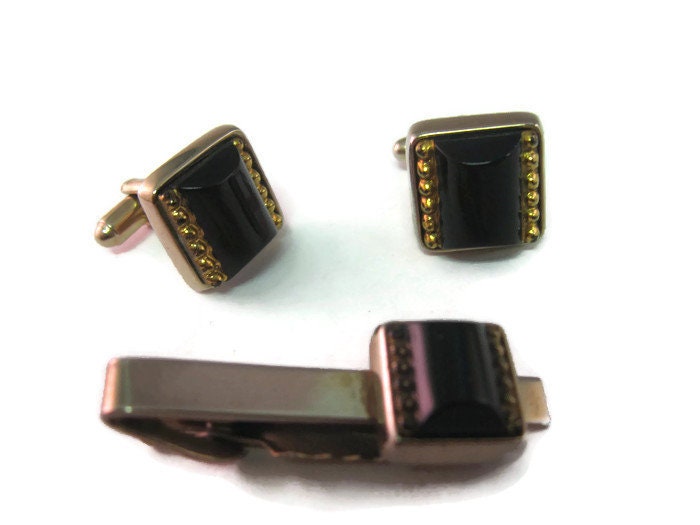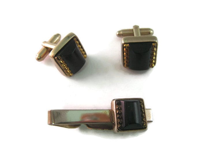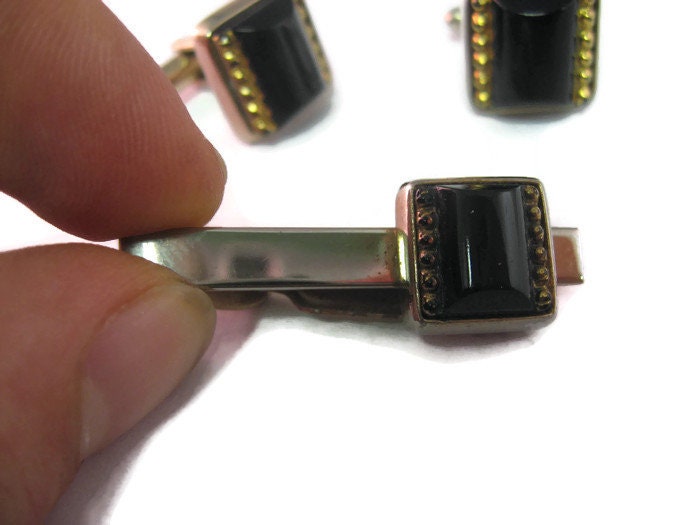 Vintage Men's Jewelry Set Tie Bar Cufflinks: Stunning Black Glass Art Deco Style Design