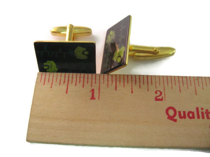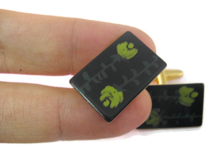 Vintage Cufflinks for Men: Wonderful Black Enamel Green Painted Roses Flower Design