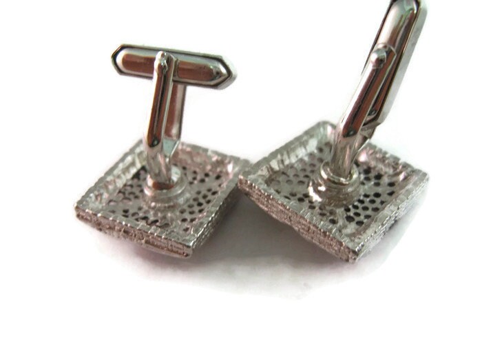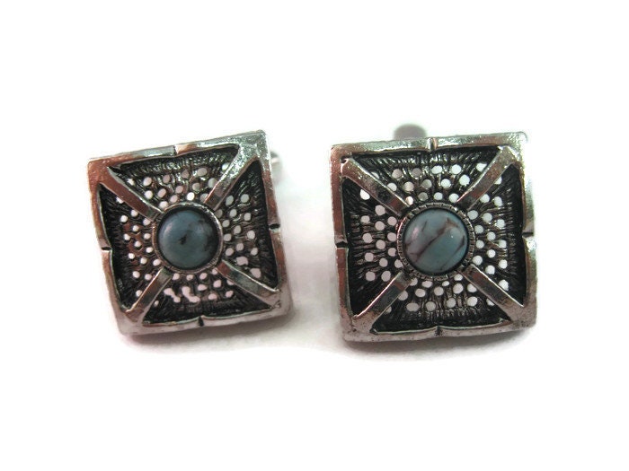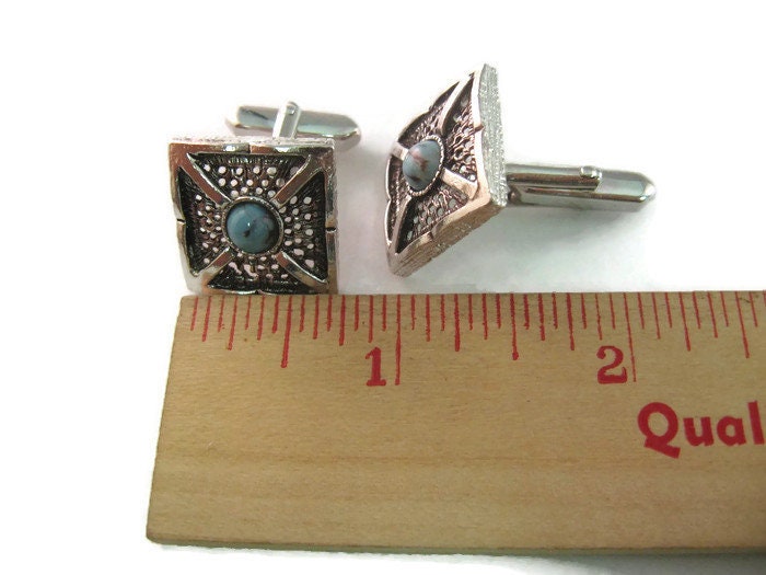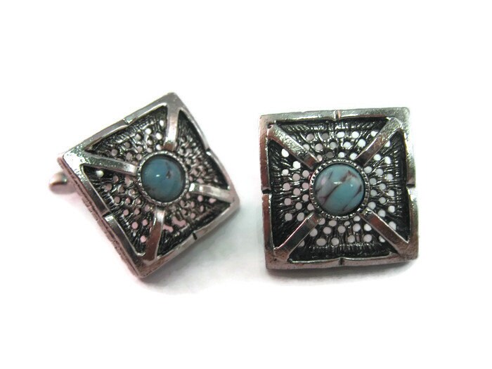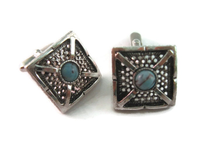 Vintage Cufflinks for Men: Nice Blue Center See Through Silver Tone Square Design