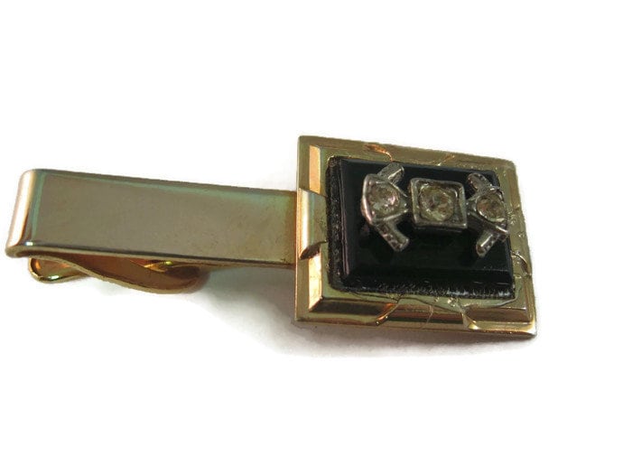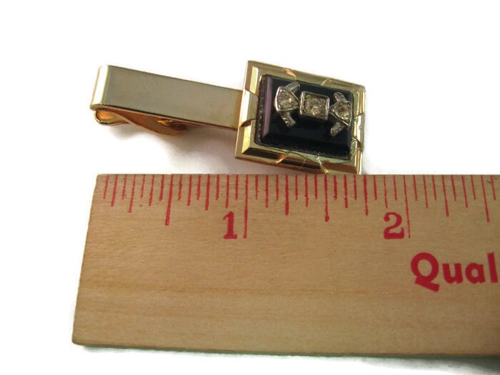 Vintage Men's Tie Bar Clip Jewelry: Black w/ Clear Jewels on Gold Tone (Glue Showing!)