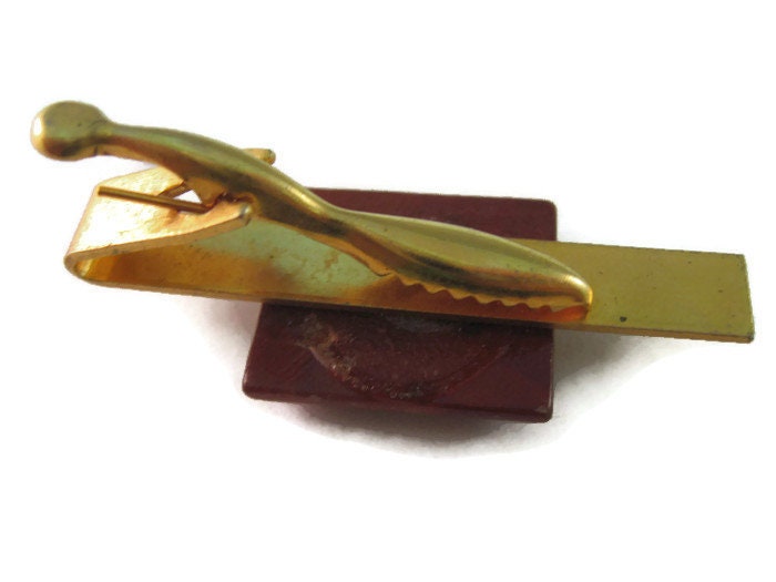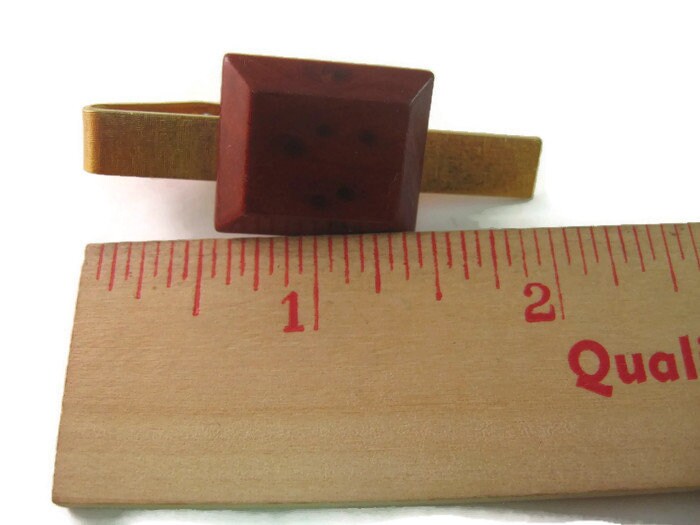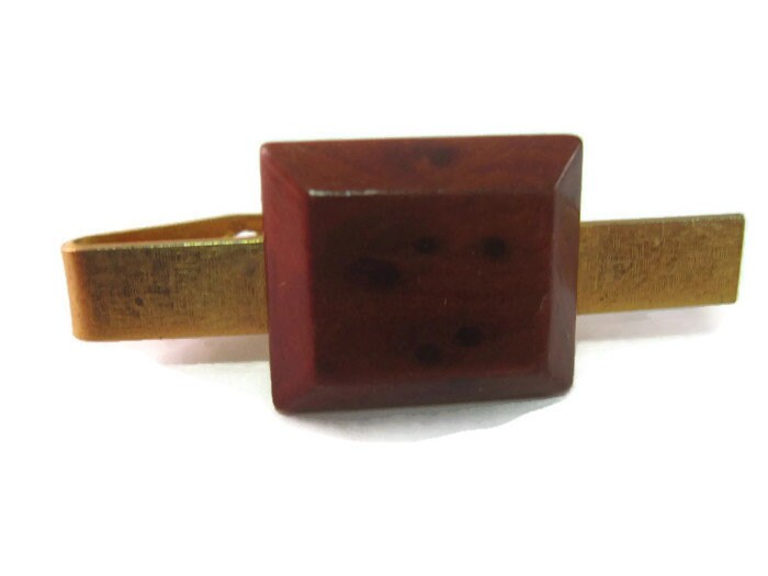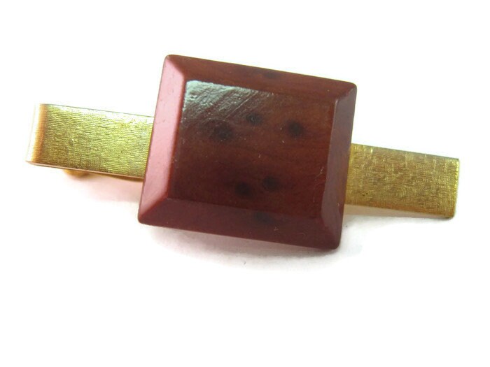 Vintage Men's Tie Bar Clip Jewelry: Beveled Square Wood Block Textured Gold Tone