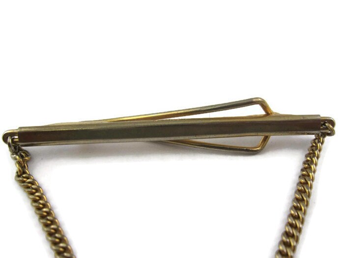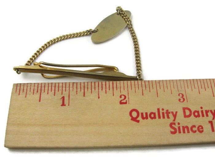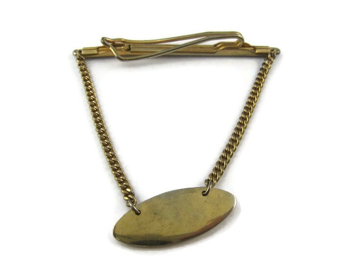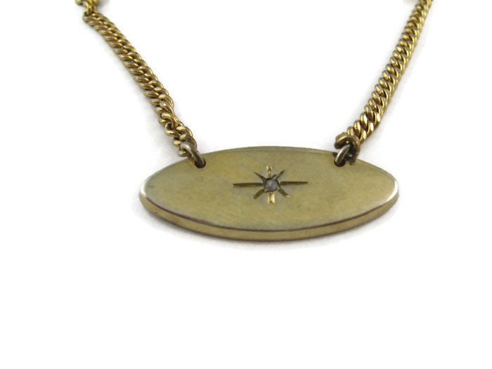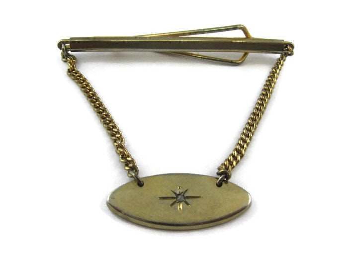 Vintage Tie Bar Clip: Clear Jewel Star Shine Design Oval Medallion Chain Gold Tone