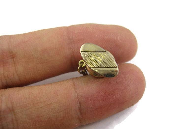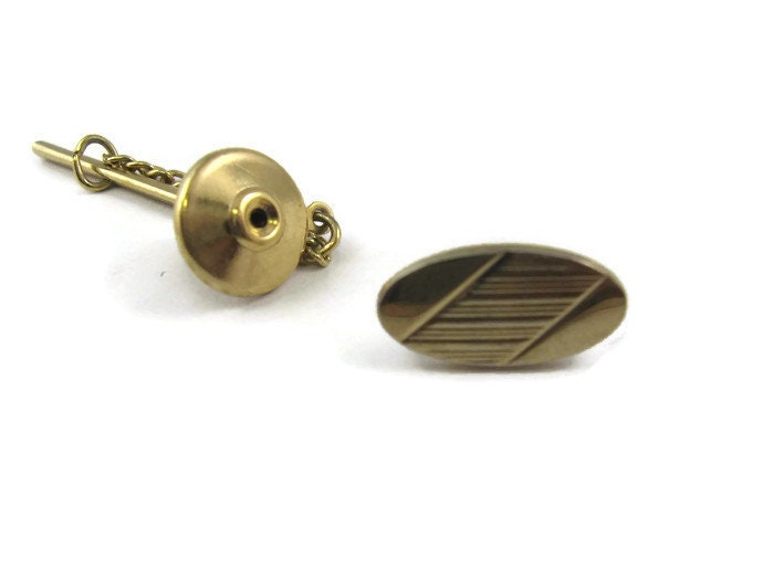 Vintage Tie Tack Tie Pin: Grooved Diagonal Stripe Center Elongated Oval Gold Tone