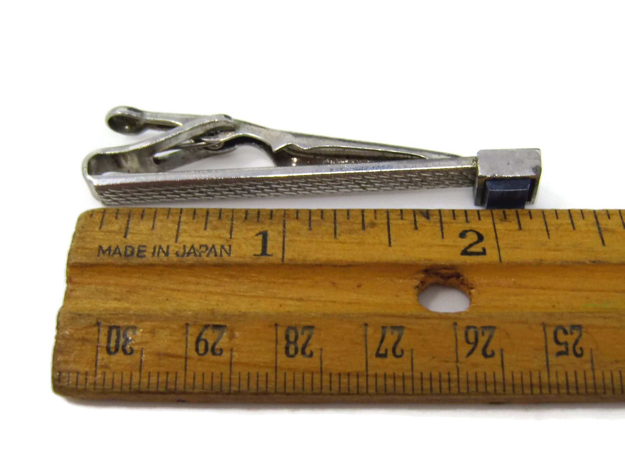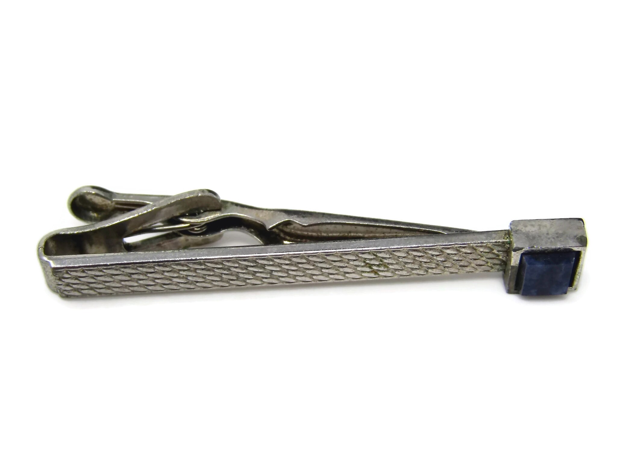 Vintage Tie Clip Tie Bar: Textured Silver Tone Body Blue Stone Accent