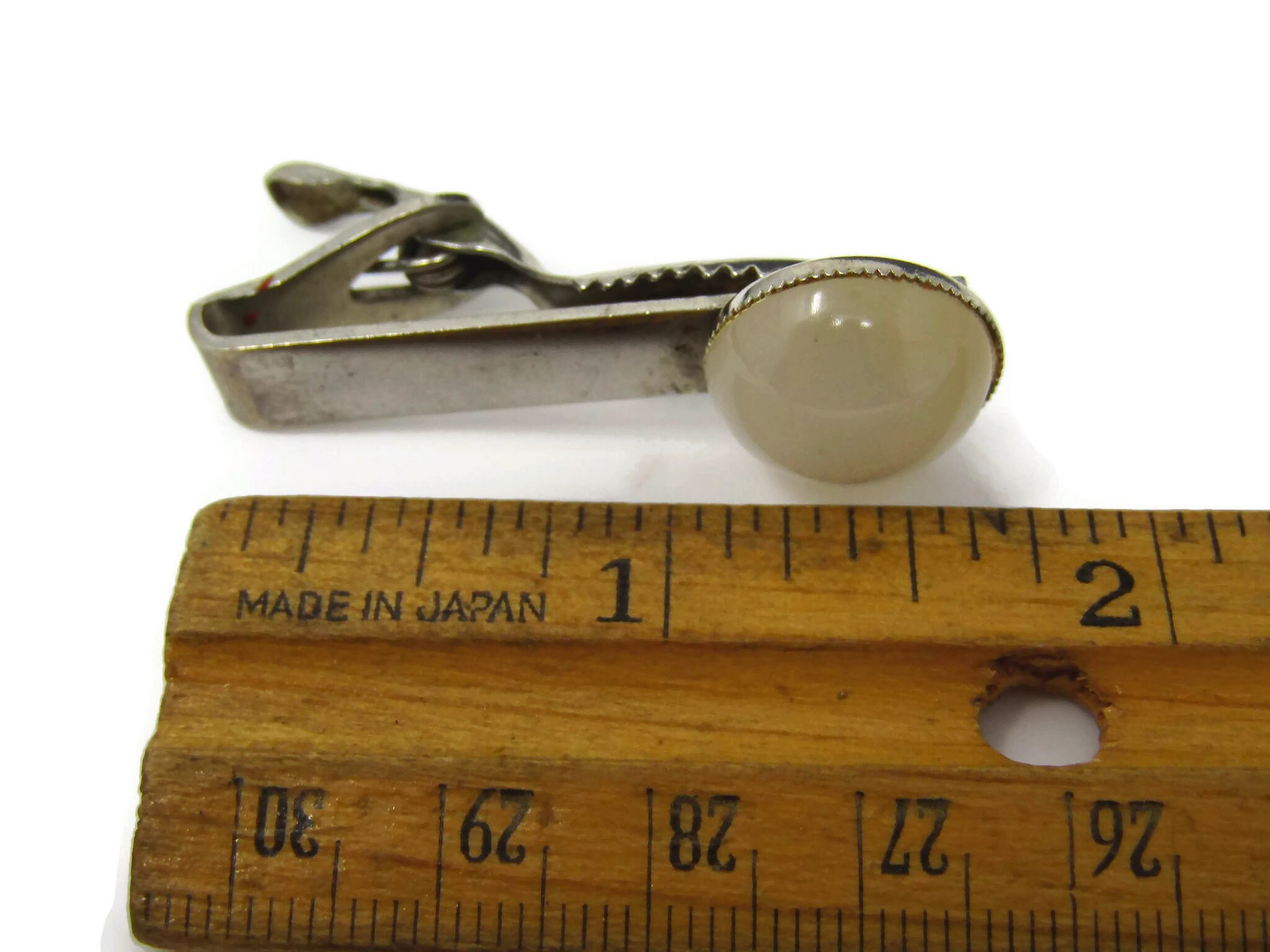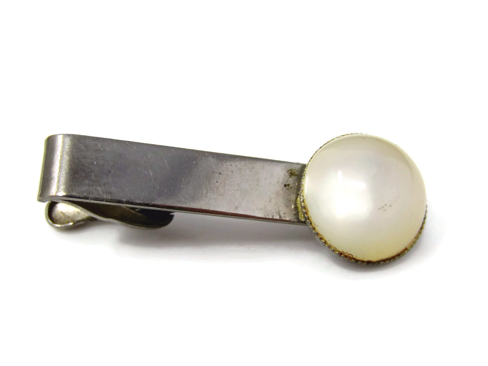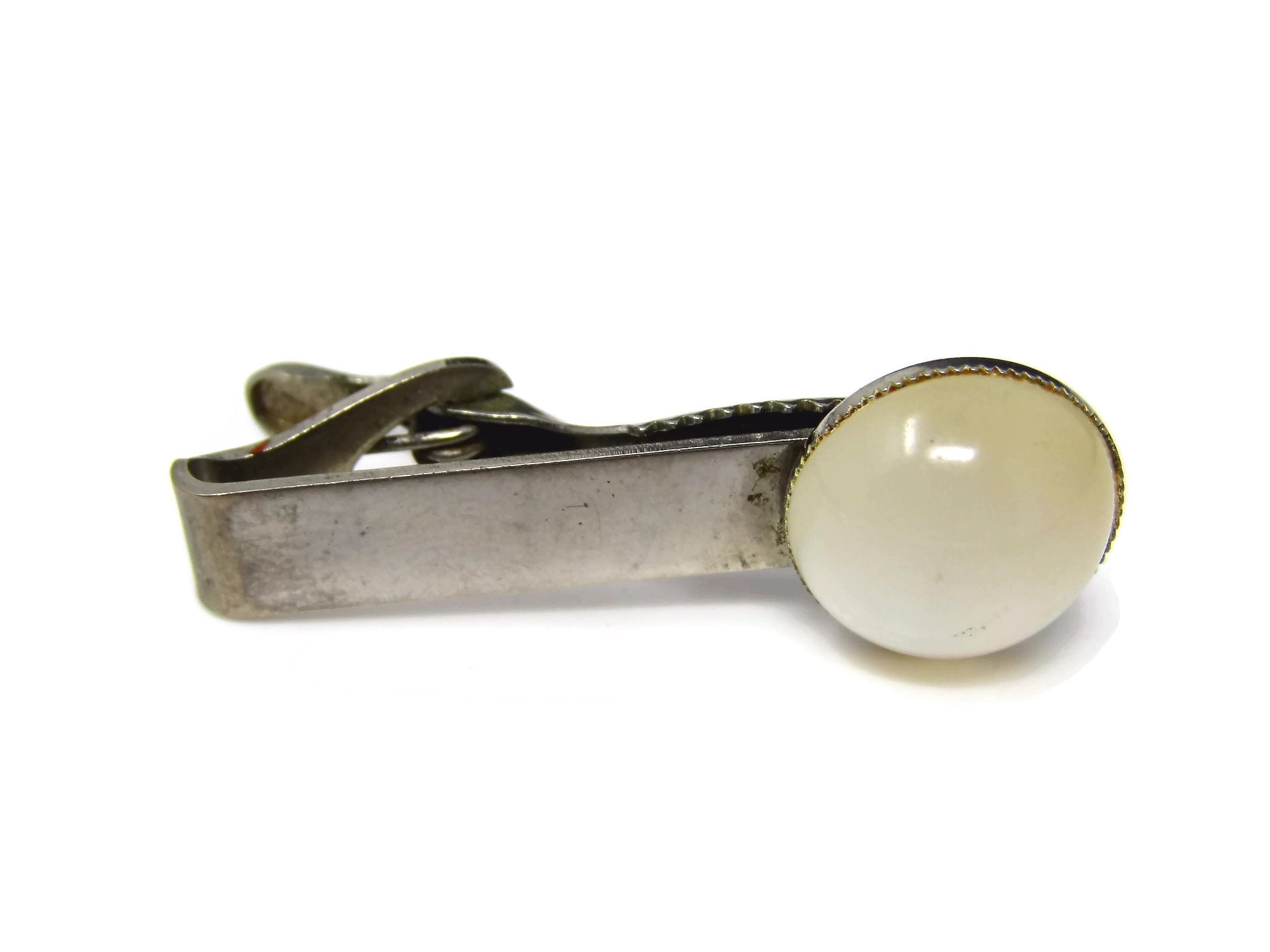 Vintage Tie Clip Tie Bar: Round Opalescent White Accent