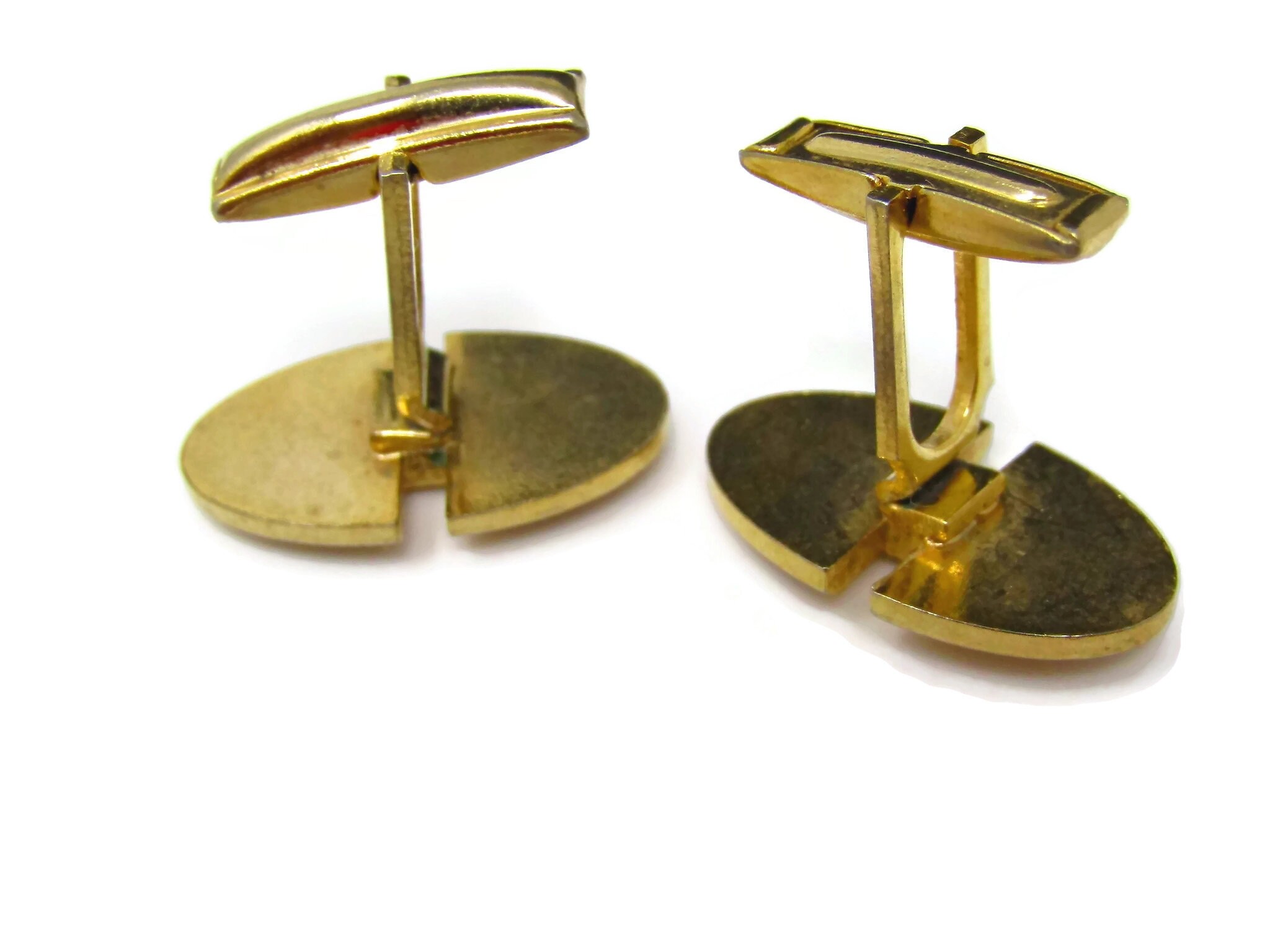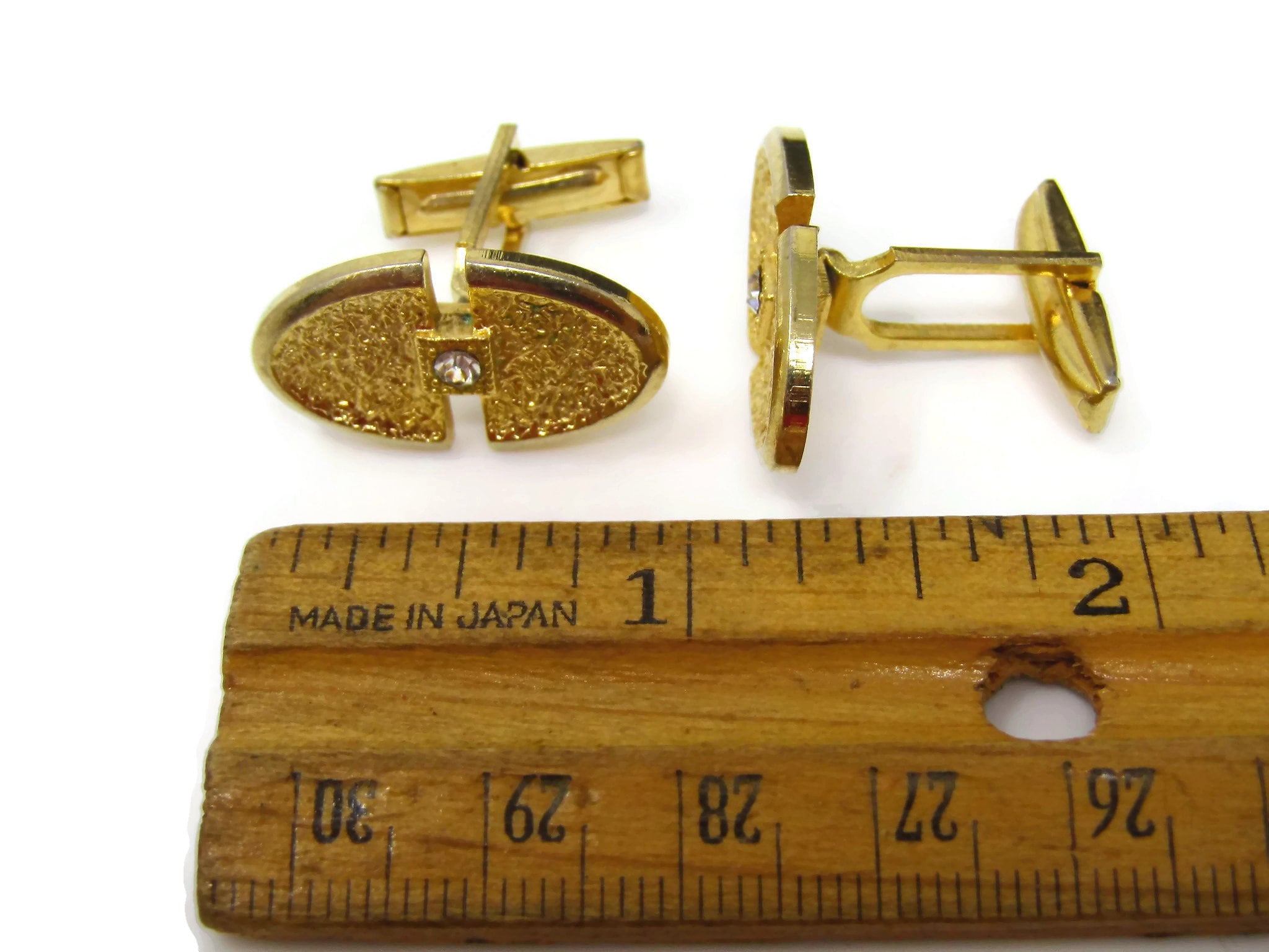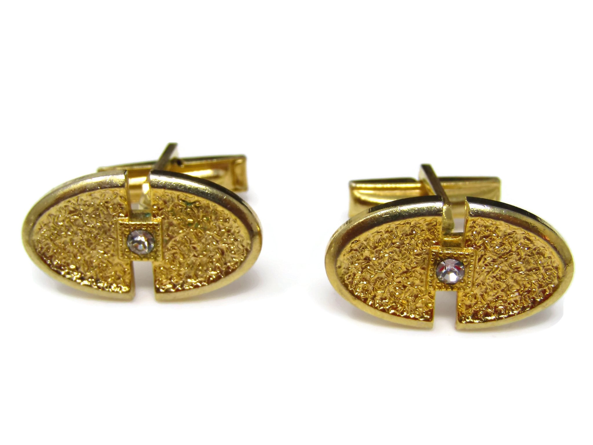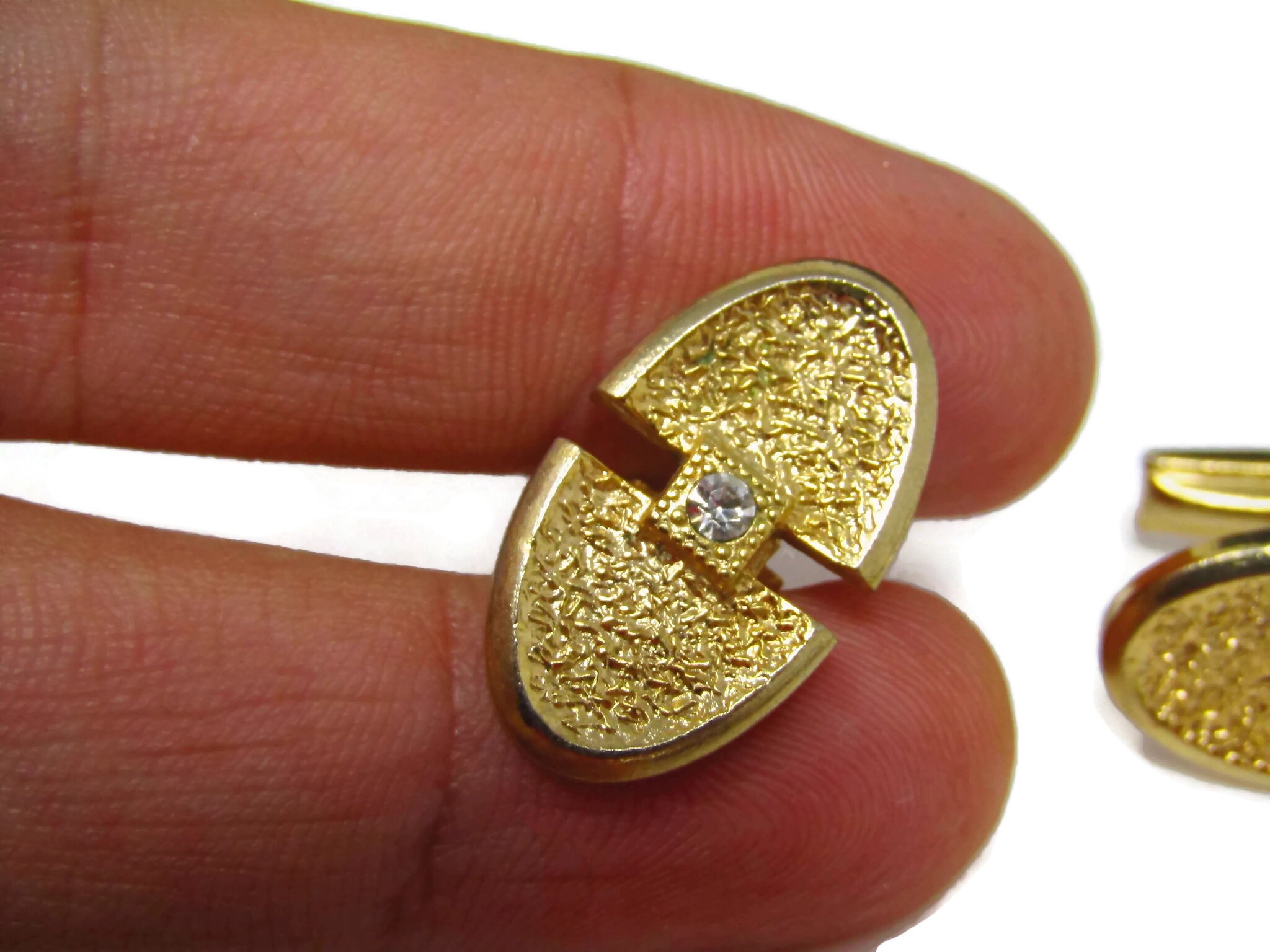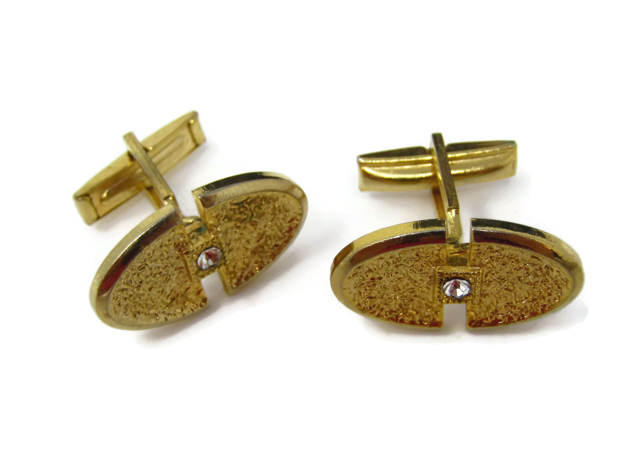 Vintage Cufflinks for Men: Modernist Textured Gold Tone Clear Jewel Center