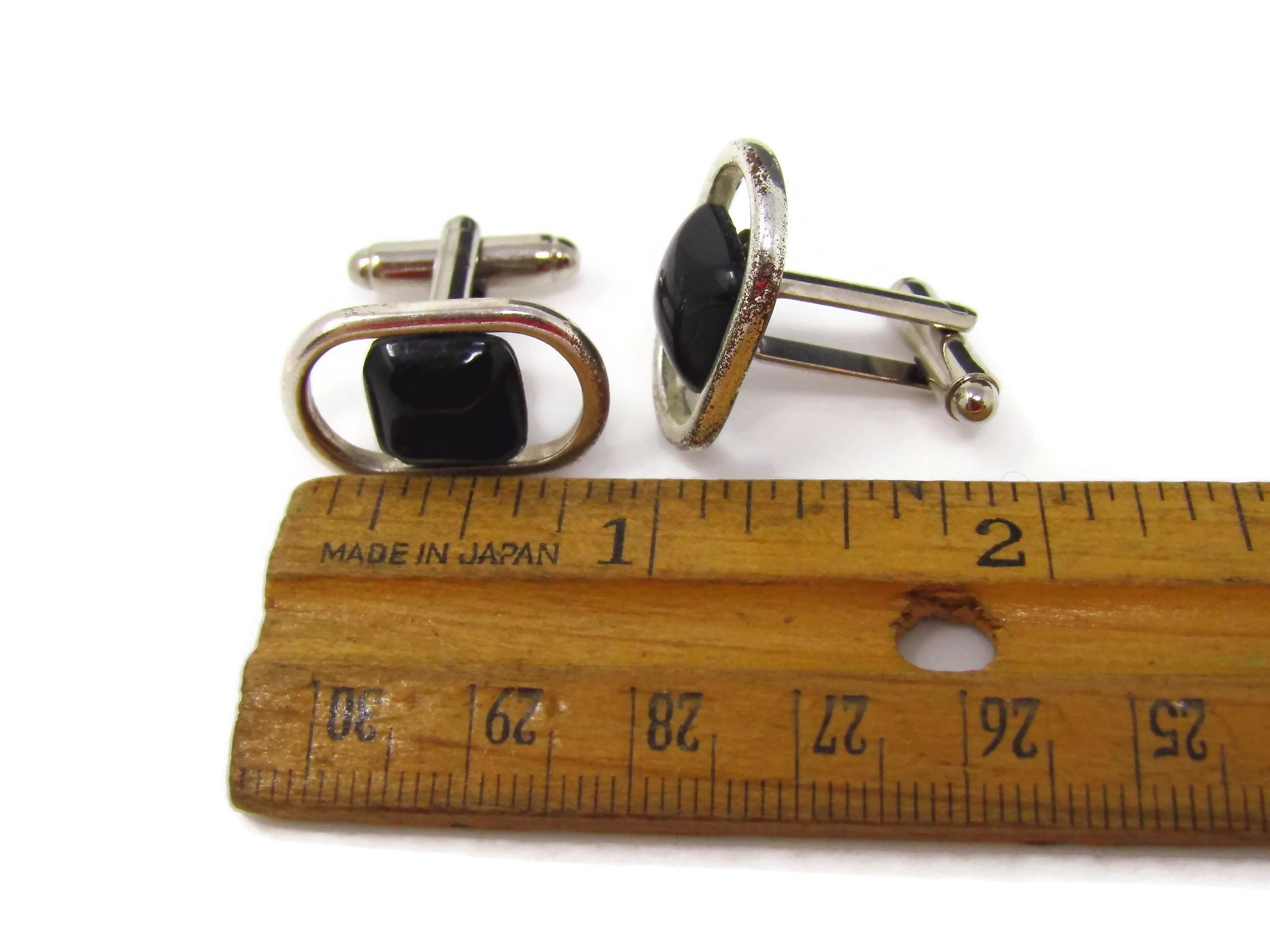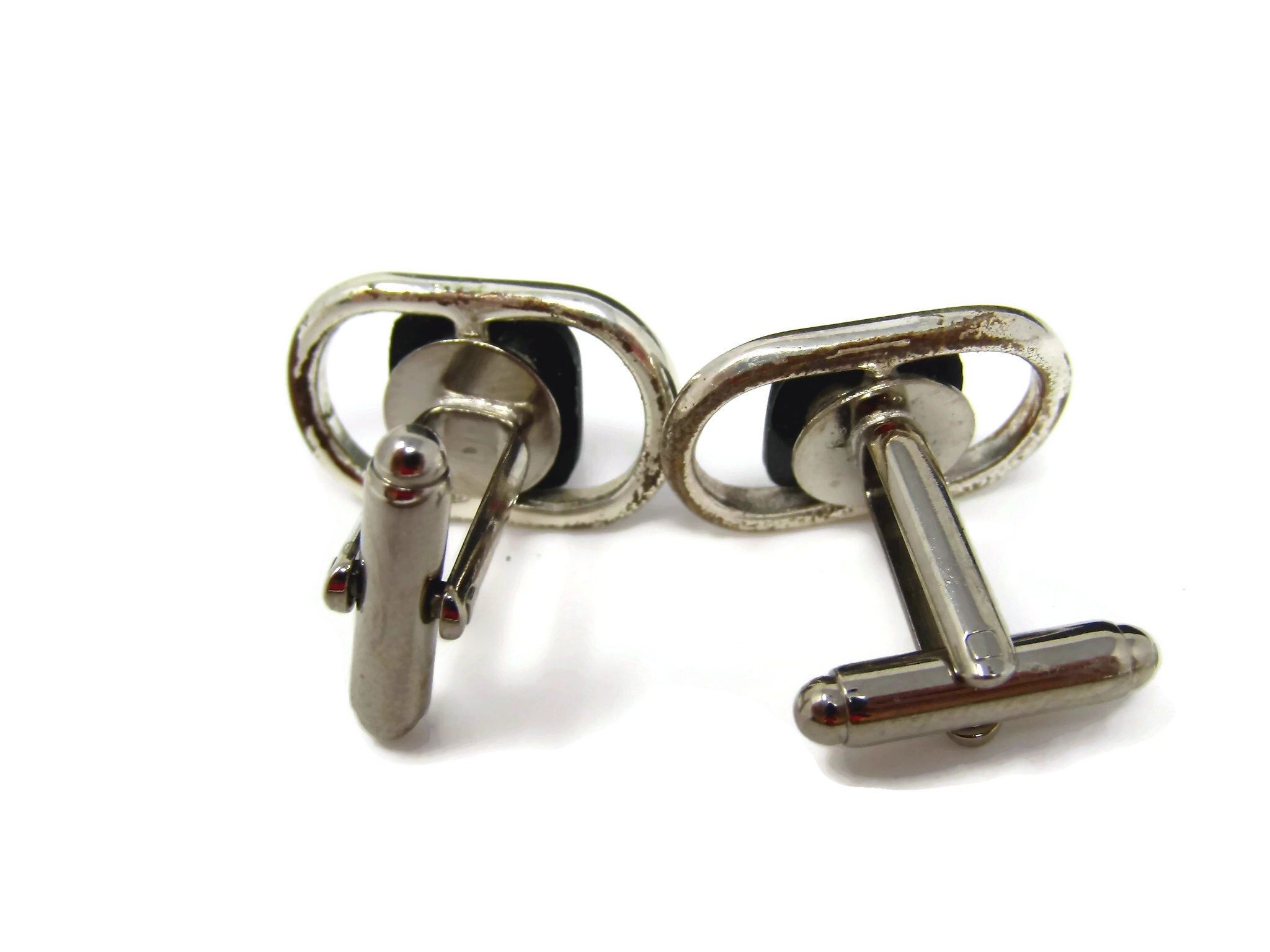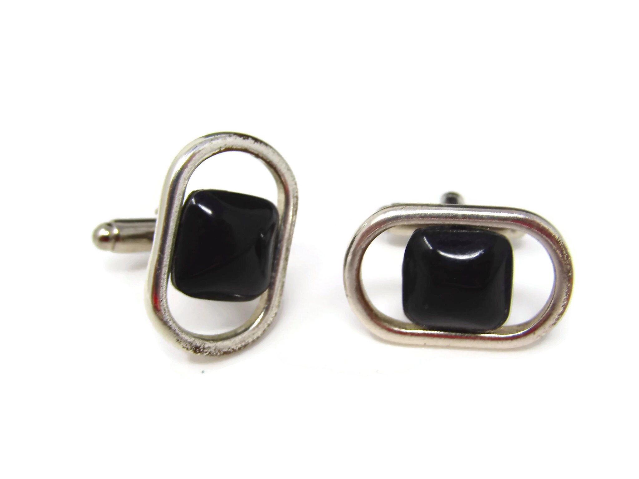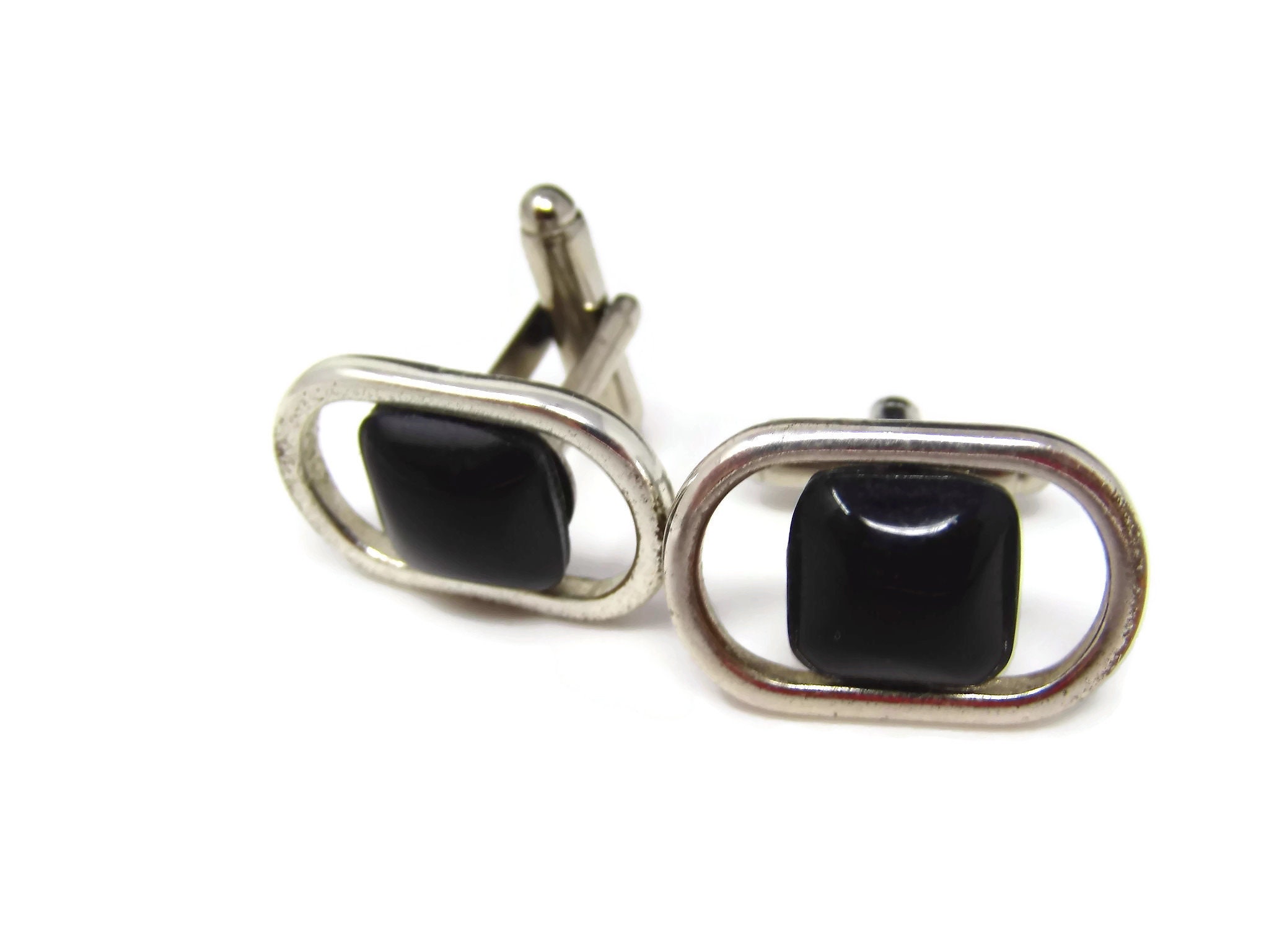 Vintage Cufflinks for Men: Modernist Black Center Open Design Silver Tone